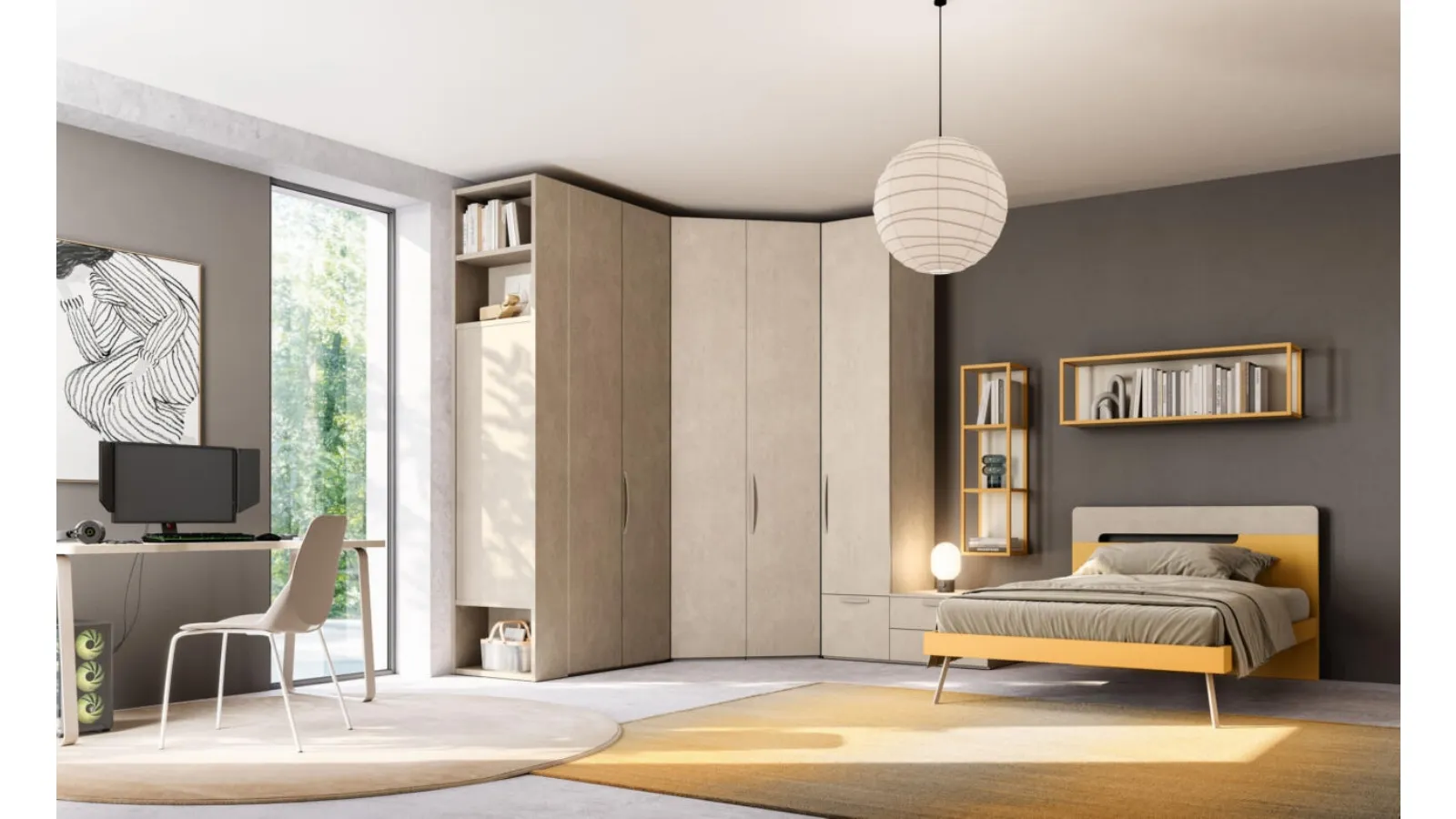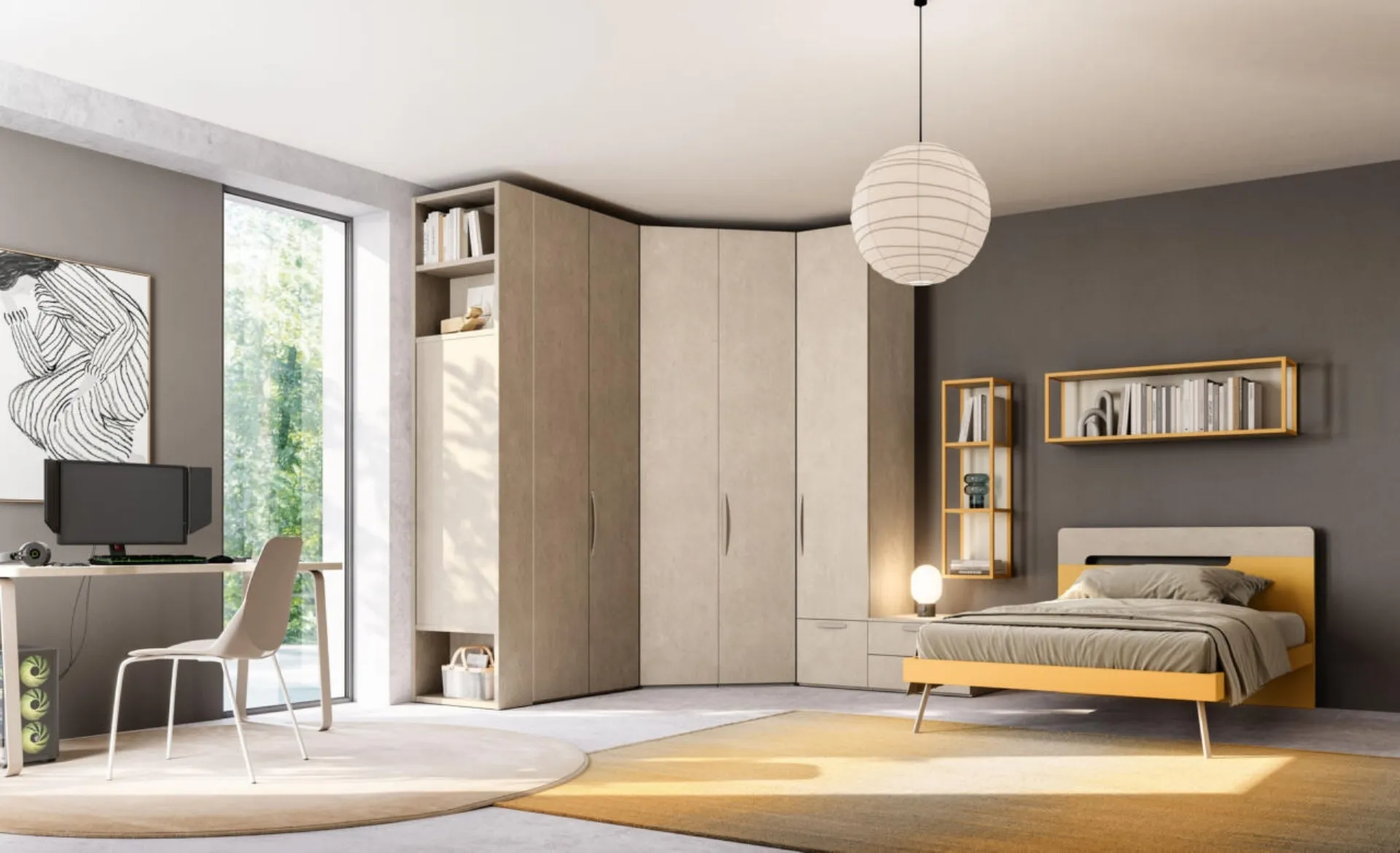 La Cameretta Letto a terra 08 di Mistral è una soluzione d'arredo ingegnosa, progettata per ottimizzare gli spazi dedicati a ragazzi e ragazze. Questa configurazione integra abilmente aree contenitive e superfici operative, delineando ambienti multifunzionali e completamente modulari. Il sistema Mistral è concepito per adattarsi dinamicamente alle diverse fasi di crescita, trasformando l'area ludica in uno spazio versatile per lo studio e le attività ricreative. La selezione accurata dei materiali e le finiture di pregio garantiscono durabilità e comfort, elementi fondamentali per un investimento a lungo termine nell'arredamento.
