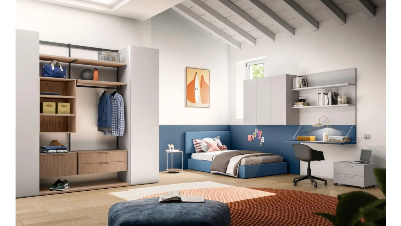 La Cameretta Letto a Terra 12 di Mistral è una soluzione progettata con attenzione, parte della collezione 'Letti a terra'. Il design integra un giroletto imbottito da 120 cm e pannelli a muro Fixo, ottimizzando lo spazio e l'estetica. La composizione include elementi funzionali come un tavolino Icaro, un armadio battente con anta Liscia e cabina Naked, e uno scrittoio sospeso con base. Le finiture disponibili, tra cui Noce, Velluto, Oltremare, Seta, e gli interni in Seta, offrono versatilità e resistenza. L'eccellenza dei materiali impiegati assicura prestazioni durature e un'esperienza d'uso superiore, riflettendo un impegno costante verso l'innovazione costruttiva.