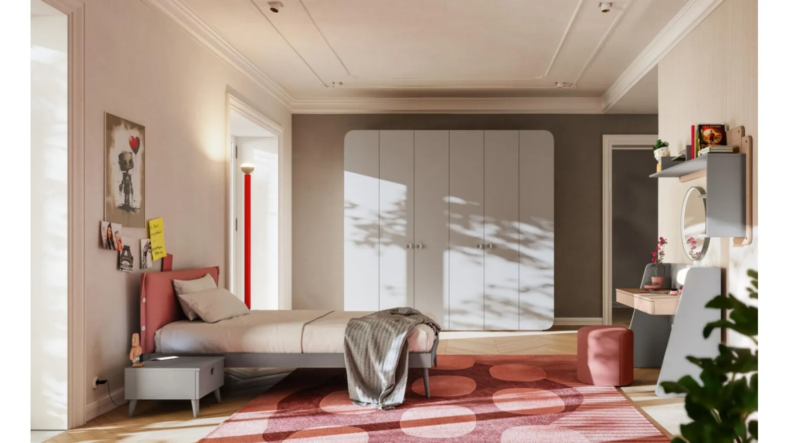 Cameretta Letto a Terra 13 di Mistral rappresenta una soluzione innovativa per la zona notte. Questa configurazione, parte della linea di soluzioni letto a pavimento, è studiata per ottimizzare lo spazio e offrire massima funzionalità. Il set si compone di un letto singolo modello One con testiera integrata (L.120), un capiente guardaroba ad ante battenti con frontali lineari e moduli terminali sagomati, una postazione studio Vanity completa di cassetto, uno specchio Makeup e un mobile contenitore Tuxon. La scelta dei materiali e la cura dei dettagli costruttivi sono prioritari. È possibile scegliere tra finiture contemporanee come Arena, Velluto, Grigio e il codice DA25, pensate per integrarsi armoniosamente in diversi contesti stilistici. La flessibilità progettuale e l'attenzione ai dettagli tecnici garantiscono un'ottimizzazione degli spazi e una durabilità nel tempo.