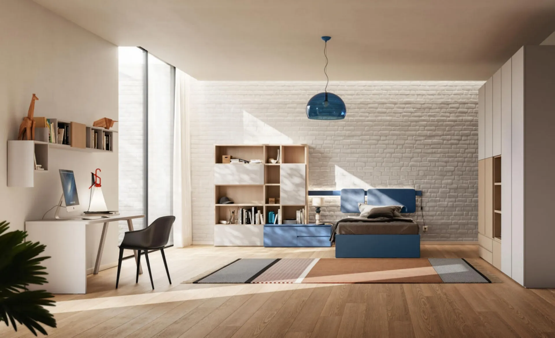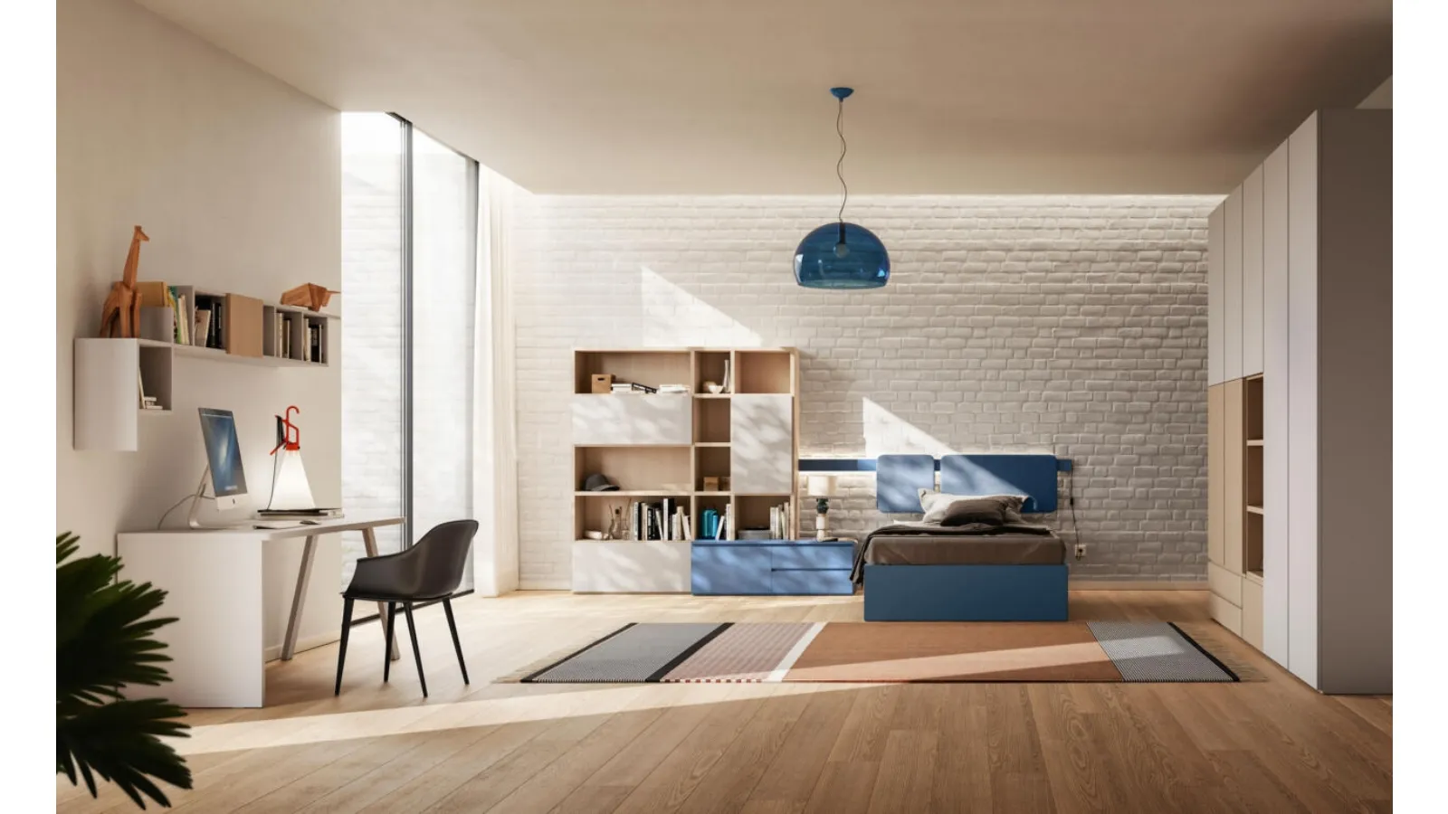 This melamine proposal perfectly combines the practical qualities and aesthetic value of the children's room, as it is capable of combining ergonomics and safety. In the furnishing of the room for young ones entrusted to us: in our store, we present all the most original modern compositions for their room. Mistral offers a wide range of customisable accessory elements: you will find a bed, wardrobe, work table, chairs, and bookshelves. Bring aesthetics and vibrant colors into the room dedicated to the little ones with this solution, one of Mistral's modular bedrooms for boys. If you are looking for creative ideas to decorate your children's room perfectly, we present the Composition Bed on the Ground 20 by Mistral with a melamine finish.