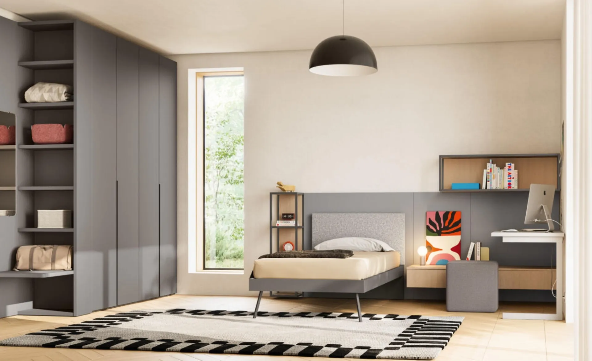 La Cameretta Letto a Terra 24 di Mistral è una proposta d'arredo sofisticata, pensata per ottimizzare gli spazi dedicati a bambini e ragazzi con soluzioni contemporanee e altamente funzionali. Questa composizione si distingue per il suo design moderno e la notevole flessibilità compositiva, che permette di valorizzare ogni angolo dell'ambiente. È costruita con materiali di alta qualità come il laminato e il melaminico, disponibili in un'ampia varietà di finiture e colori per una personalizzazione profonda. Gli elementi inclusi, quali una cabina armadio, un armadio terminale, un divano letto con pratici cassetti estraibili, uno scrittoio ergonomico e colonne libreria sospese, contribuiscono a creare un ambiente accogliente, organizzato e stimolante. Il sistema modulare avanzato garantisce una personalizzazione sartoriale e un'adattabilità impeccabile a ogni esigenza spaziale.