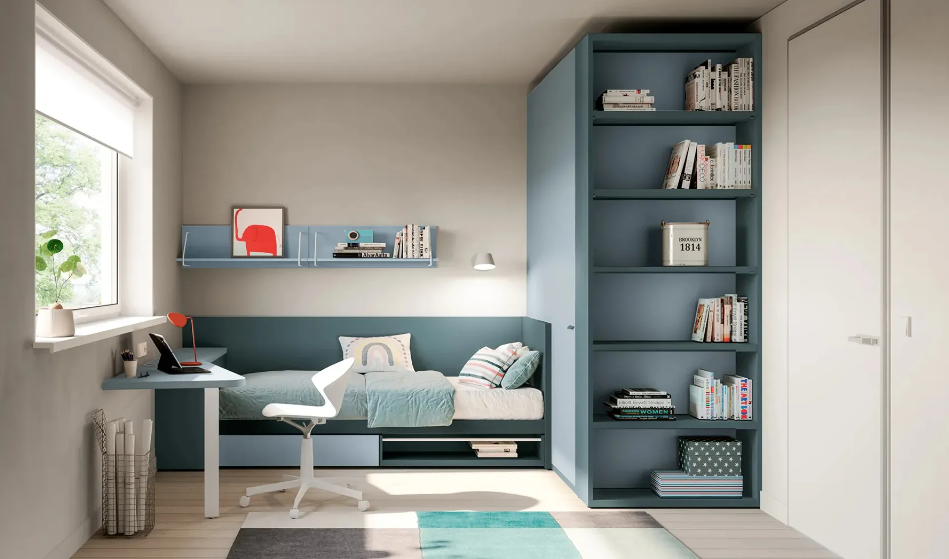 Doimo Cityline offers a rich catalog of customizable accessory elements to compose: you will find bed, wardrobe, work table, chairs, and bookcases. This proposal in matte lacquer enhances the practical qualities and aesthetic value of the children's room, as it is capable of combining functionality and ergonomics. If you are looking for creative ideas to decorate your children's room optimally, we present the Cameretta Layout 09B by Doimo Cityline with a matte lacquer finish. Bring design and vibrant colors into the children's room with this proposal, one of the space-saving bedrooms for boys by Doimo Cityline. Trust us in designing the children's room: in our store, we present all the most original modern compositions for their bedroom.