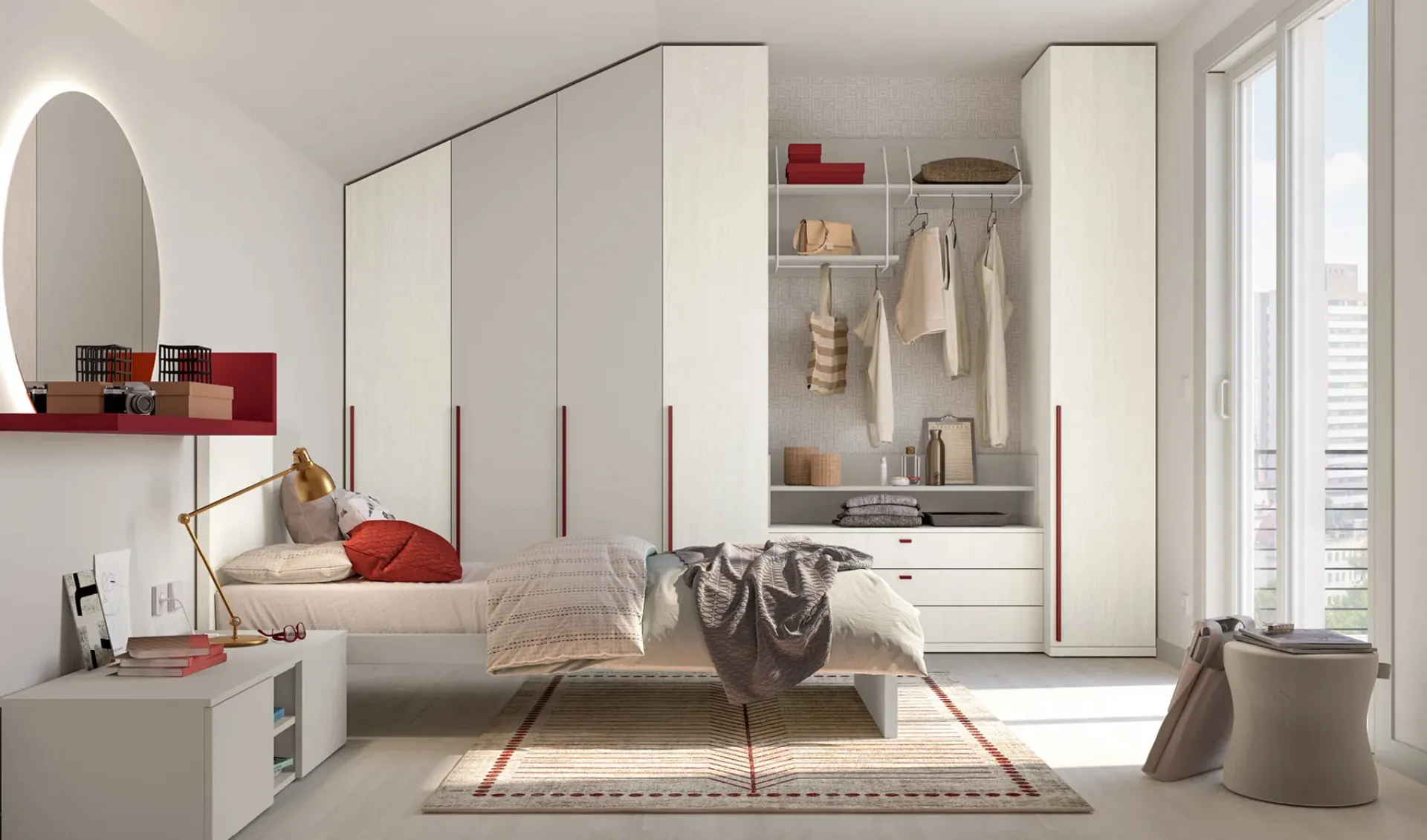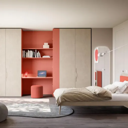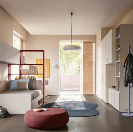 If you are looking for creative ideas to decorate your children's room, we present to you the Layout 10A Bedroom by Doimo Cityline with a melamine finish. Doimo Cityline offers a wide range of accessories to be customized: you will find a bed, wardrobe or walk-in closet, desk, chairs, and bookshelves. Bring aesthetic content and vibrant colors into the children's room with this solution, one of the custom-made bedrooms for boys by Doimo Cityline. This proposal in melamine enhances the functionality and aesthetics of the bedroom, as it is capable of combining functionality and ergonomics. Trust us for furnishing the young ones' room: in our showroom, we present all the most exclusive modern furnishing compositions for their room.