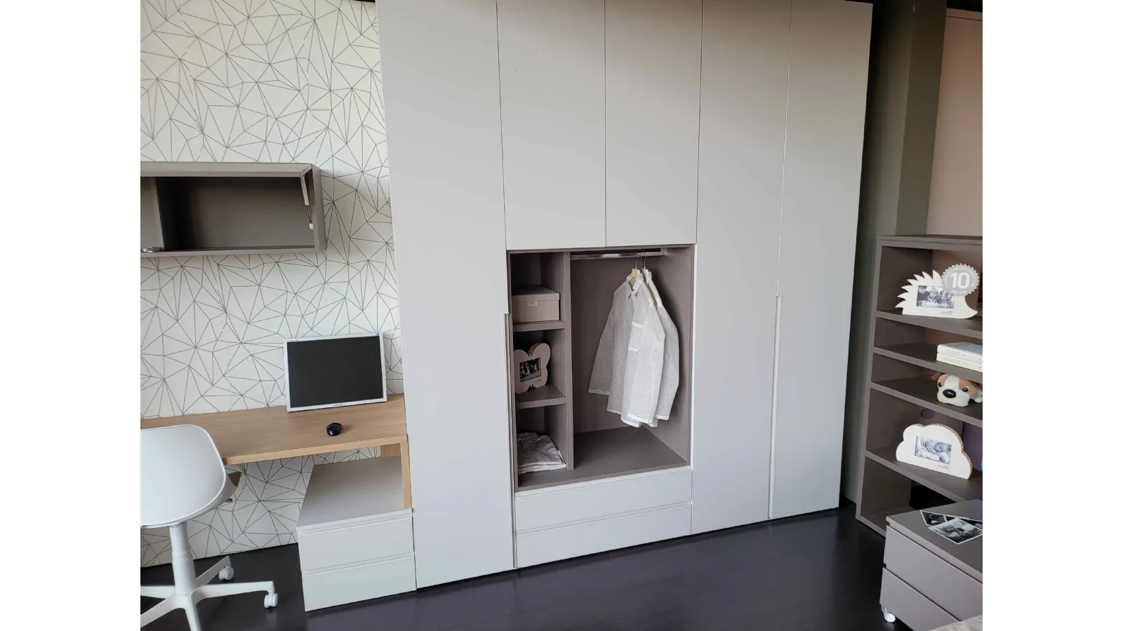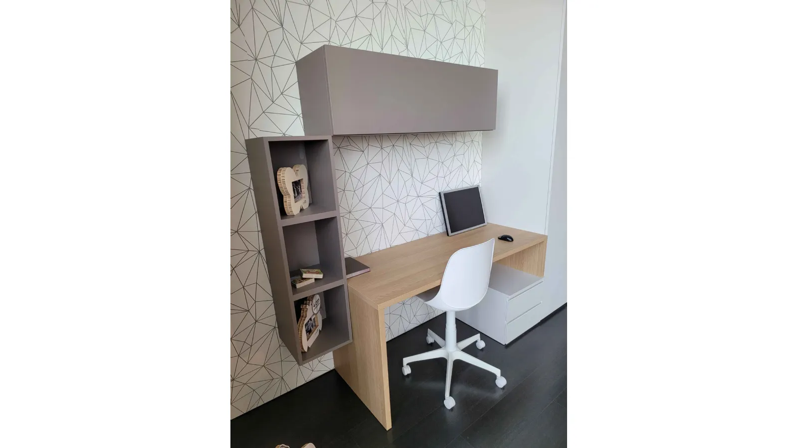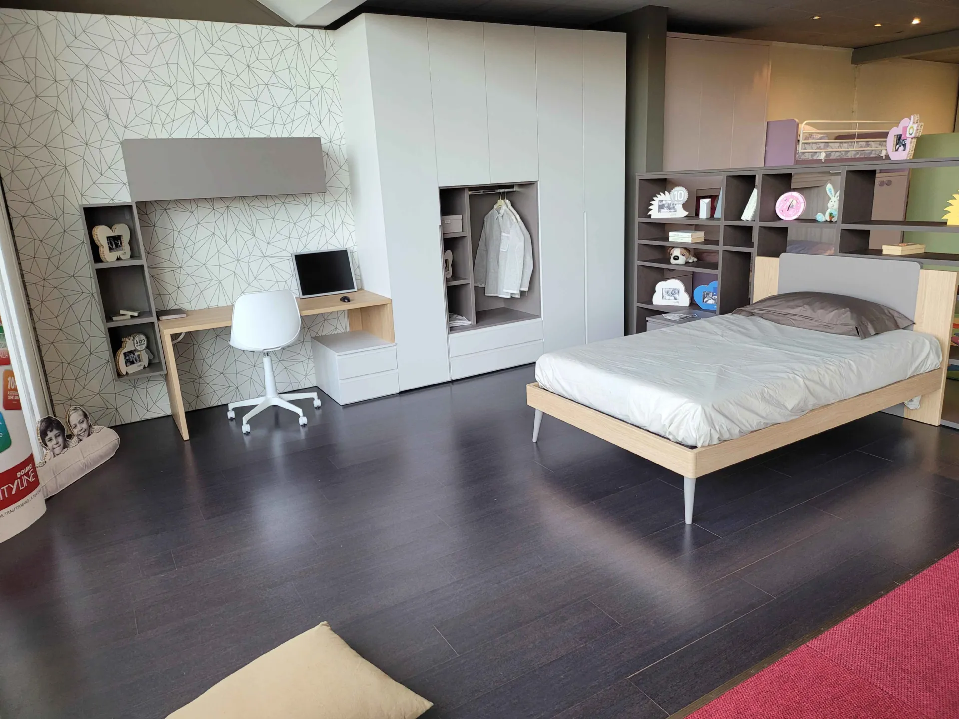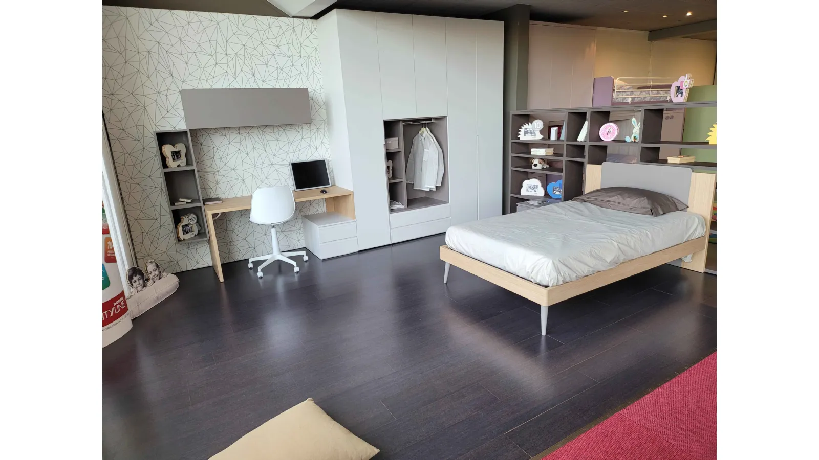 This little room è ideal for those who want to furnish their bedroom in a definitive way thanks to its colors and elegant and functional style. The bed from a half square è suitable for every need. E& # 39; in oak finish with oak and dark gray headboard, supported by high and comfortable feet for easy cleaning of the lower part of the bed. The size of the bed è of cm L.129xP.203,6. At the side of the bed è present a comfortable two-drawer bedside table with wheels, easy to move to the desired position. Behind the bed we have a comfortable double-sided bookcase (NOT INCLUDED IN THE PRICE), to store school books in an extremely tidy way. A valid solution to always have them at hand. L& # 39; capacious wardrobe with five doors present in the composition measures cm L.225xP.60xH.260. L& # 39; opening of the doors è very practical and comfortable thanks to the groove handle in the same color. In the central part of the wardrobe è there is an open module with shelves and a hanger tube, useful for storing everyday clothes and everyday objects such as folders and books. Internally è equipped with five clothes hanger tubes and two external drawers. On the side è present the study area where there is a large and practical desk measuring cm L.150 supported by solid and sturdy wooden legs. On the side è there is an open wall unit with shelves and a wall unit with flap door, practical and containing. Under the desk è present the chest of drawers with two drawers with opening by means of a groove handle in order to have everything at hand and with maximum order. È Also included is the chair with wheels shown in the photo. The composition measures cm L.465xP.330 and è You can make any changes in order to better adapt the various elements in the space available. The finishes present in the composition are Silk, Platinum, Bronze and Oak.