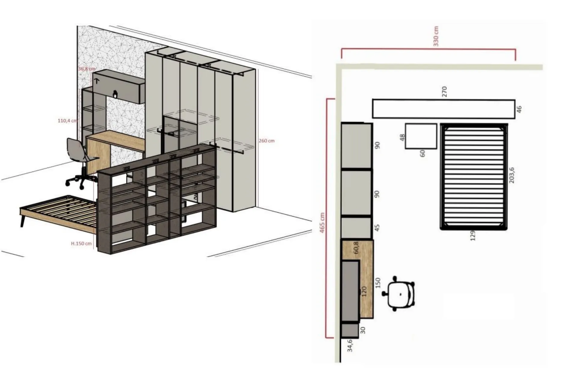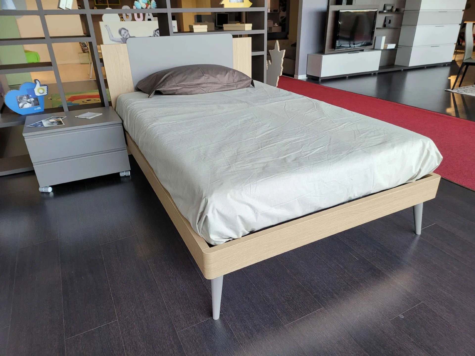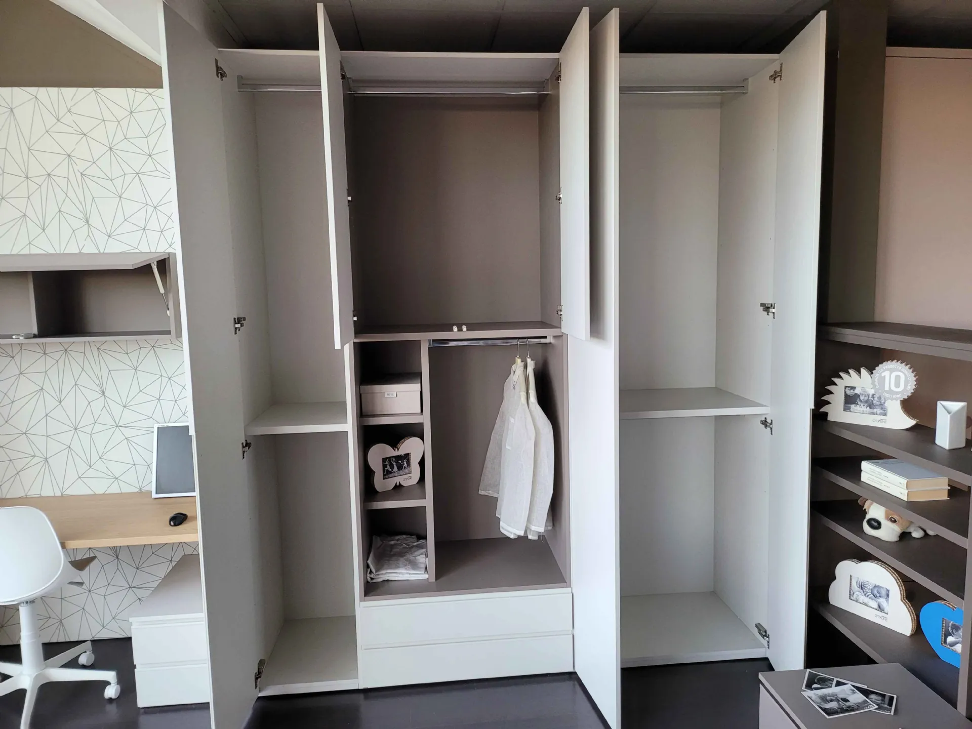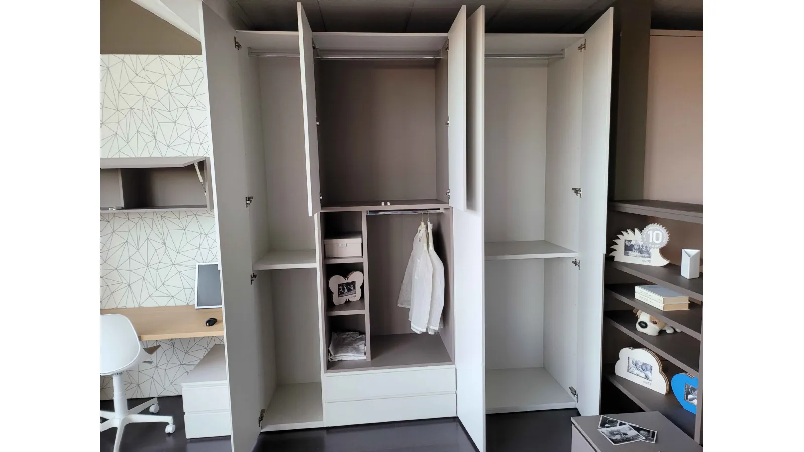This little room è ideal for those who want to furnish their bedroom in a definitive way thanks to its colors and elegant and functional style. The bed from a half square è suitable for every need. E& # 39; in oak finish with oak and dark gray headboard, supported by high and comfortable feet for easy cleaning of the lower part of the bed. The size of the bed è of cm L.129xP.203,6. At the side of the bed è present a comfortable two-drawer bedside table with wheels, easy to move to the desired position. Behind the bed we have a comfortable double-sided bookcase (NOT INCLUDED IN THE PRICE), to store school books in an extremely tidy way. A valid solution to always have them at hand. L& # 39; capacious wardrobe with five doors present in the composition measures cm L.225xP.60xH.260. L& # 39; opening of the doors è very practical and comfortable thanks to the groove handle in the same color. In the central part of the wardrobe è there is an open module with shelves and a hanger tube, useful for storing everyday clothes and everyday objects such as folders and books. Internally è equipped with five clothes hanger tubes and two external drawers. On the side è present the study area where there is a large and practical desk measuring cm L.150 supported by solid and sturdy wooden legs. On the side è there is an open wall unit with shelves and a wall unit with flap door, practical and containing. Under the desk è present the chest of drawers with two drawers with opening by means of a groove handle in order to have everything at hand and with maximum order. È Also included is the chair with wheels shown in the photo. The composition measures cm L.465xP.330 and è You can make any changes in order to better adapt the various elements in the space available. The finishes present in the composition are Silk, Platinum, Bronze and Oak.