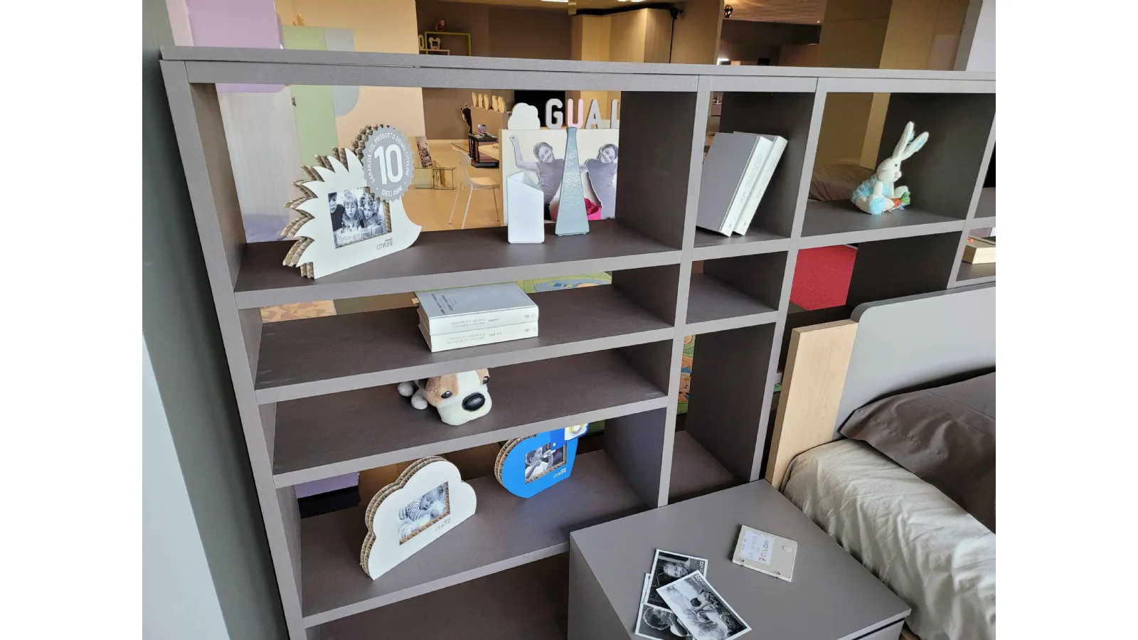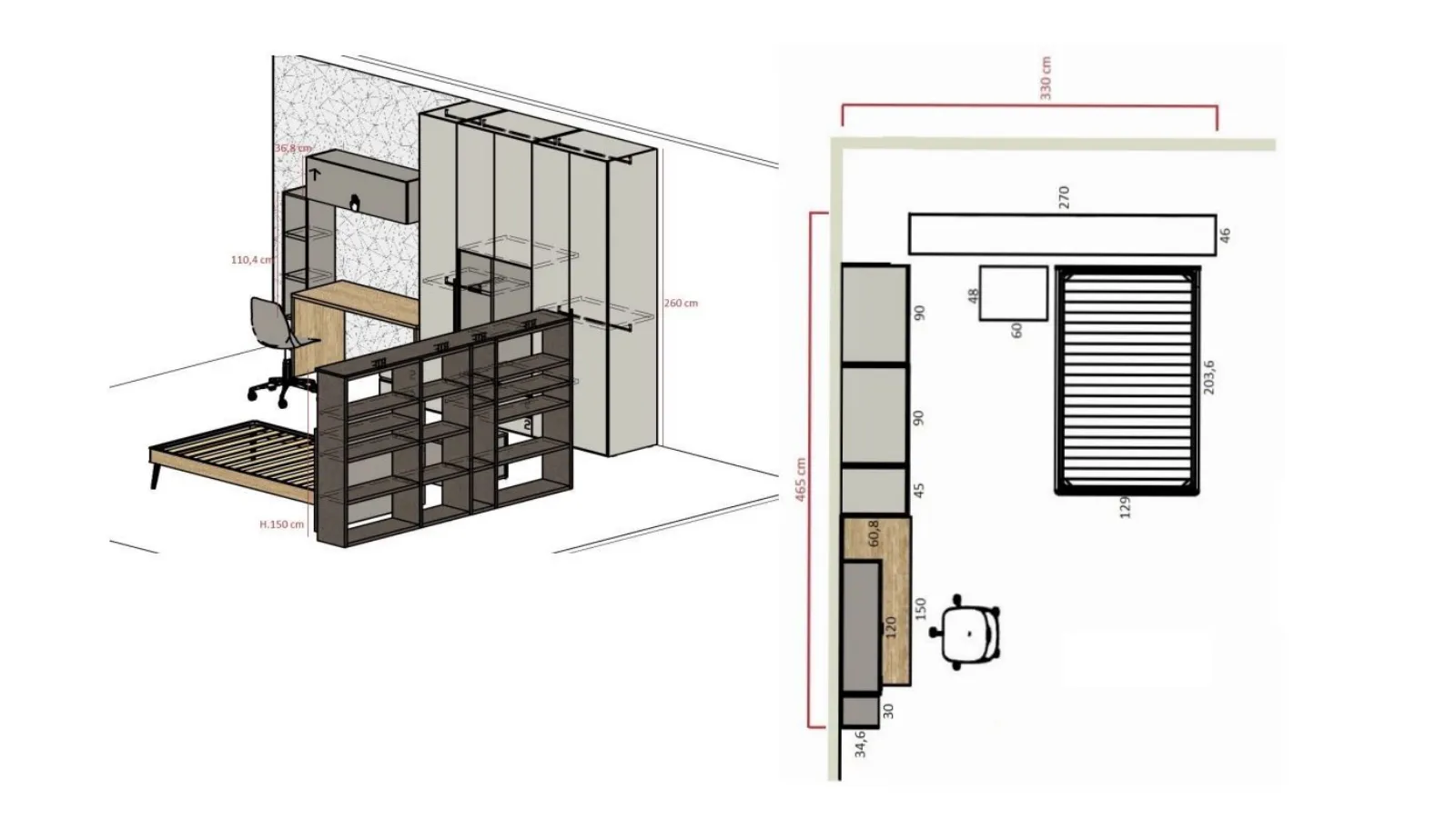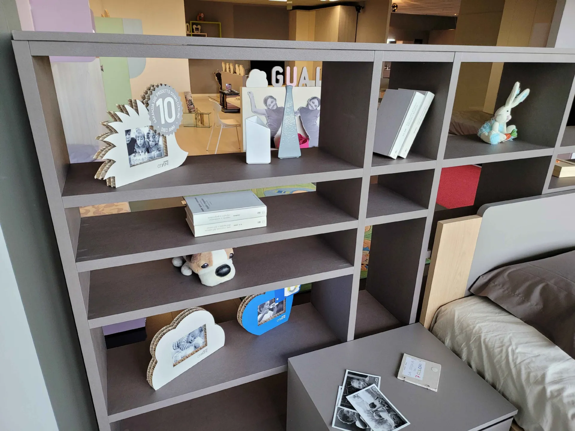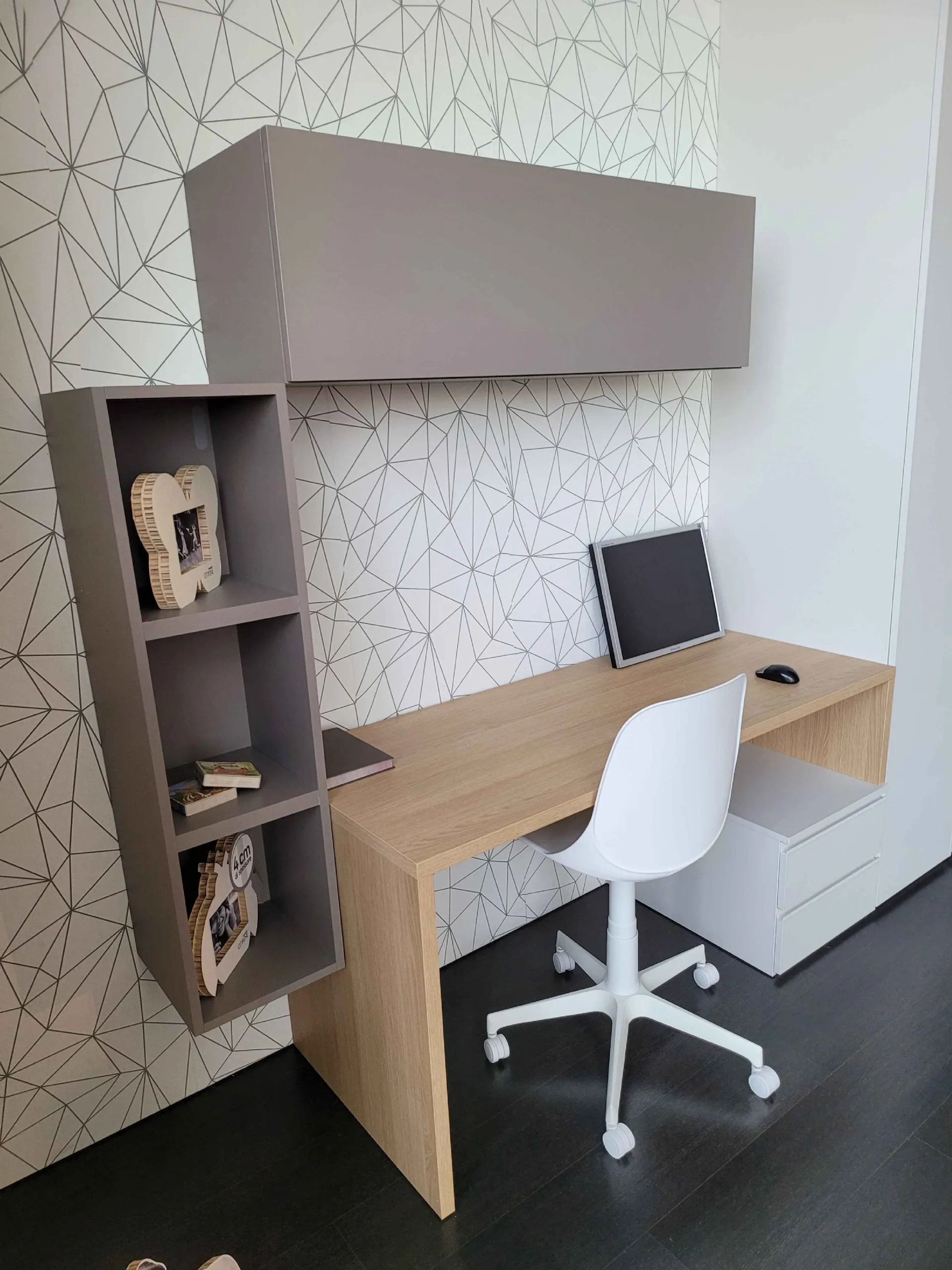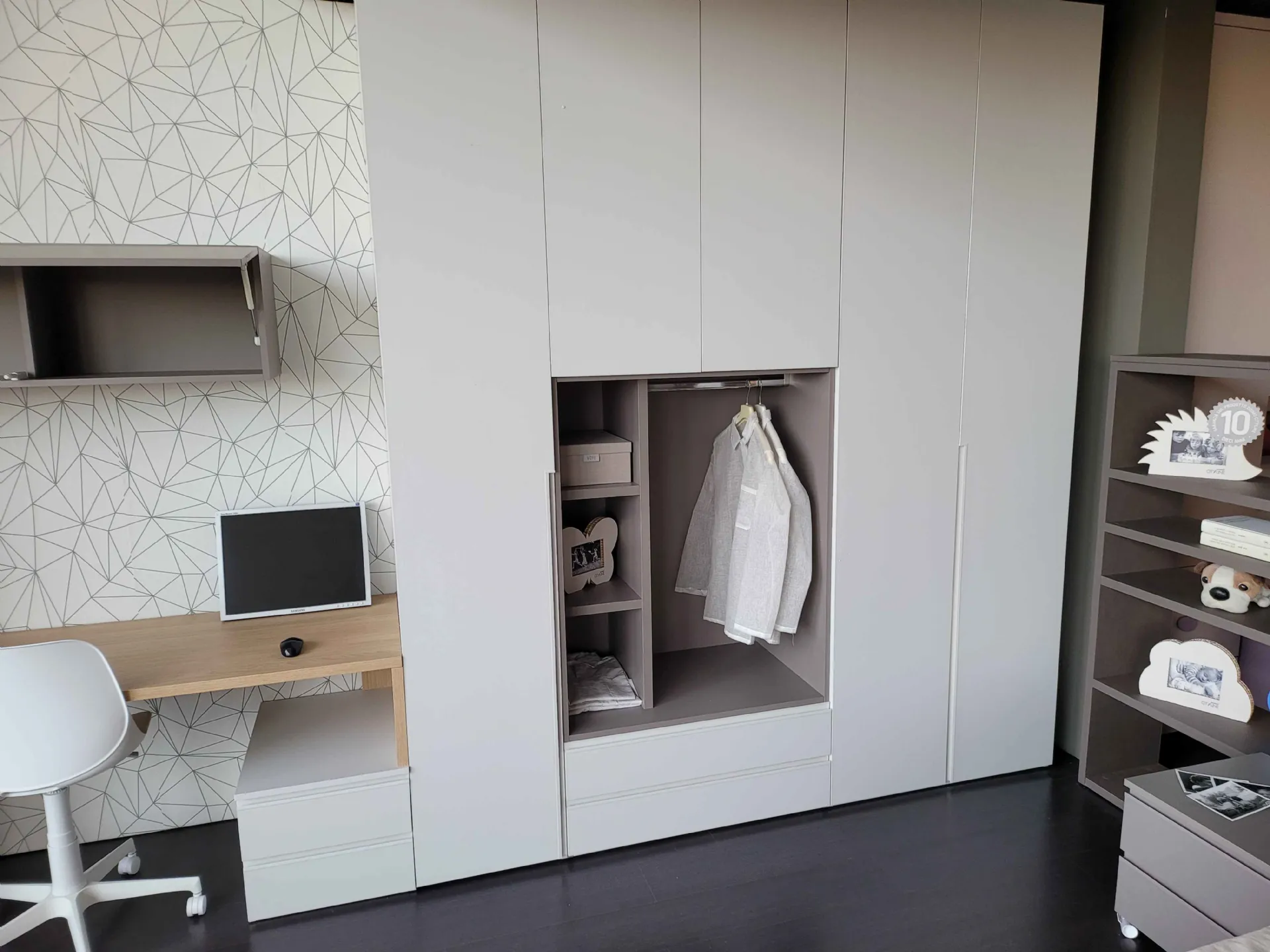 This little room è ideal for those who want to furnish their bedroom in a definitive way thanks to its colors and elegant and functional style. The bed from a half square è suitable for every need. E& # 39; in oak finish with oak and dark gray headboard, supported by high and comfortable feet for easy cleaning of the lower part of the bed. The size of the bed è of cm L.129xP.203,6. At the side of the bed è present a comfortable two-drawer bedside table with wheels, easy to move to the desired position. Behind the bed we have a comfortable double-sided bookcase (NOT INCLUDED IN THE PRICE), to store school books in an extremely tidy way. A valid solution to always have them at hand. L& # 39; capacious wardrobe with five doors present in the composition measures cm L.225xP.60xH.260. L& # 39; opening of the doors è very practical and comfortable thanks to the groove handle in the same color. In the central part of the wardrobe è there is an open module with shelves and a hanger tube, useful for storing everyday clothes and everyday objects such as folders and books. Internally è equipped with five clothes hanger tubes and two external drawers. On the side è present the study area where there is a large and practical desk measuring cm L.150 supported by solid and sturdy wooden legs. On the side è there is an open wall unit with shelves and a wall unit with flap door, practical and containing. Under the desk è present the chest of drawers with two drawers with opening by means of a groove handle in order to have everything at hand and with maximum order. È Also included is the chair with wheels shown in the photo. The composition measures cm L.465xP.330 and è You can make any changes in order to better adapt the various elements in the space available. The finishes present in the composition are Silk, Platinum, Bronze and Oak.