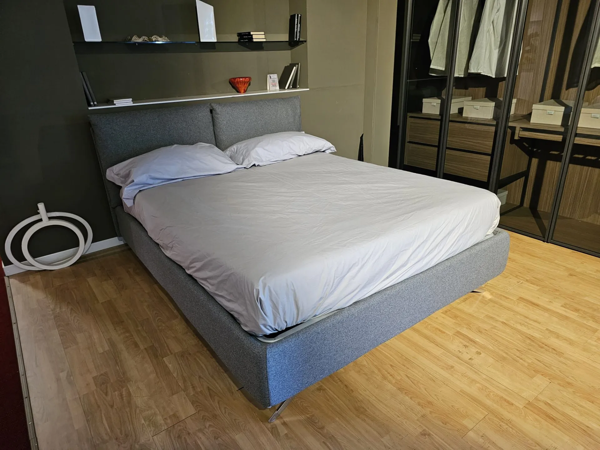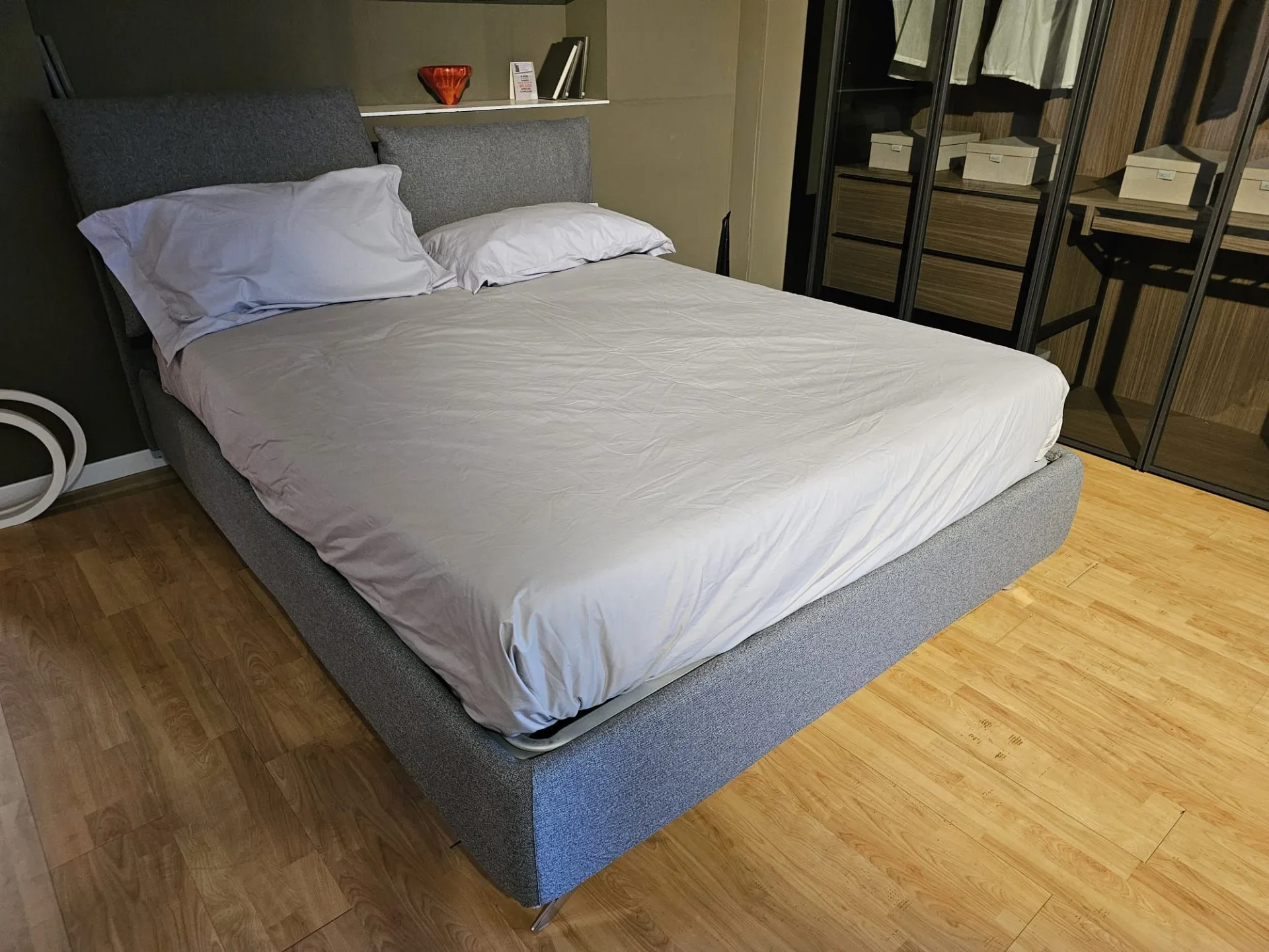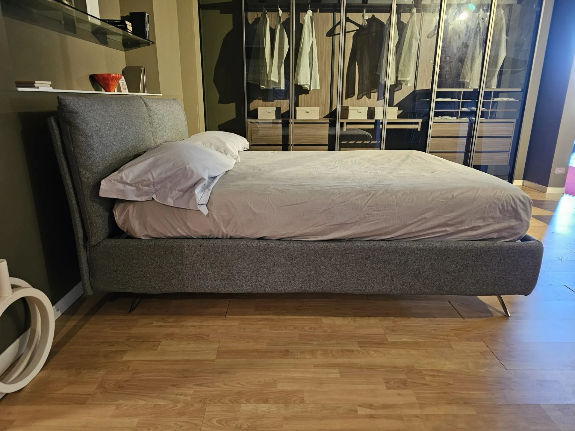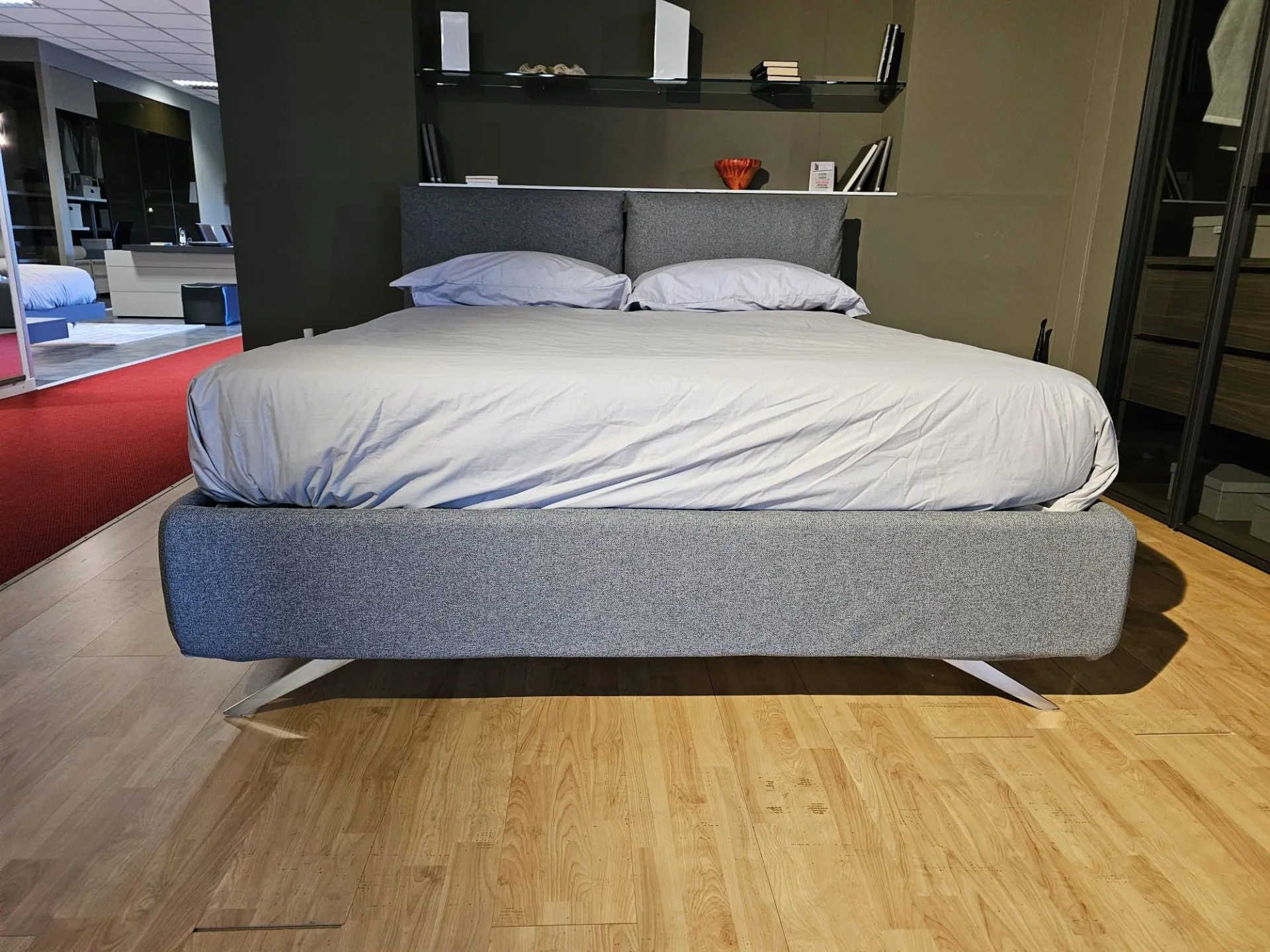Double bed Tempur model FIVE, slatted frame Double with Comfort opening, size 160x200 cm, footboard with chrome finish mod. Moody with 15 cm height, covering in fabric art. Penelope color 23. The bed measures 179x230x103 cm. Product on display and available for immediate delivery. Contact us for more information.