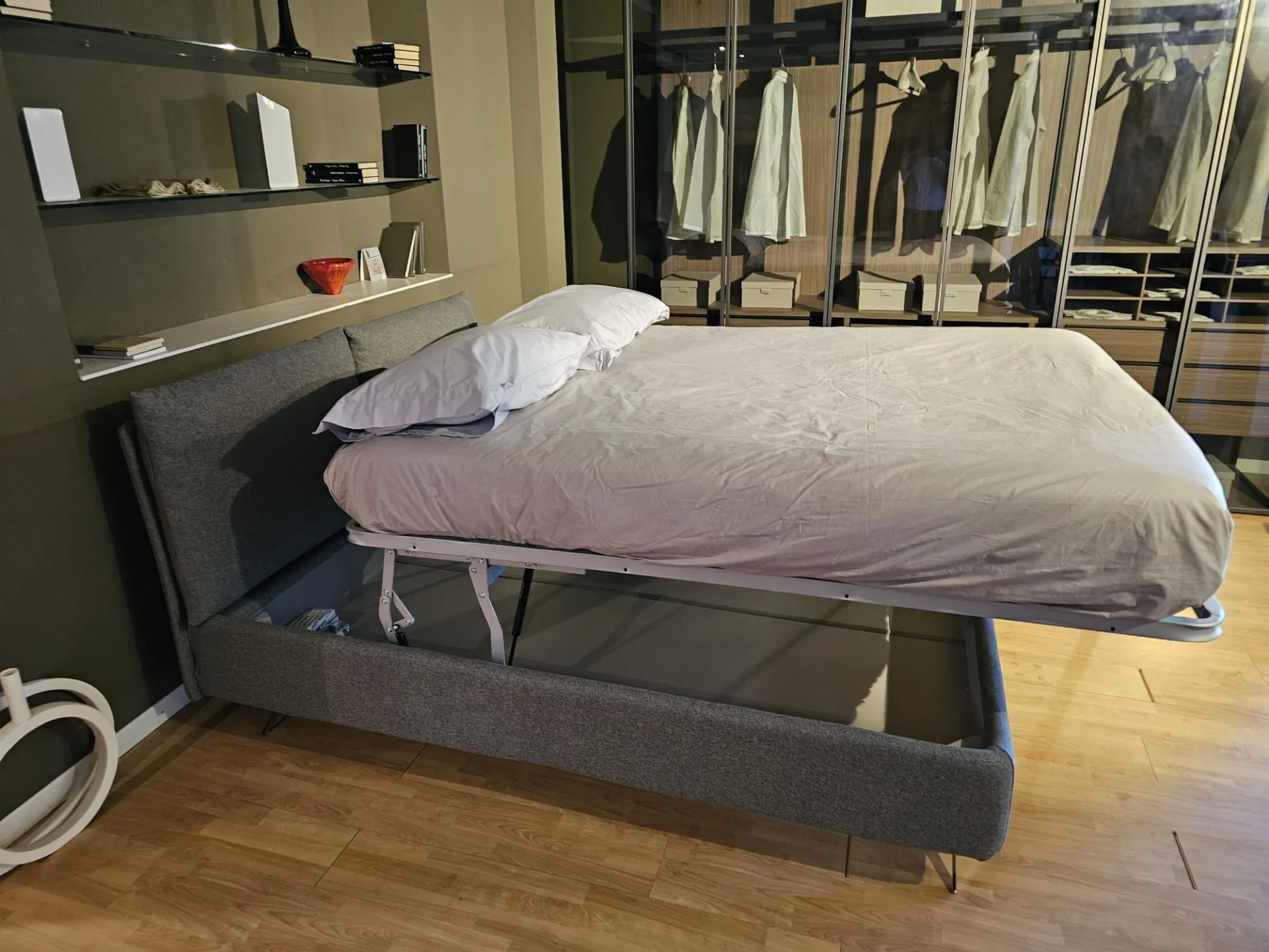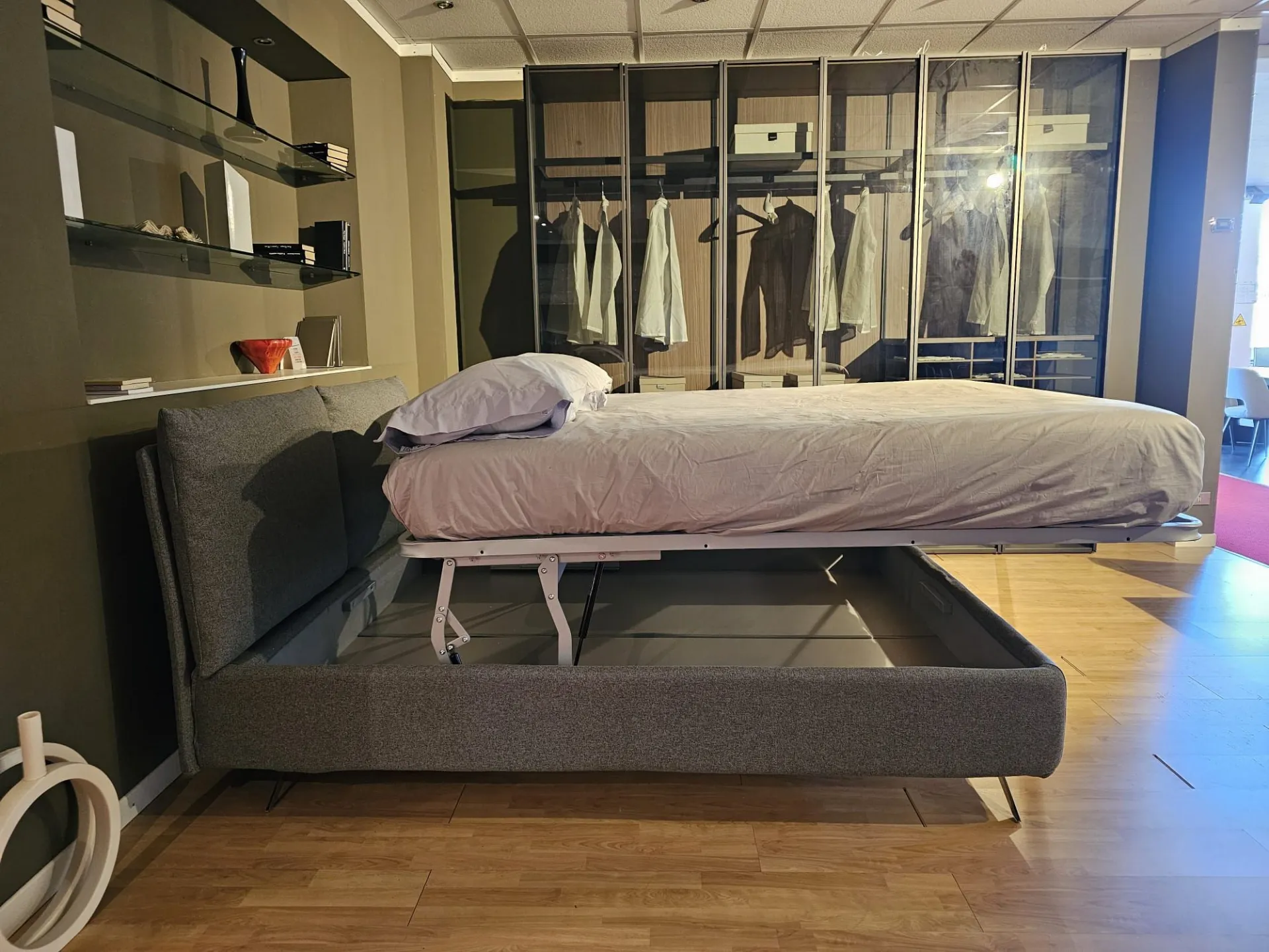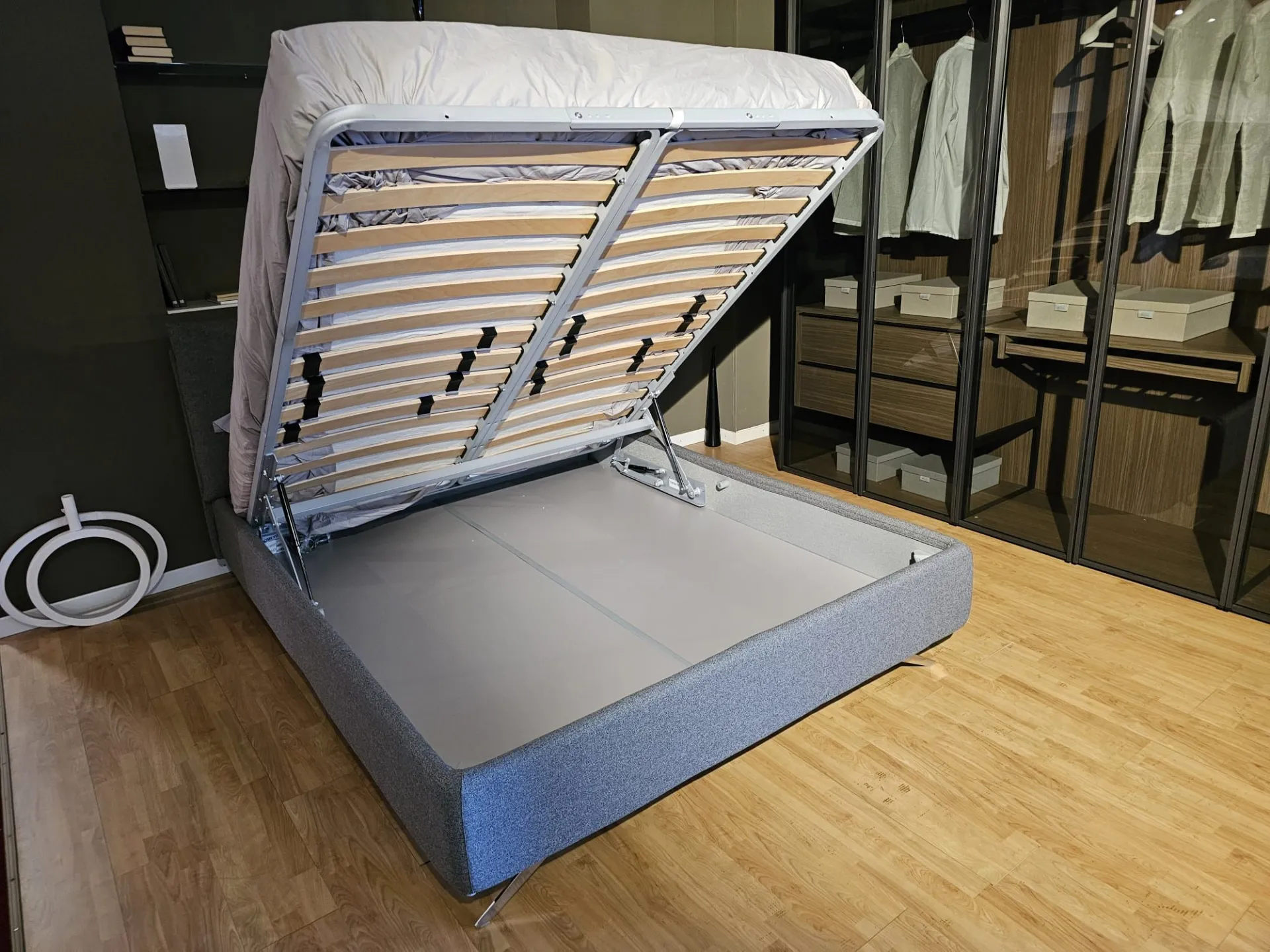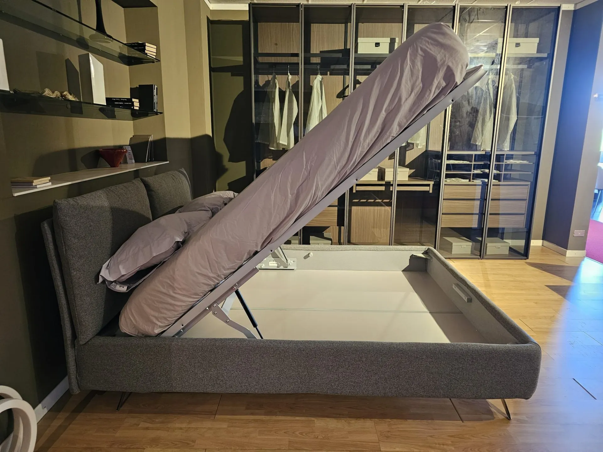 Double bed Tempur model FIVE, slatted frame Double with Comfort opening, size 160x200 cm, footboard with chrome finish mod. Moody with 15 cm height, covering in fabric art. Penelope color 23. The bed measures 179x230x103 cm. Product on display and available for immediate delivery. Contact us for more information.