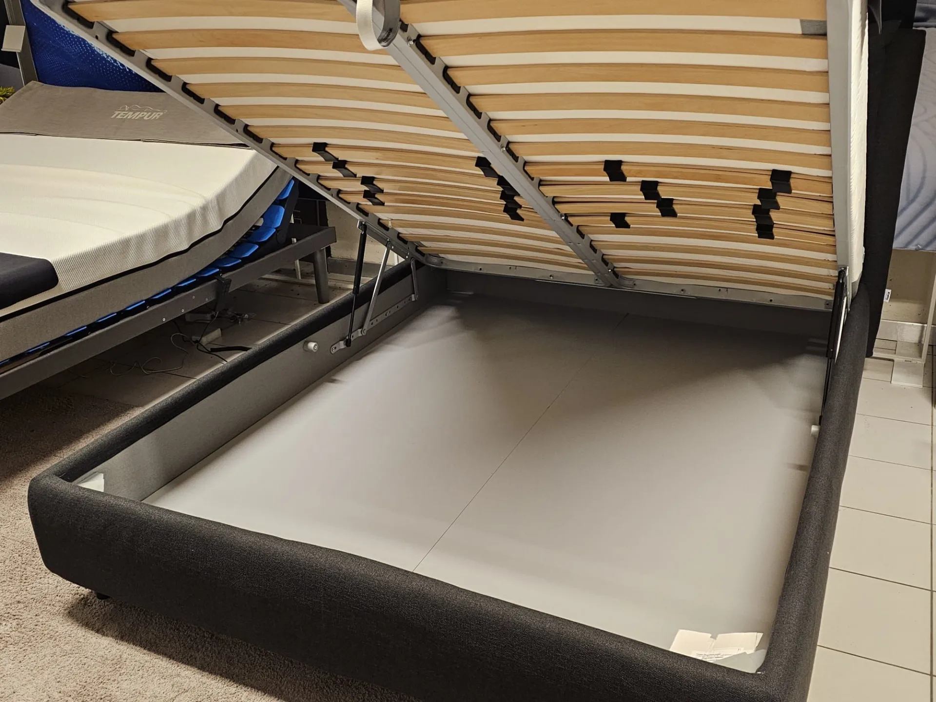 The headboard and the bed frame are removable, while the pillows are also detachable. Slatted bed base cm 160x200 standard foot model. Obliquo black color cm.11 h. covering in fabric art. Penelope color 25 Anthracite