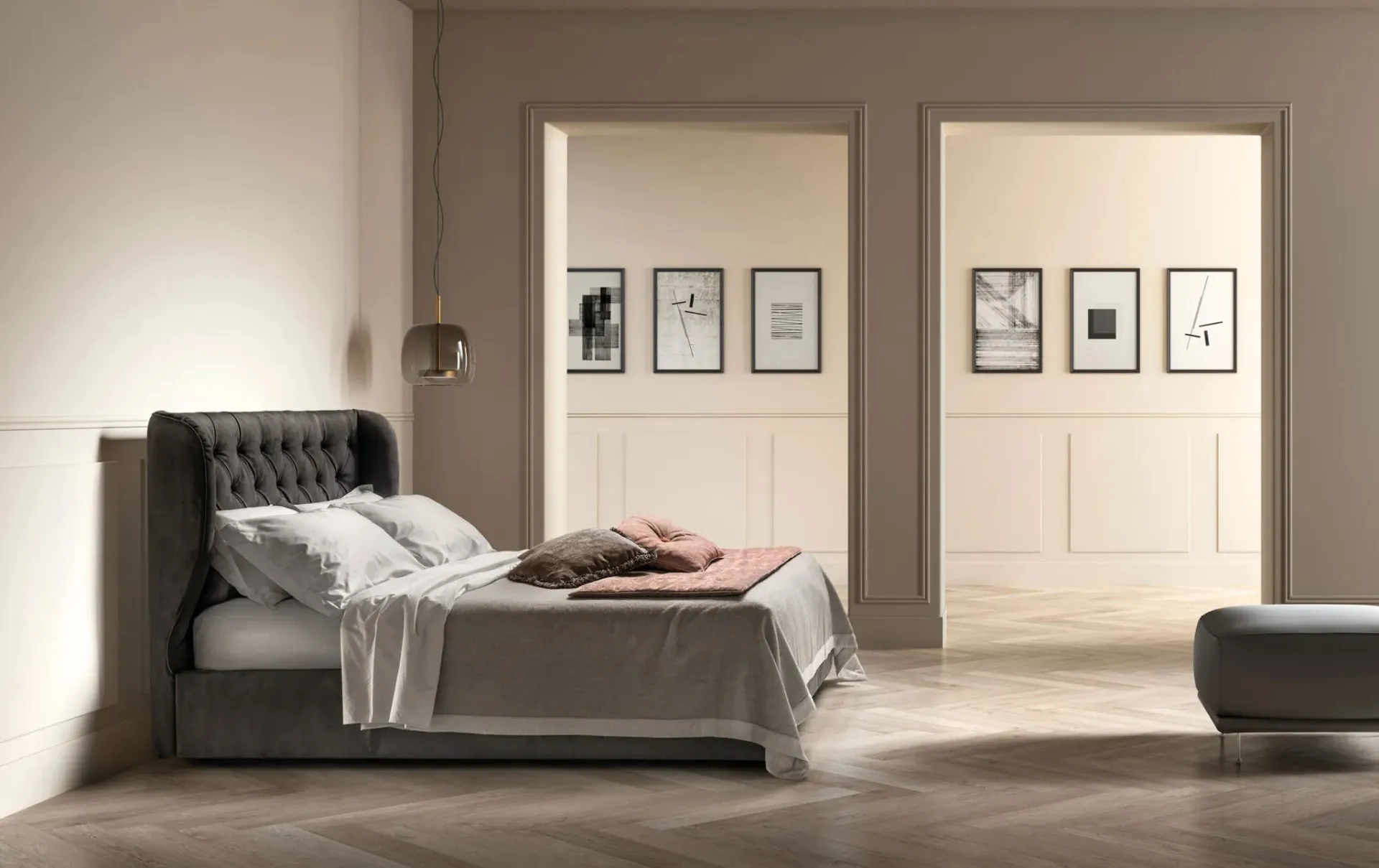 Choose colors and finishes and bring your bedroom project to life, designing it just as you have always dreamed. The upholstered double beds from the company, specialized in Home Furnishings for the sleeping area, are designed to be combined with furniture and accessories of all kinds, such as wardrobes and dressers, bedside tables and floor lamps. If you prefer a leather solution, the model shown in the photo is characterized by quality materials and clean lines, which invite you to have a peaceful and restorative rest. The Gem headboard Bed by Bside creates an intimate and comfortable space in every bedroom, ensuring you the best rest and a unique style. When choosing the right type of bed, carefully consider its measurements, materials, shape, and style compared to the other furniture pieces.