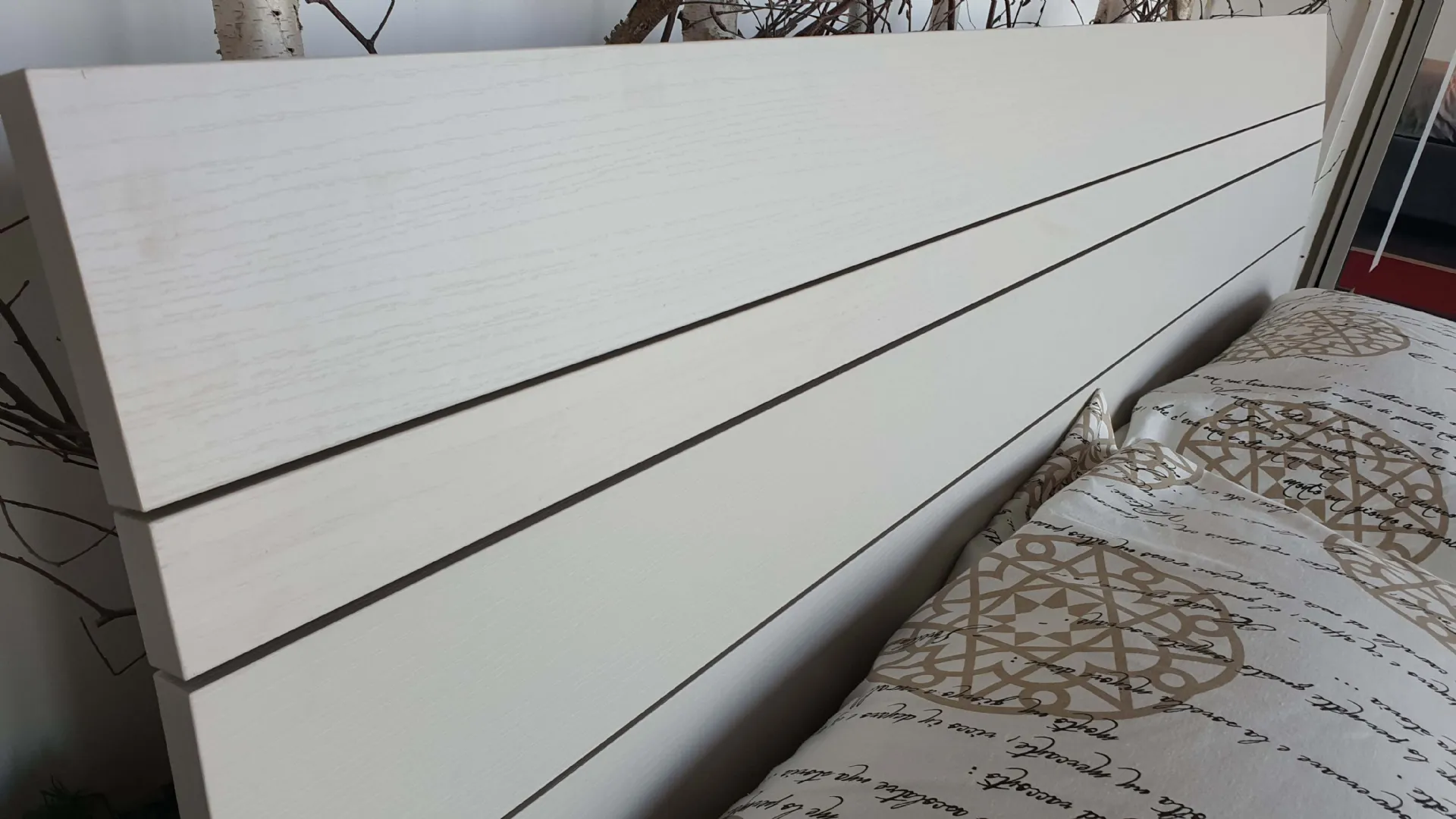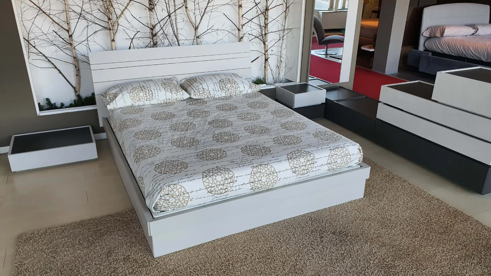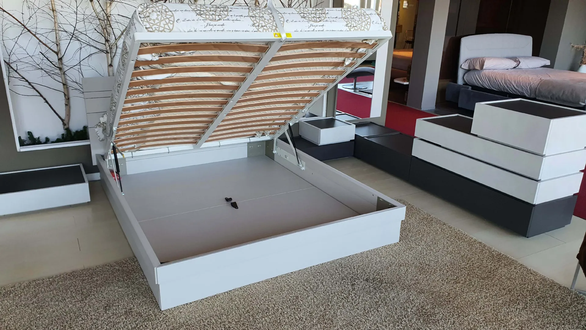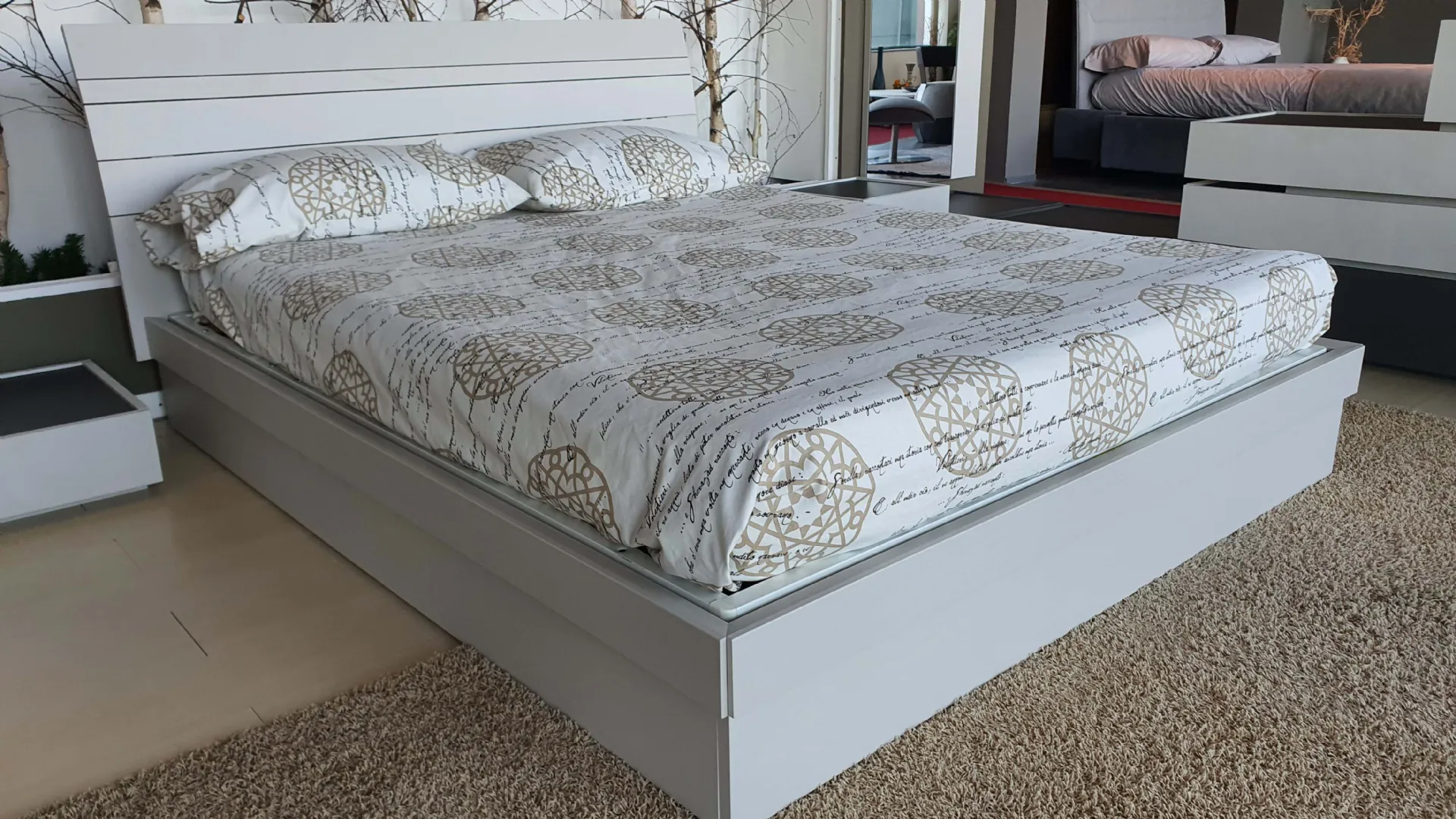 Double bed with container JOKER model with liftable slatted base measuring 160x200 cm in materic open-pore mother-of-pearl finish and with band always in materic open-pore finish in mother-of-pearl color. The bed è easily combined with any style of furnishings già present in the room.