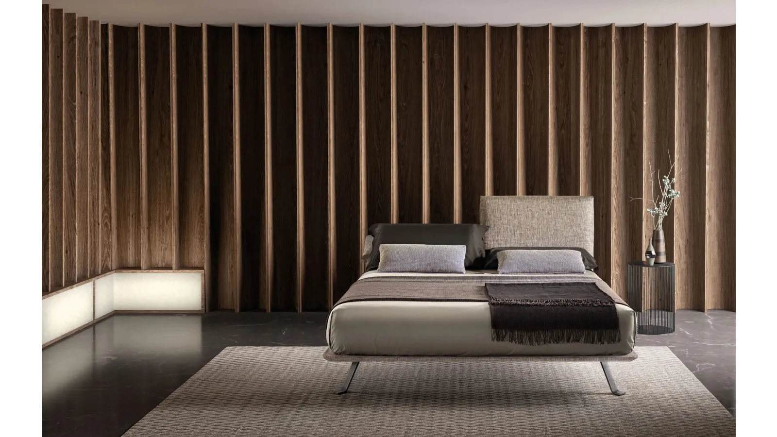 Choose the tones and finishes and bring your furnishing concept in the bedroom to life, designing it just as you had dreamed. The upholstered double beds by the brand, a specialist in producing home furnishings for the bedroom, are designed to be paired with furniture and accessories of all kinds, such as wardrobes and bedside tables, bedside lamps and standing lamps. If you desire a fabric solution, the model shown in the photo is characterized by luxurious materials and sleek shapes, inviting you to get a complete and rejuvenating sleep. When choosing a good bed model, carefully consider its measurements, finishes, shape, and style compared to the rest of the furnishings. The Just adjustable headboard bed by Bside recreates a cozy and comfortable space in every bedroom, ensuring you get the deepest sleep and a unique style.