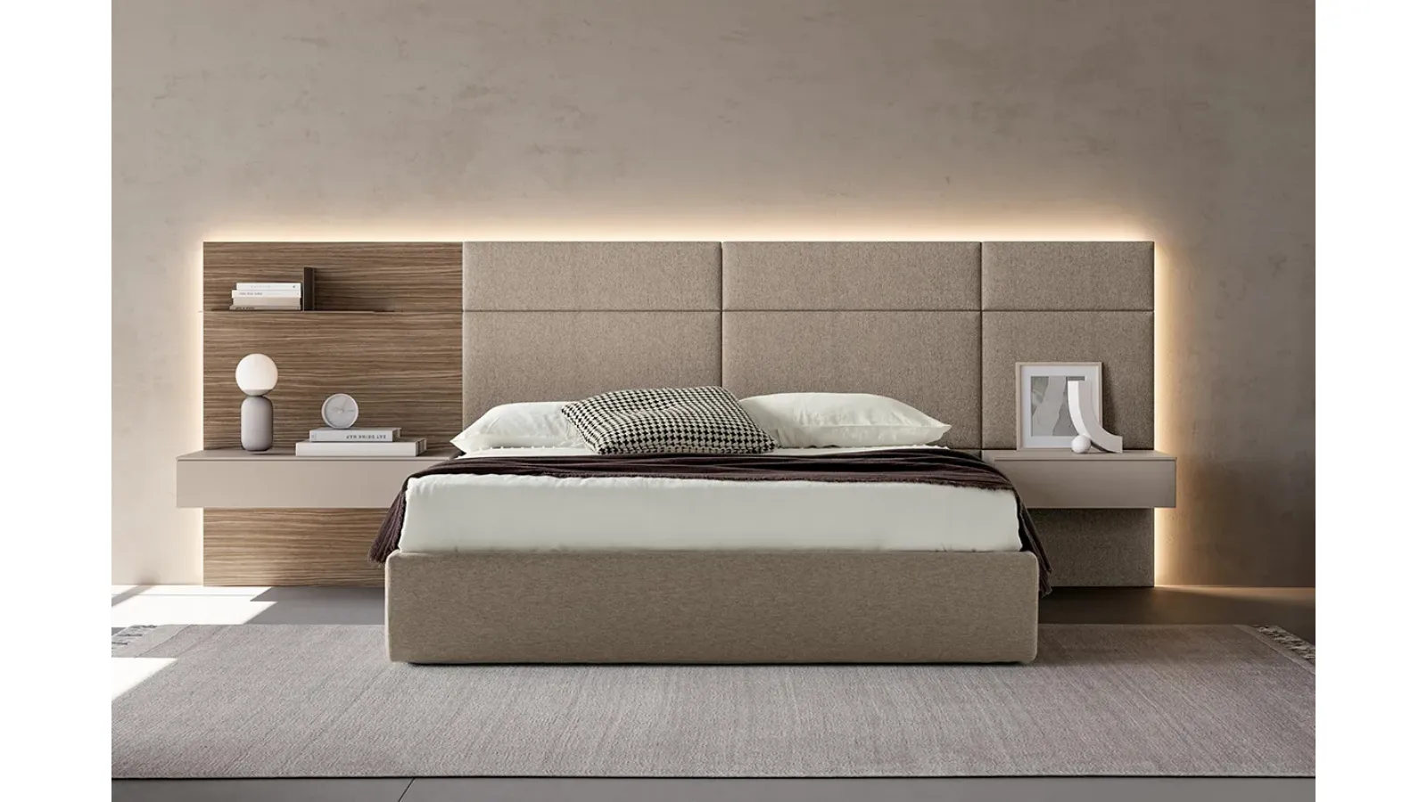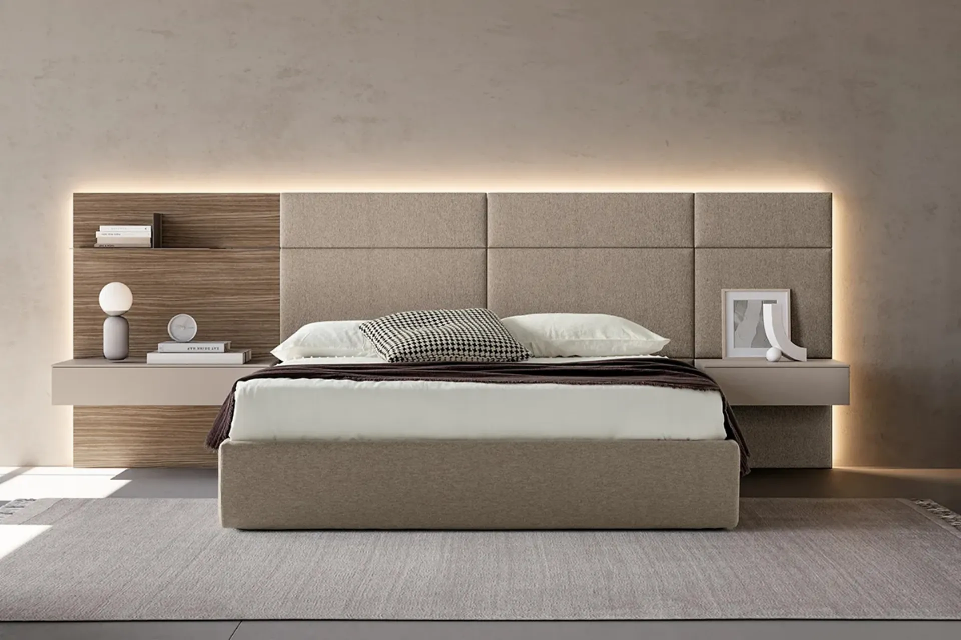 Il letto matrimoniale Modula di Adok rappresenta una soluzione d'arredo contemporanea, concepita per ottimizzare lo spazio e assicurare un comfort elevato. Questo modello imbottito integra un avanzato sistema di contenimento, disponibile con apertura frontale tradizionale o con l'innovativo meccanismo Easy-Up. Quest'ultimo consente di elevare la rete fino a renderla parallela al pavimento, massimizzando la capacità di stoccaggio senza alterare l'armonia estetica della camera. La progettazione Adok enfatizza la fusione tra funzionalità e design sofisticato; alcune configurazioni prevedono persino un'illuminazione perimetrale integrata, capace di definire scenografie luminose uniche nell'ambiente notte. L'ingegneria del prodotto è studiata per garantire prestazioni durature e un valore intrinseco superiore.