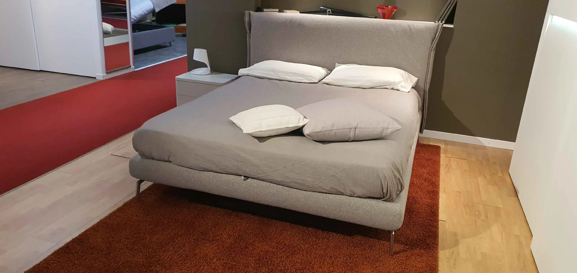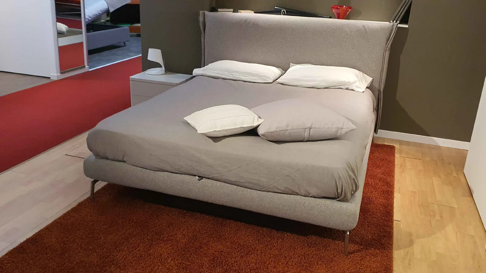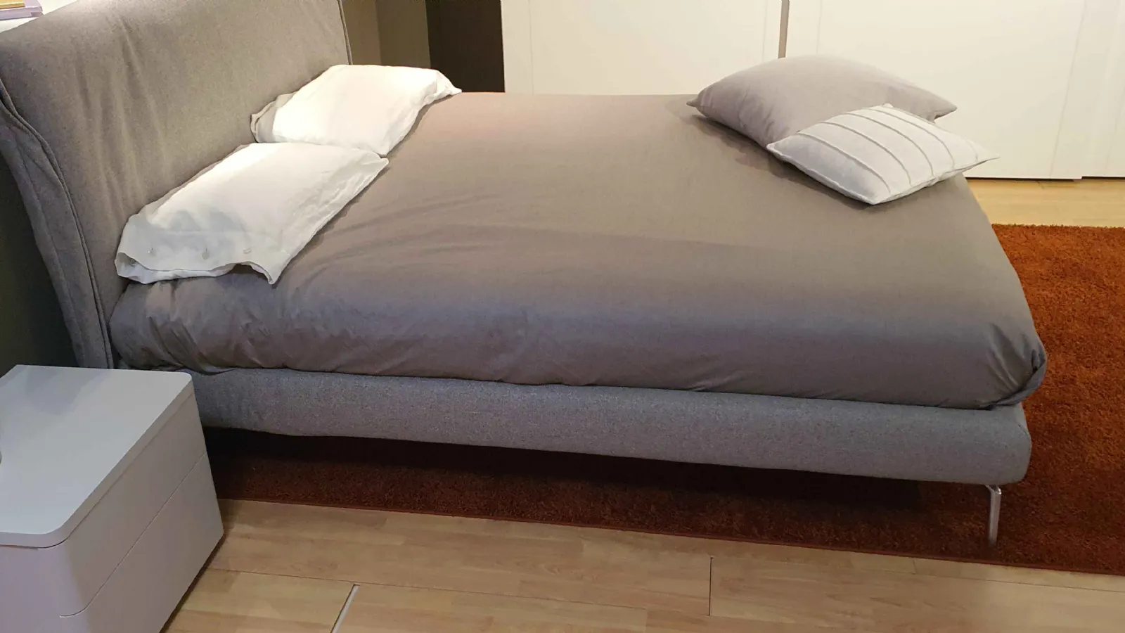 E& # 39; composed of a curved and enveloping headboard. The lateral voulant è folded to form a soft crescent, in perfect harmony with the curves of the bed and are covered with removable and washable fabric in shadesà gray cat.C .. The bed è raised from the ground with optional feet in chrome finish.