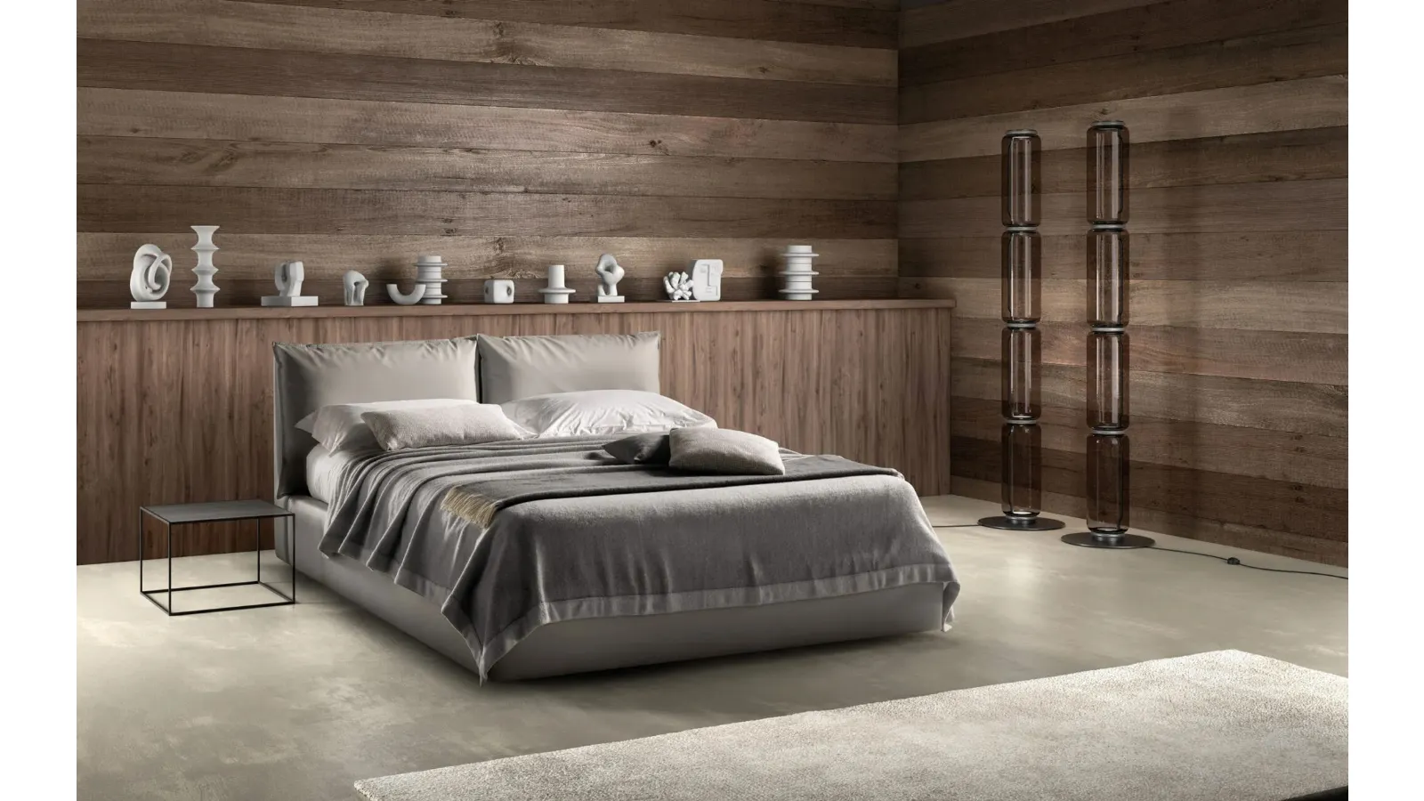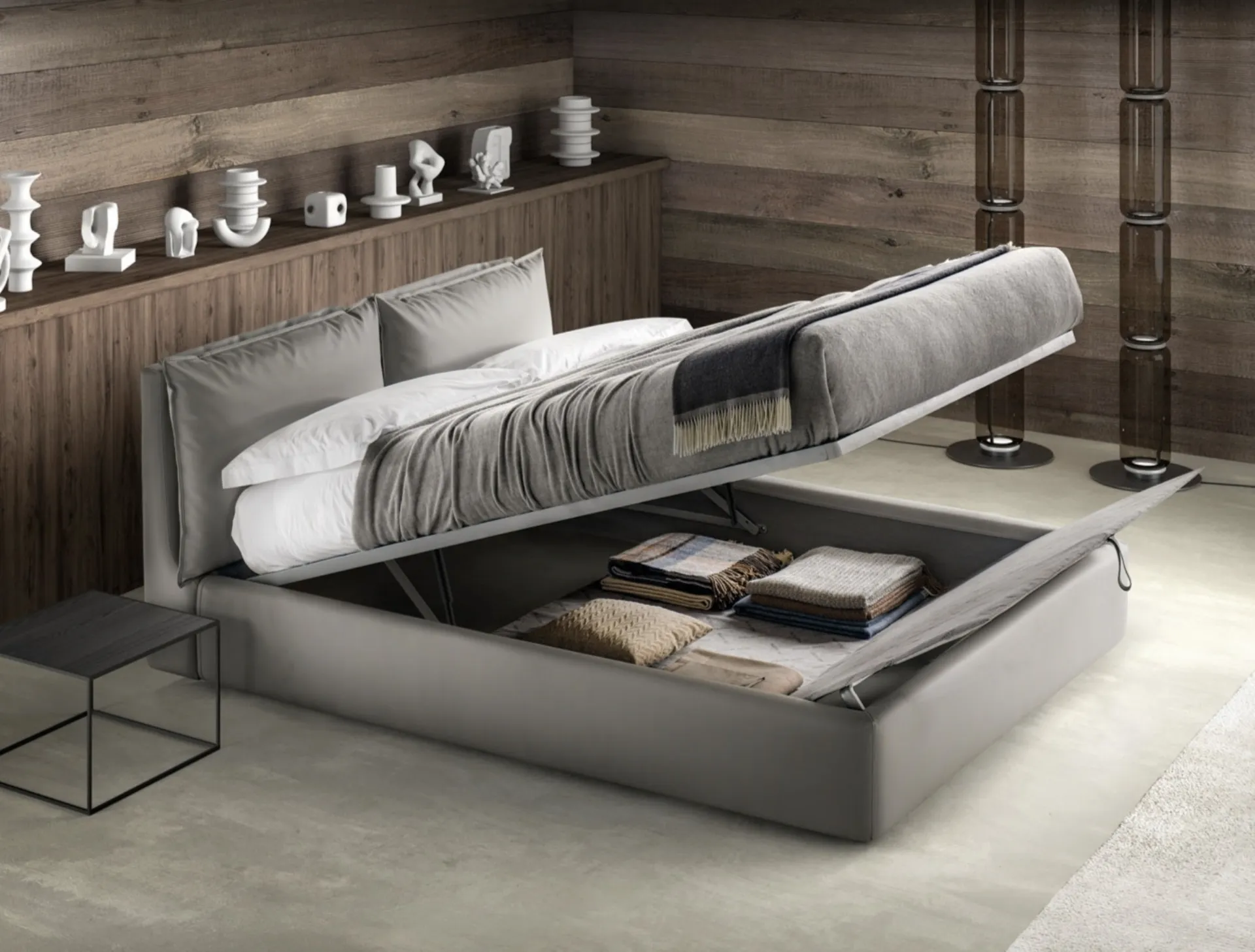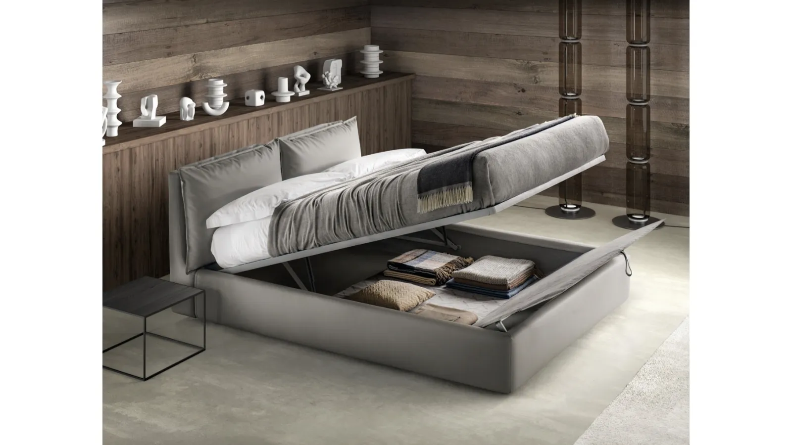 Choose shades and finishes and realize your furnishing concept in the bedroom, designing it just as you have always dreamed of. The double beds with container of the signature, specialist in the production of home furnishings for the bedroom, are designed to be combined with furniture and accessory objects of all kinds, such as wardrobes and bedside tables, lamps and floor lamps. If you want a fabric solution, the model shown in the photo is characterized by quality materials and strong shapes, which invite you to spend a complete and regenerating rest. When buying a good bed model, carefully evaluate its measurements, finishes, shape and style compared to the rest of the furnishings. The Quiet bed with container by Bside creates a familiar and comfortable space in every bedroom, guaranteeing total relaxation and a unique style.