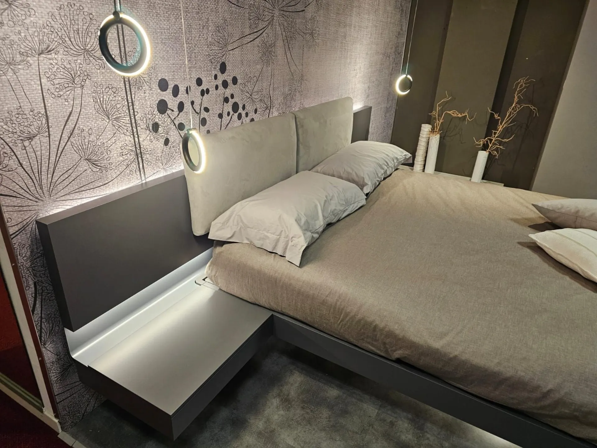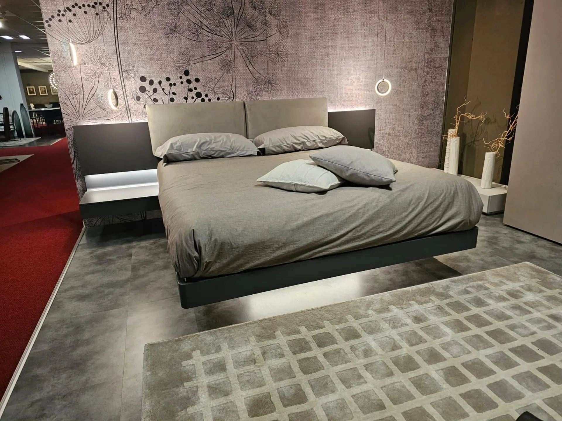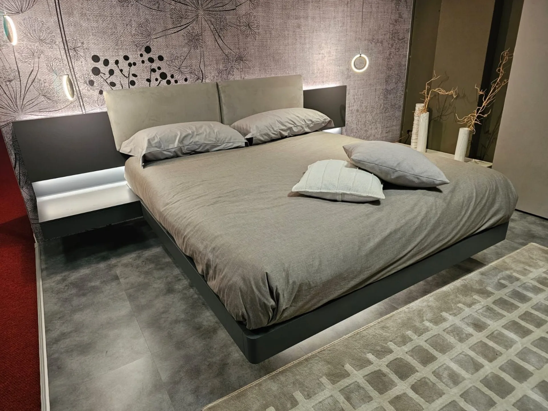 Suspended SHIRO bed with LED lights, matte painted LAVA finish, Marna lacquered metal elements, upholstered headboard with Econabuk fabric in color 11, slatted bed base cm. 160x200. Integrated bedside tables with drawer. Contact us for information and quotes on different sizes/colors!