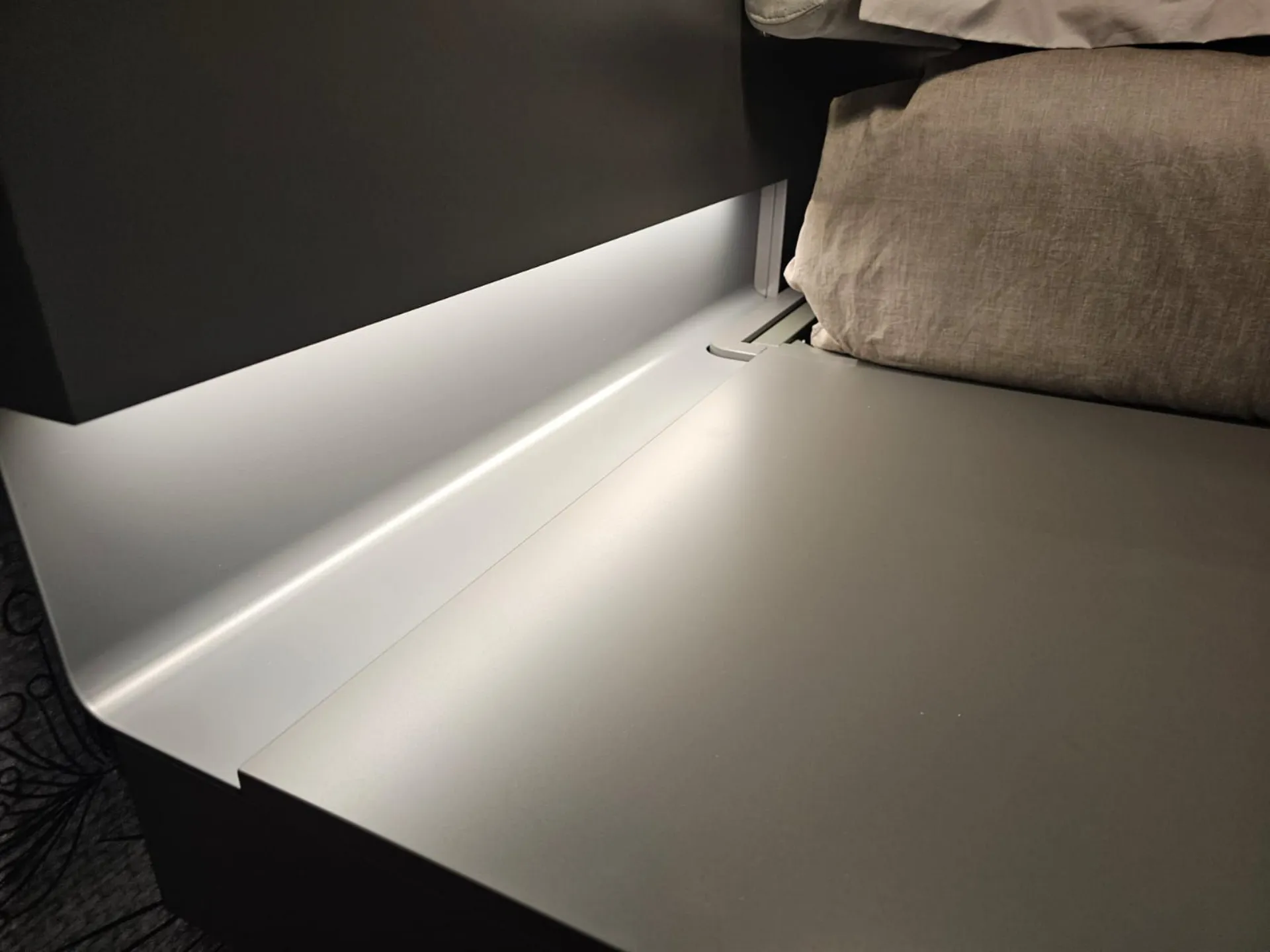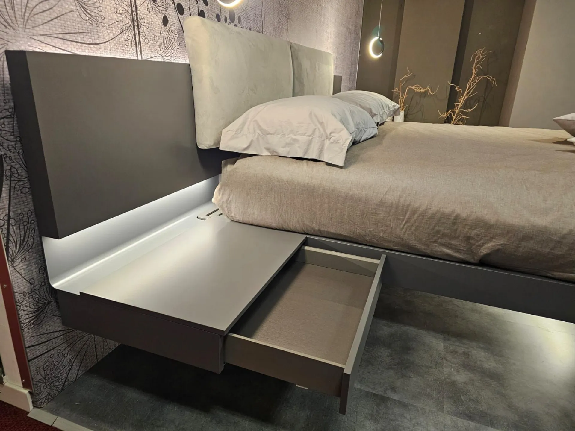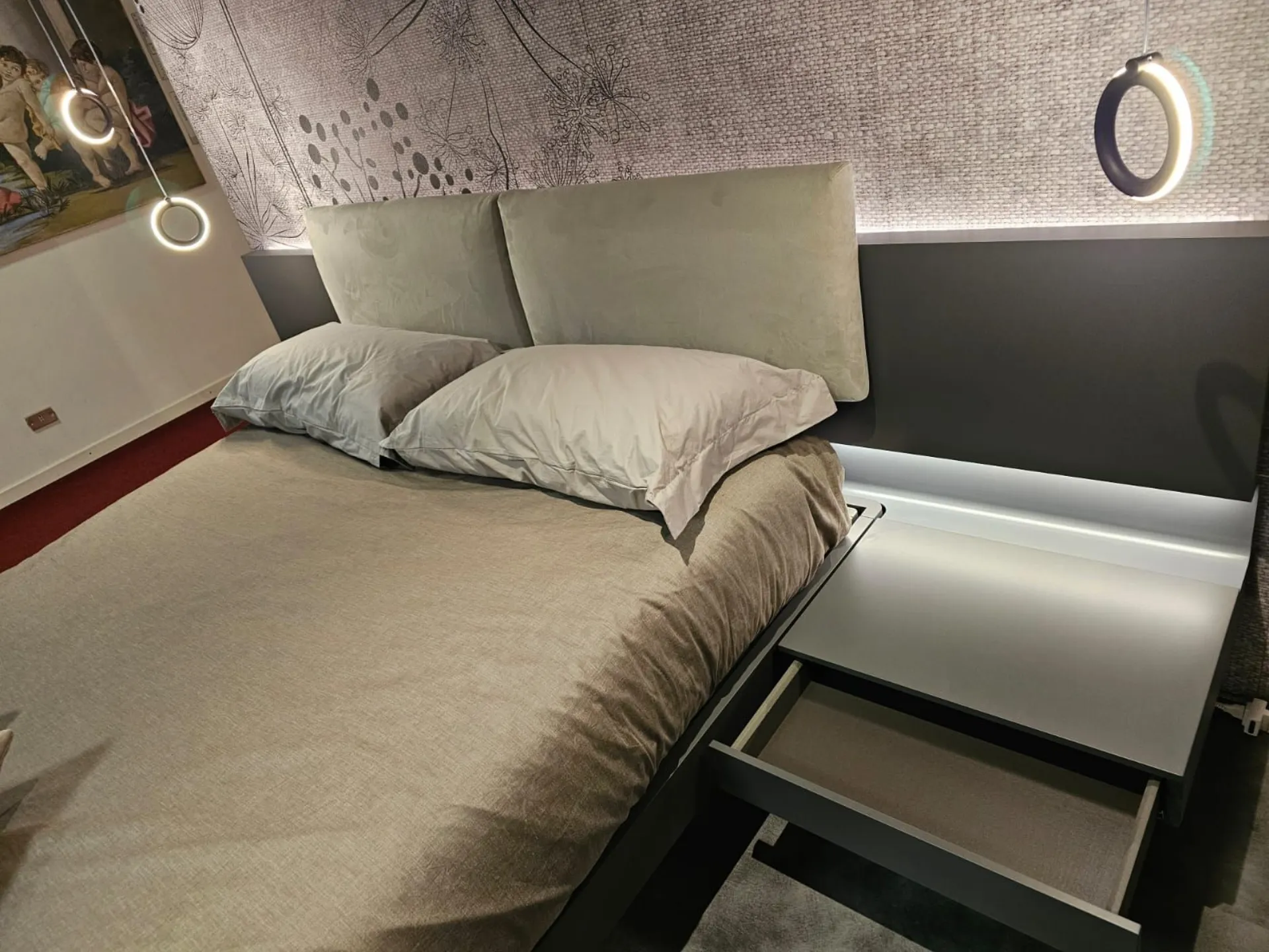 Suspended SHIRO bed with LED lights, matte painted LAVA finish, Marna lacquered metal elements, upholstered headboard with Econabuk fabric in color 11, slatted bed base cm. 160x200. Integrated bedside tables with drawer. Contact us for information and quotes on different sizes/colors!