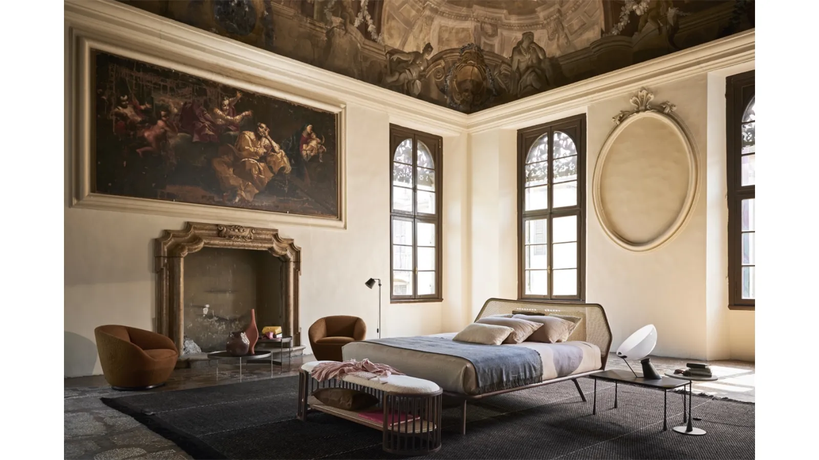 Trama, letto moderno in legno, con testiera in Paglia di Vienna