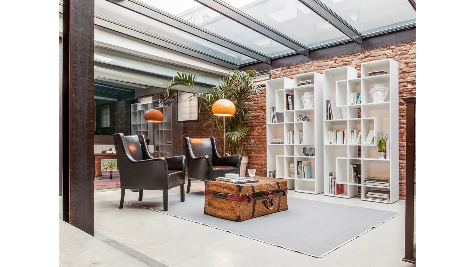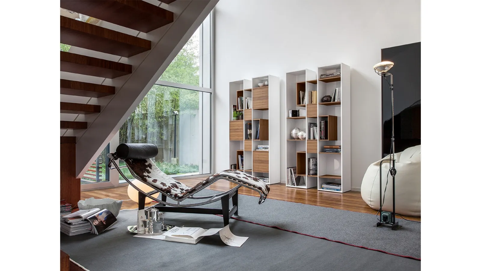 The model shown in the photo belongs to the collection of modern modular bookcases by the brand Tonin Casa.