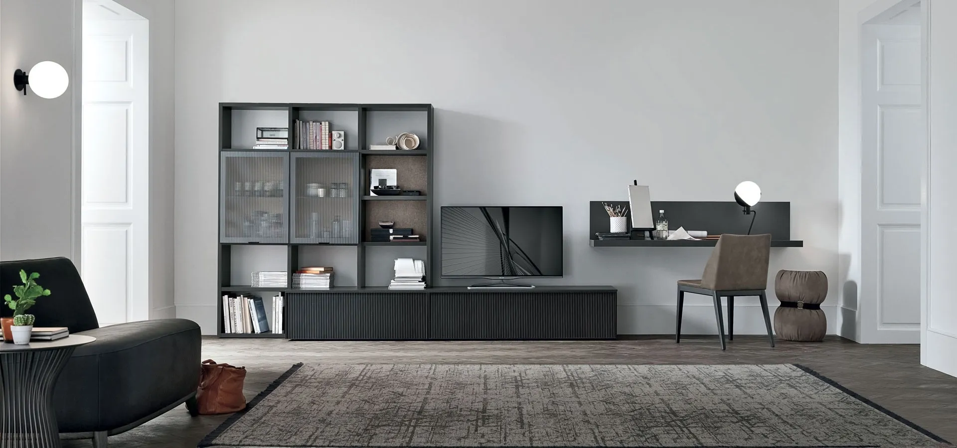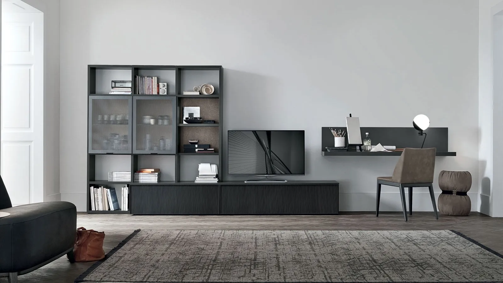 Il sistema libreria Atlante UNIT_AT205 si distingue per un design innovativo, caratterizzato da linee verticali e dettagli in rilievo che ne esaltano l'estetica. La struttura è impreziosita dall'uso sapiente del legno di rovere carbone cannettato, il quale genera un raffinato motivo decorativo sui frontali, delineando un'eleganza contemporanea e di tendenza. Questo modello offre un'ampia versatilità nelle finiture, includendo opzioni come il rovere carbone materico e cannettato, il materico grigio ghiaia, il metallo antracite 160 e l'elegante vetro cannettato, permettendo una personalizzazione profonda per ogni ambiente. La qualità superiore dei materiali impiegati è fondamentale per la durabilità e l'eccellenza estetica del prodotto. Esplora le molteplici finiture disponibili per personalizzare il tuo spazio.