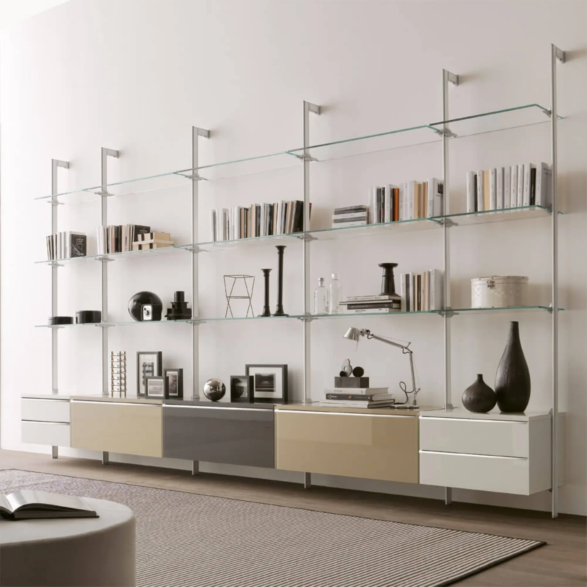 | Materiale: | Alluminio (montanti), Cristallo extrachiaro (piani), Melaminico bianco (contenitori), Cristallo antracite (frontali e top contenitori), Cristallo bianco (frontali e top contenitori), Cristallo canapa/moka (frontali e top contenitori) |
