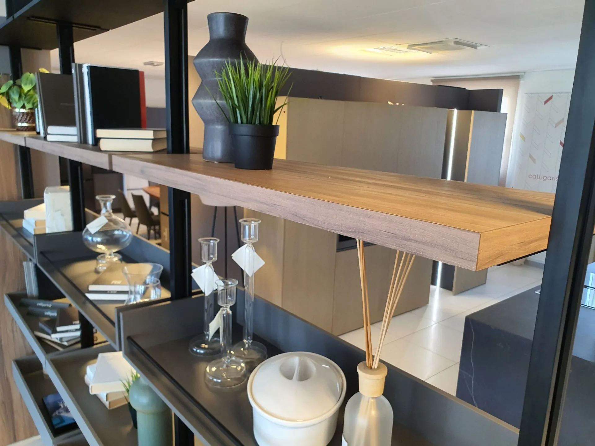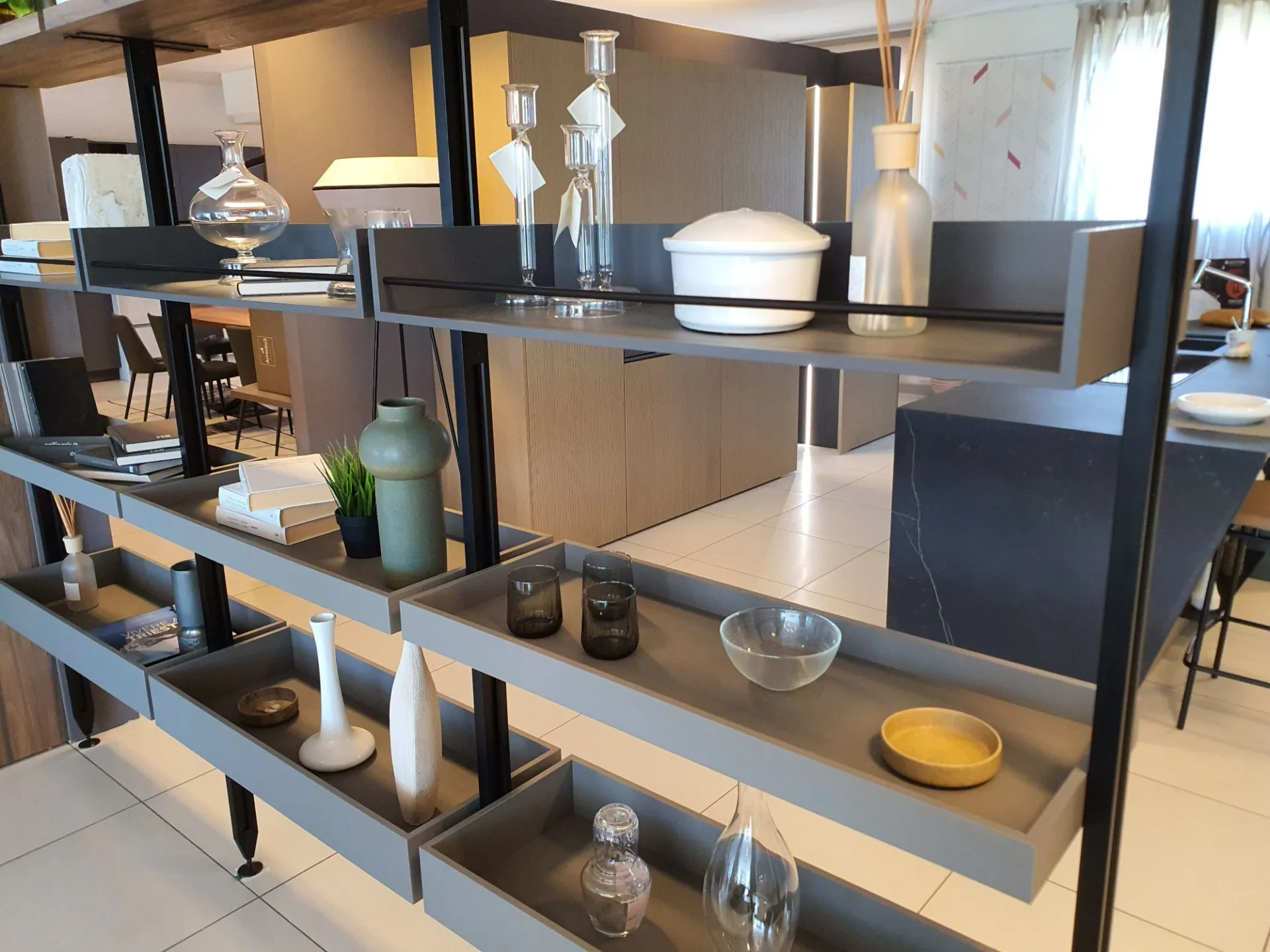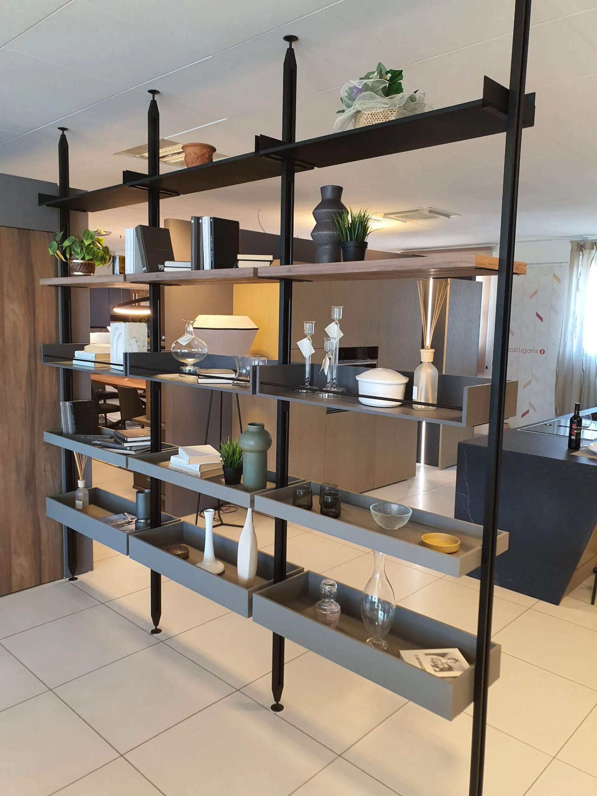 mod.FACTORY Arredo3 library, structure in matte black metal, trays in matte lacquered finish LAVAGNA MAXXIMATT 320 MATTE, BLACK INGO 453 and IMPERIAL WALNUT 656.