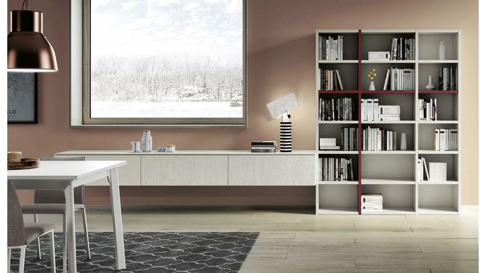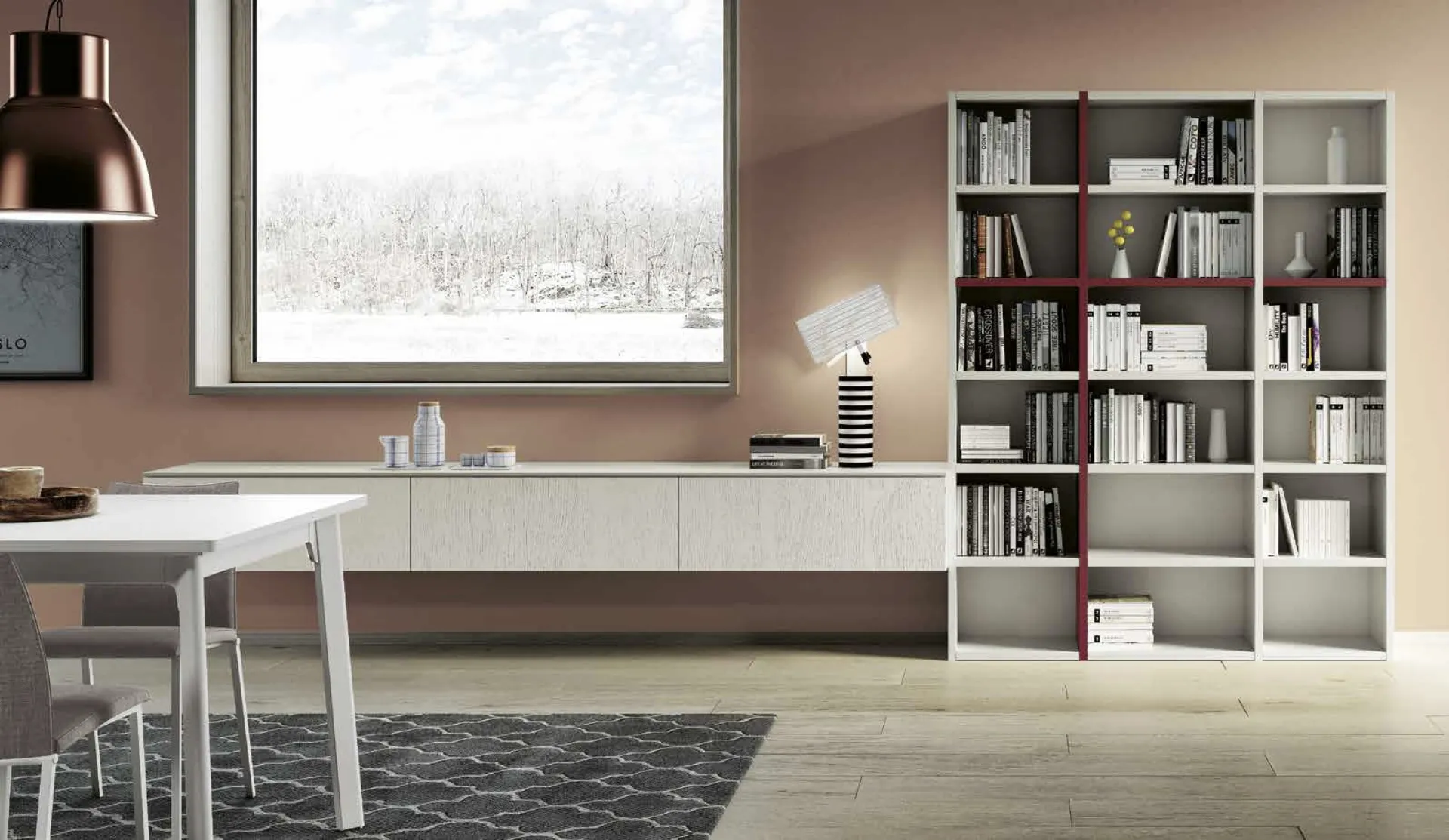 Matte lacquered library by Spagnol Mobili, designed to furnish modern spaces and optimize interior organization.