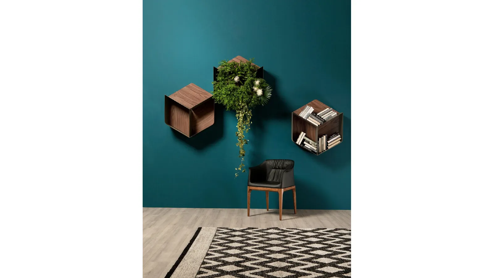 The model visible in the photo belongs to the collection of suspended design bookcases by the brand Tonin Casa.