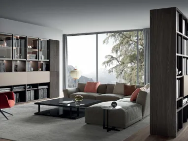 Library Panto X016 C, self-supporting modular with a natural wild oak pw91 wood structure, bronze metal uprights MT97, transparent glass shelves. Size: cm L.186xW.48xH.200.