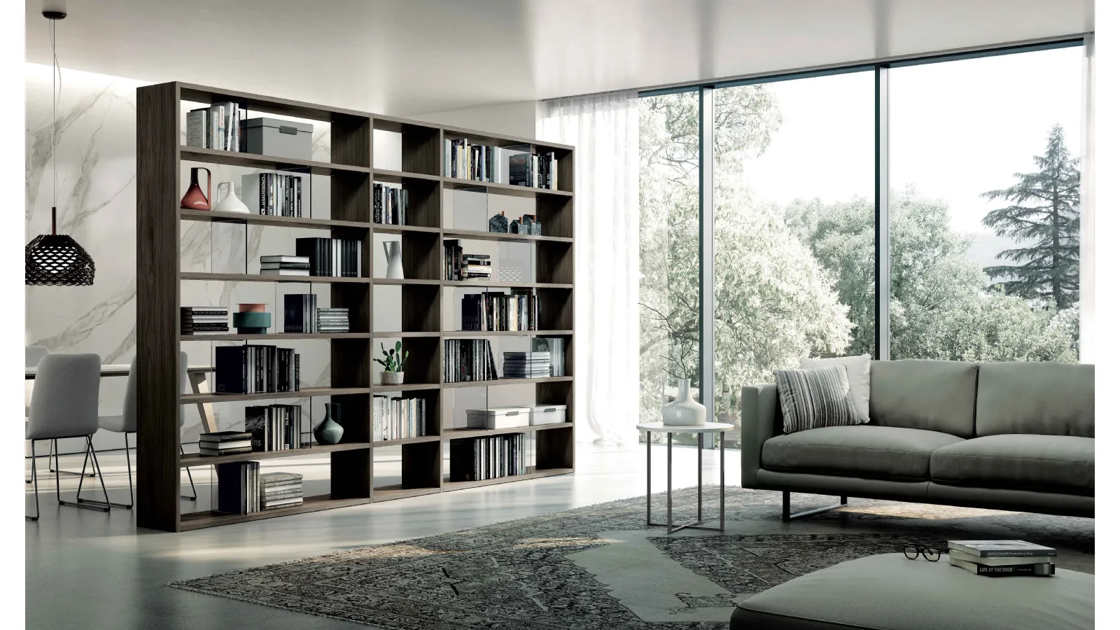 The model shown in the photo is part of the collection of modern dividing bookcases from the brand Spagnol Mobili.