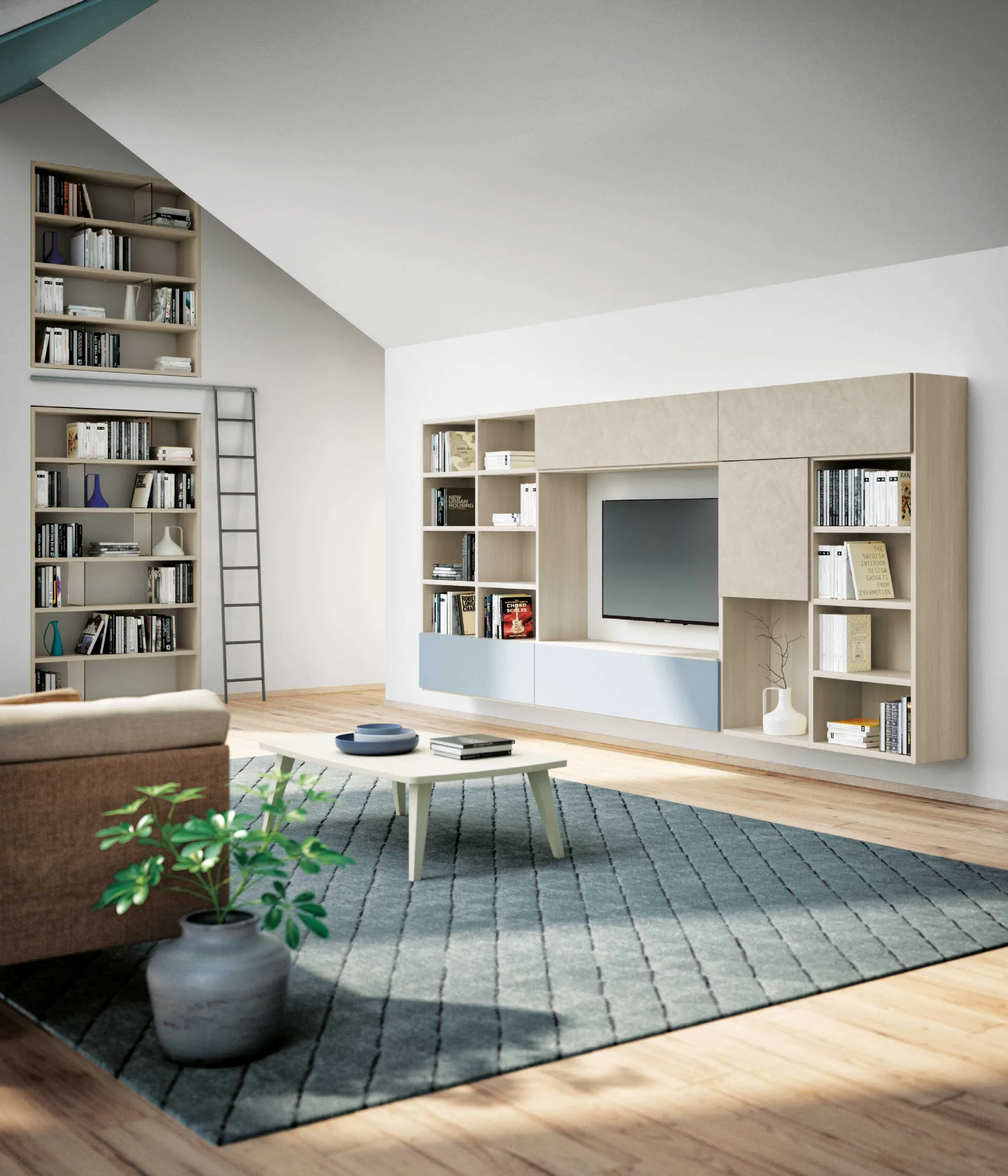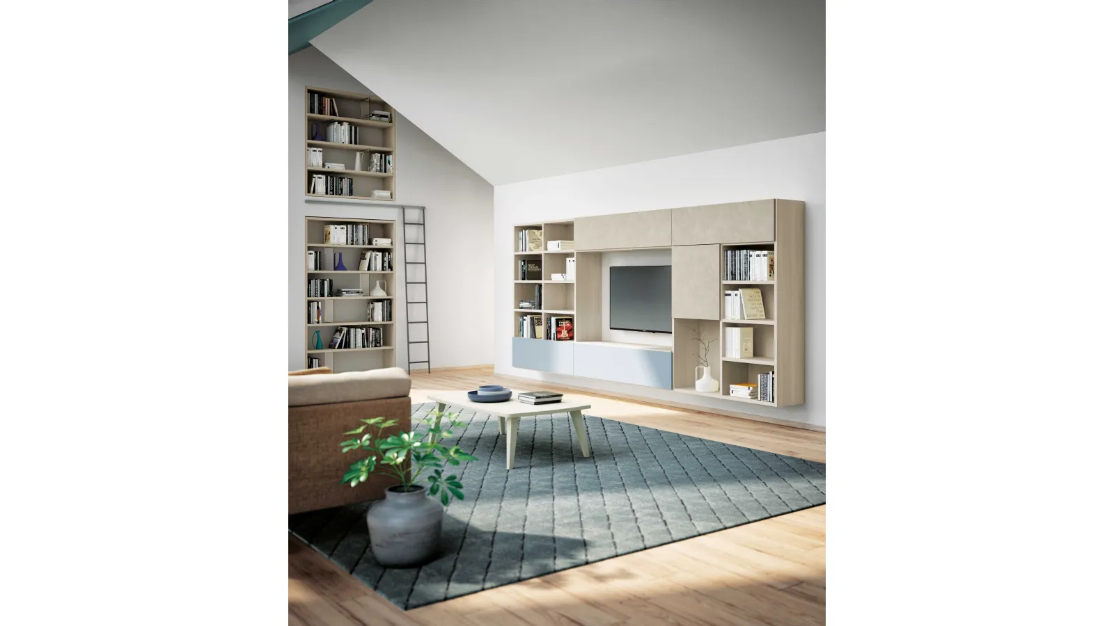 We look forward to welcoming you with a wide range of modern suspended bookshelves and living room furniture in melamine.