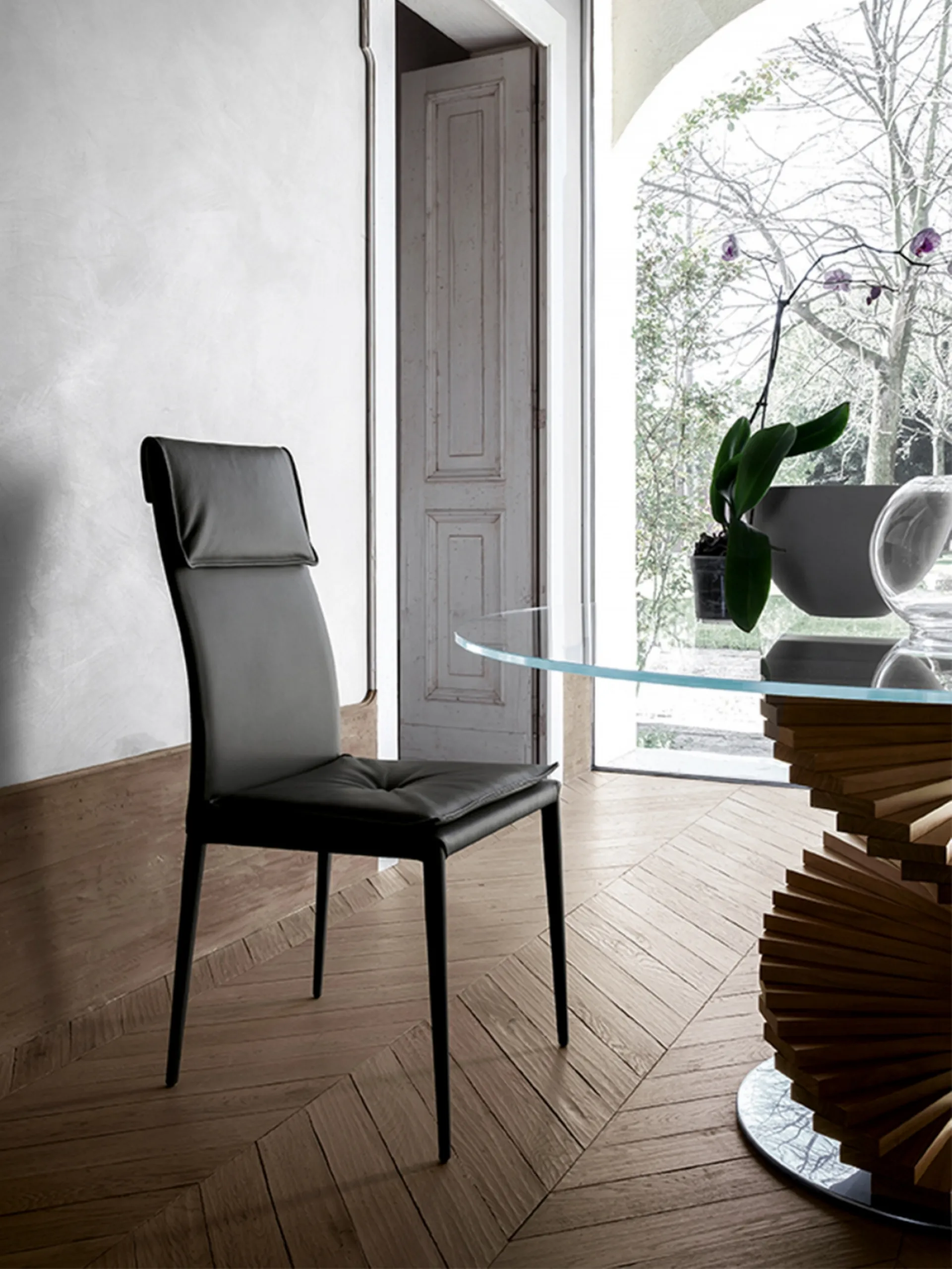 The Adria chair with leather seat cover by Tonin Casa available here belongs to our collection of fixed design chairs