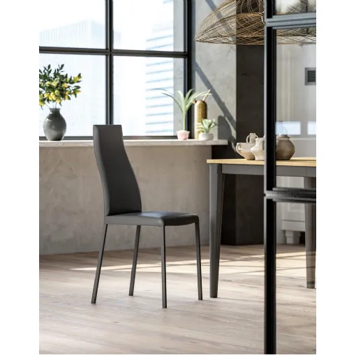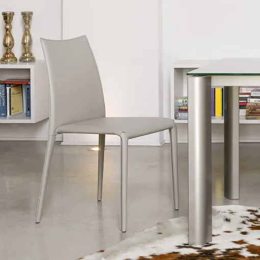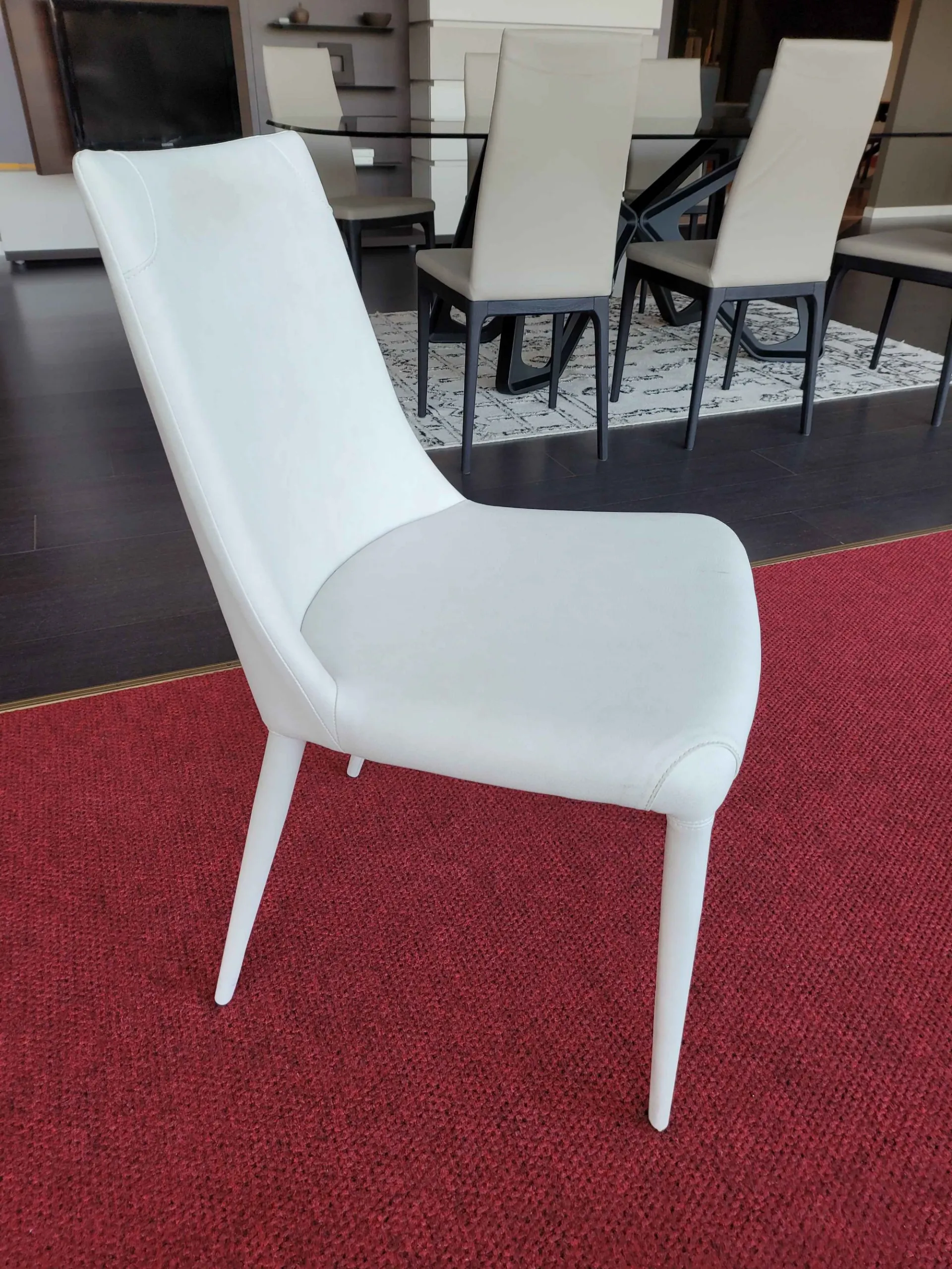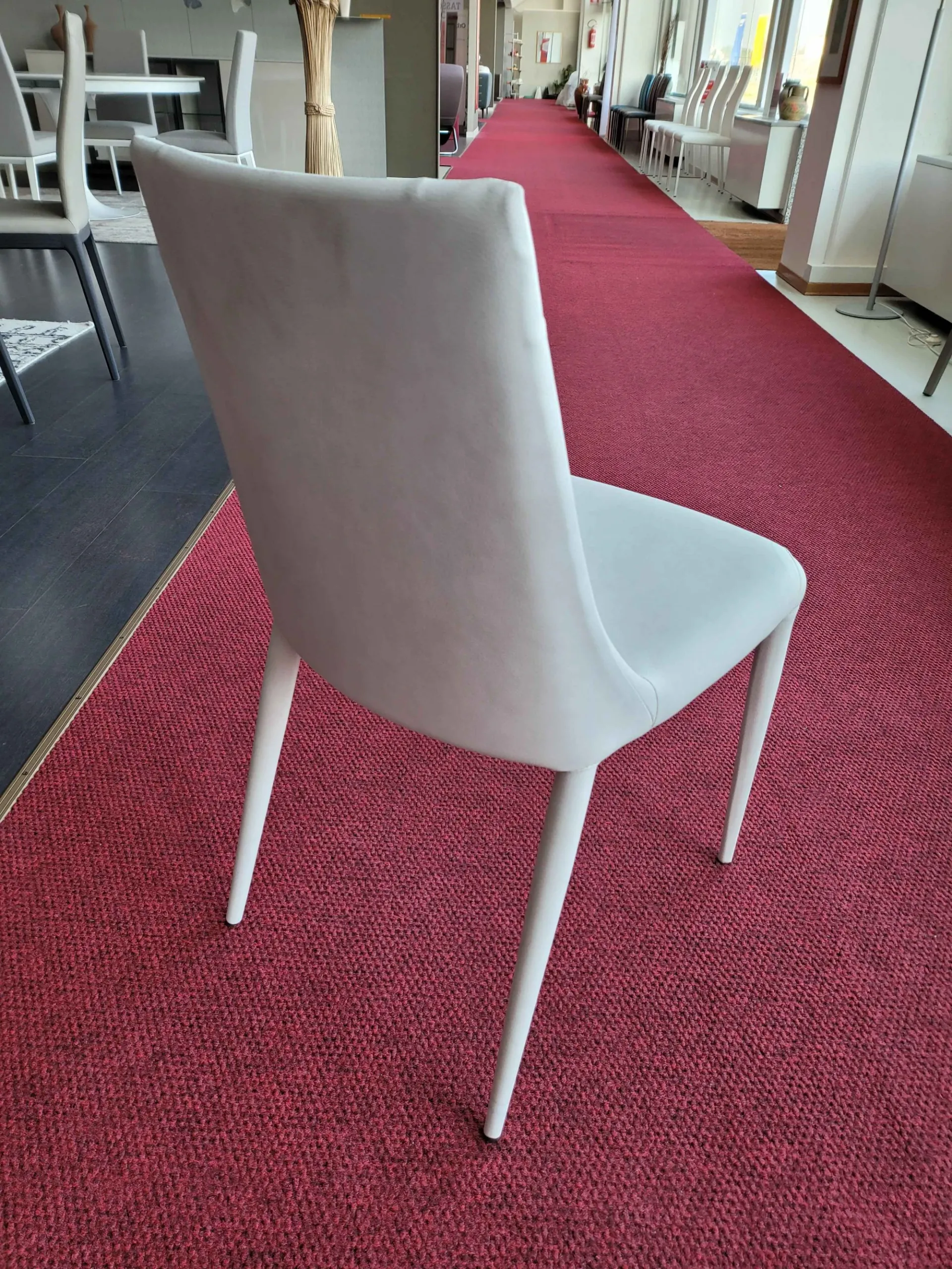 Chair OPEN with a slightly curved back and soft lines. Fully upholstered in white eco-leather and special seams near the 26-agrave; of the four legs.