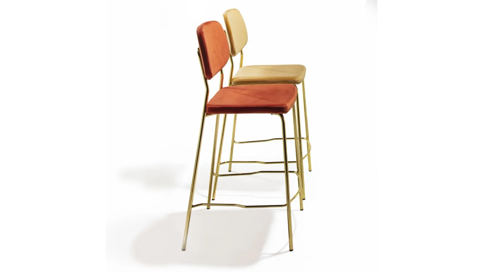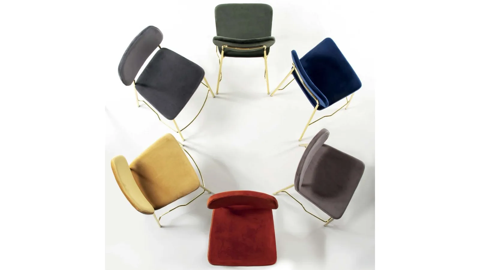 | Materiali: | Struttura in metallo verniciato nero o ottone lucido; sedile e schienale imbottiti rivestiti in velluto antimacchia (disponibile in grigio fumo, tortora, senape, arancio, blu, verde). |