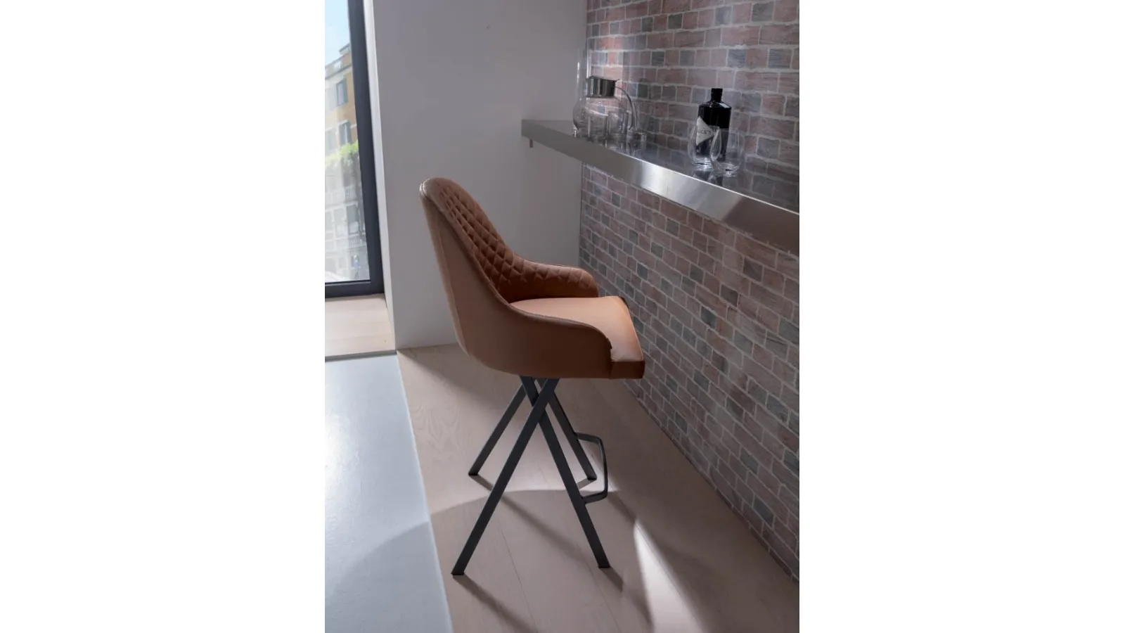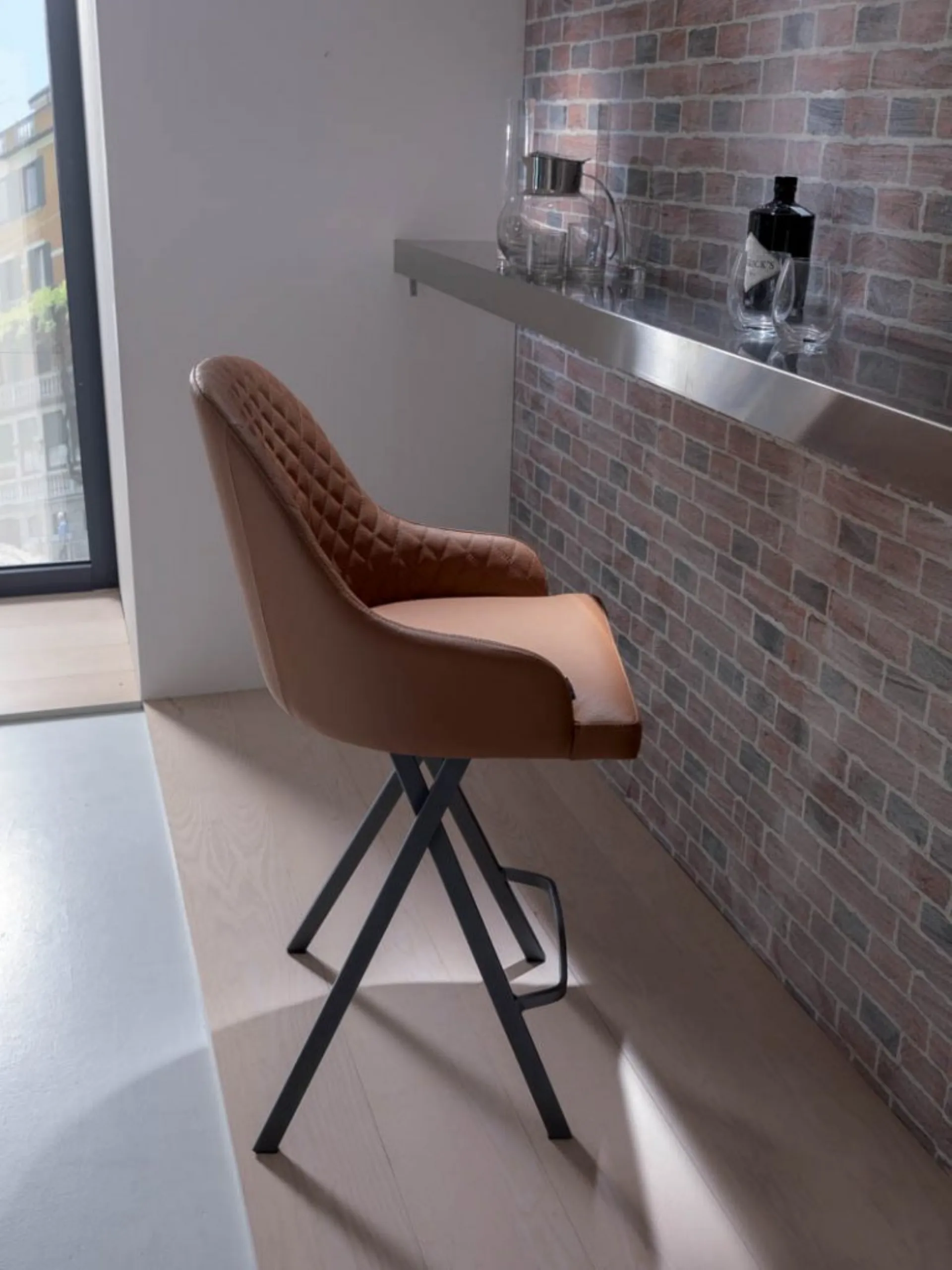Fixed stool with leather upholstery and quilted interior