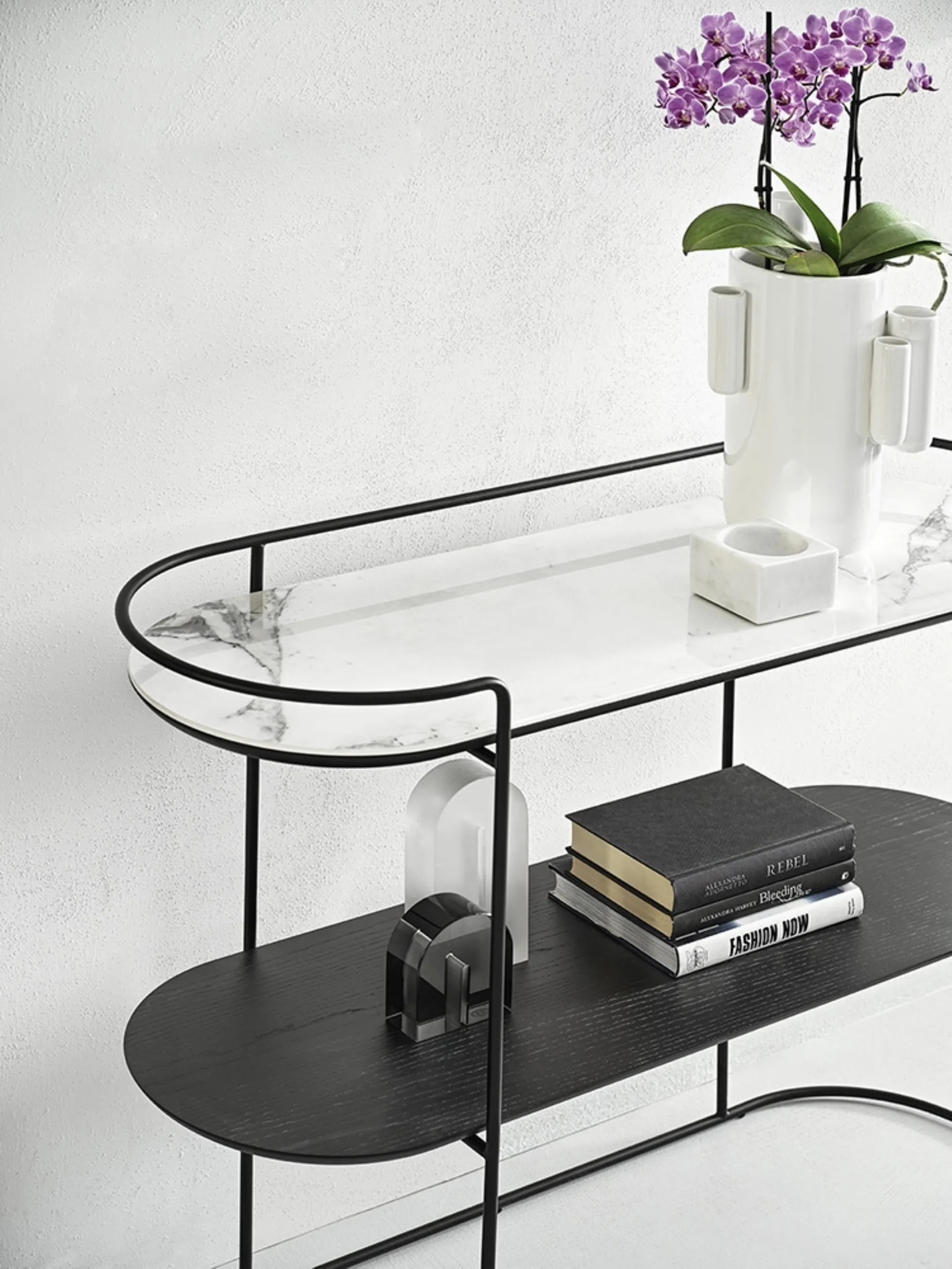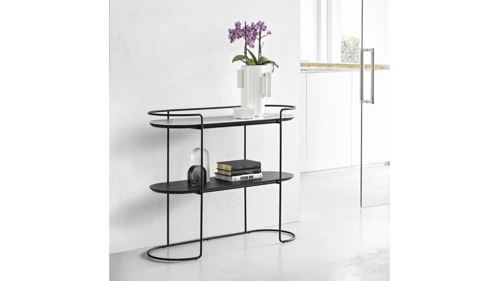 The Atollo ceramic model shown in the photo, one of the Calligaris furniture pieces for modern entrances, is waiting for you