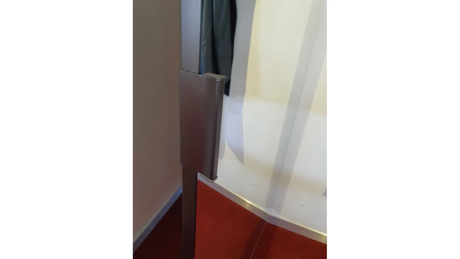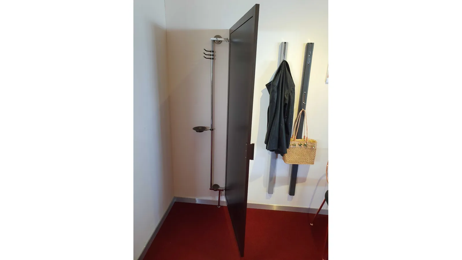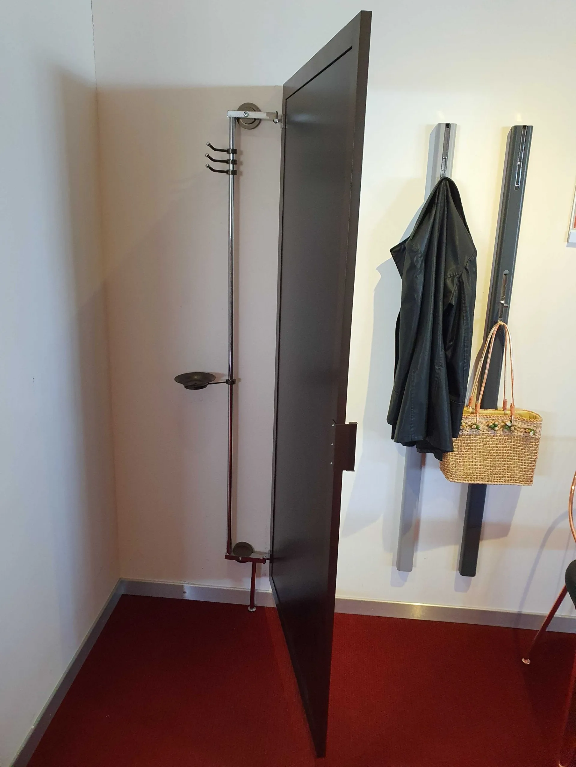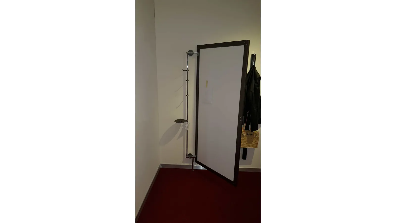 Corner HIDING mirror with opening adaptable to any corner of the house. Practical and elegant solution to give depthà to a particularly narrow or dark area of the house, obtaining a comfortable clothes hanger and discreet and invisible object holder. È characterized by a painted aluminum frame door with a fumè -bronzo mirror panel that by rotating allows access to the rear part, thanks to the particular upright that keeps it anchored to the può wall ; be positioned with different angles to better adapt to the space available.