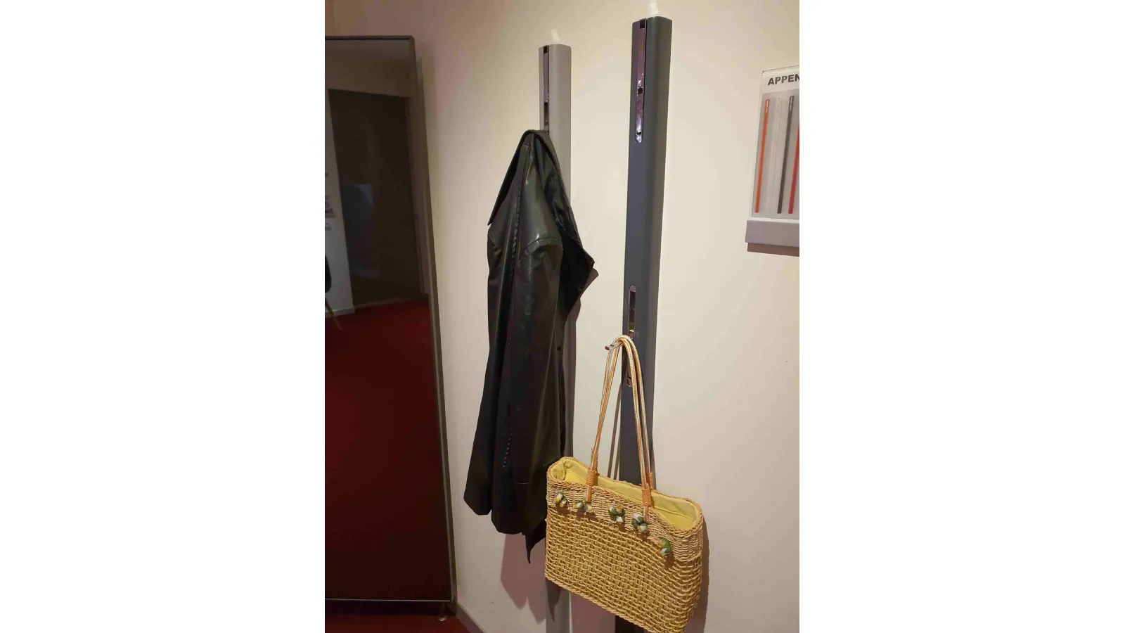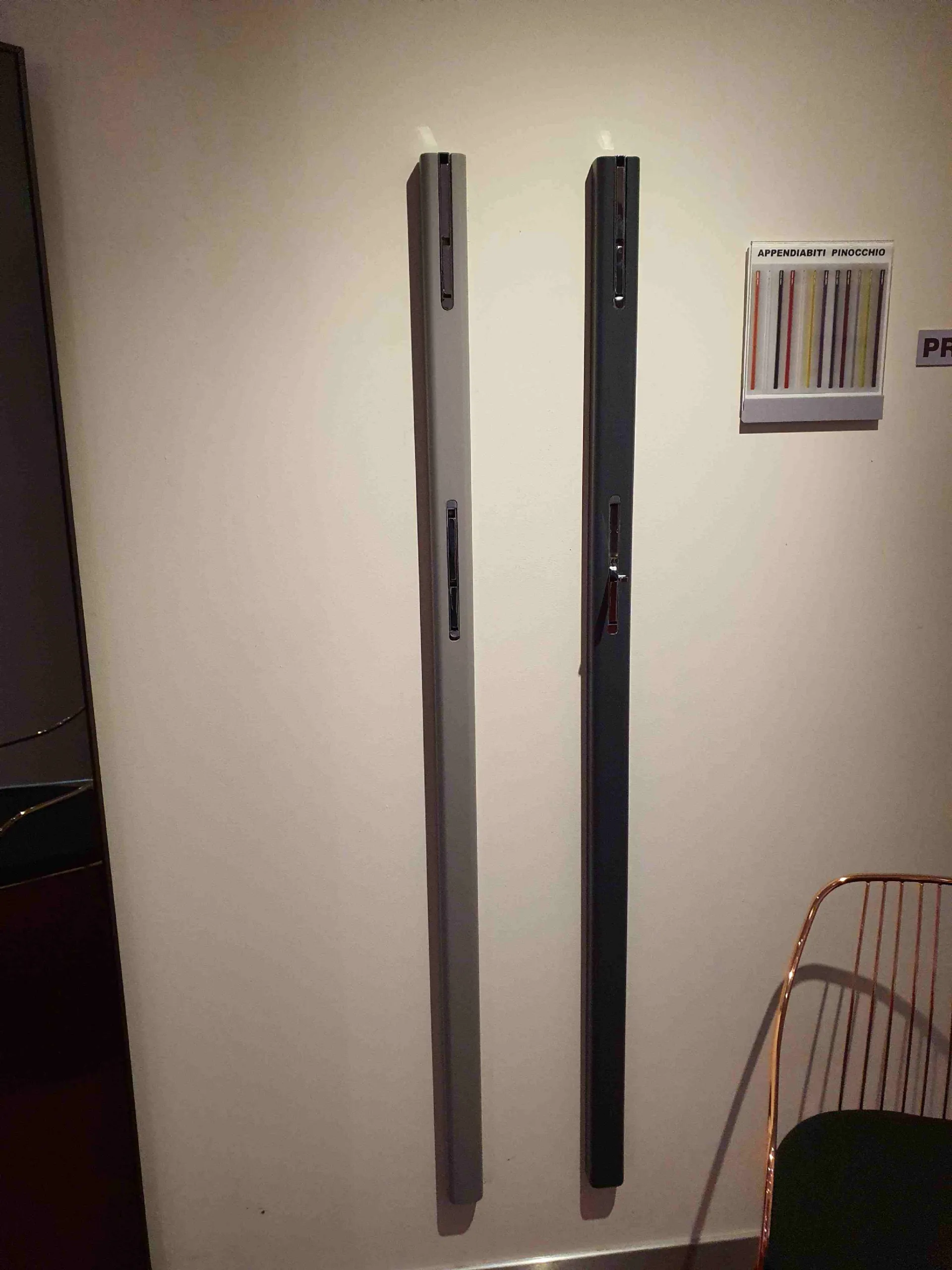 PINOCCHIO clothes rail in matt WHITE lacquer and TITANIUM lacquer with double hook. Design solution that allows a comfortable and practical support for clothes, bags, shoes, hats both at the entrance of the house but also in other areas such as hallways, bedrooms and double rooms Può ; be painted in any color and finish of your choice to better adapt to the surrounding environment when not needed the hooks close again total measurements: cm. L.6xProf.4xH.160