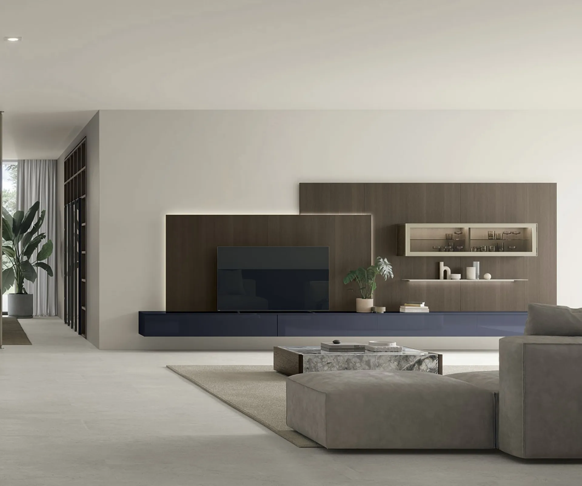 This wall unit is one of the solutions from the brand and will allow you to furnish the living room according to your specific housing needs. Through a dynamic interplay of combinations between open shelving and closed compartments, modern wall units decorate the living room by enhancing every space. Wall units have gained an important place in the living area of our homes: they are multifunctional and space-saving furniture always customizable.