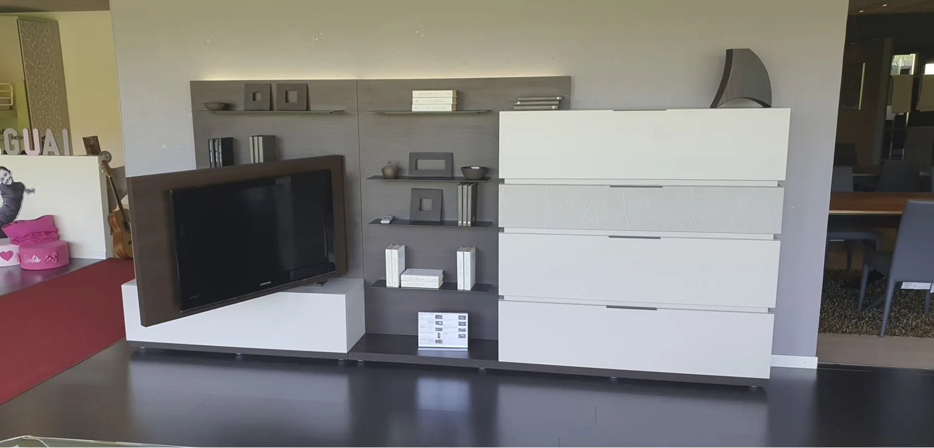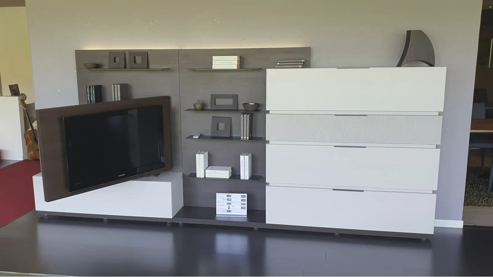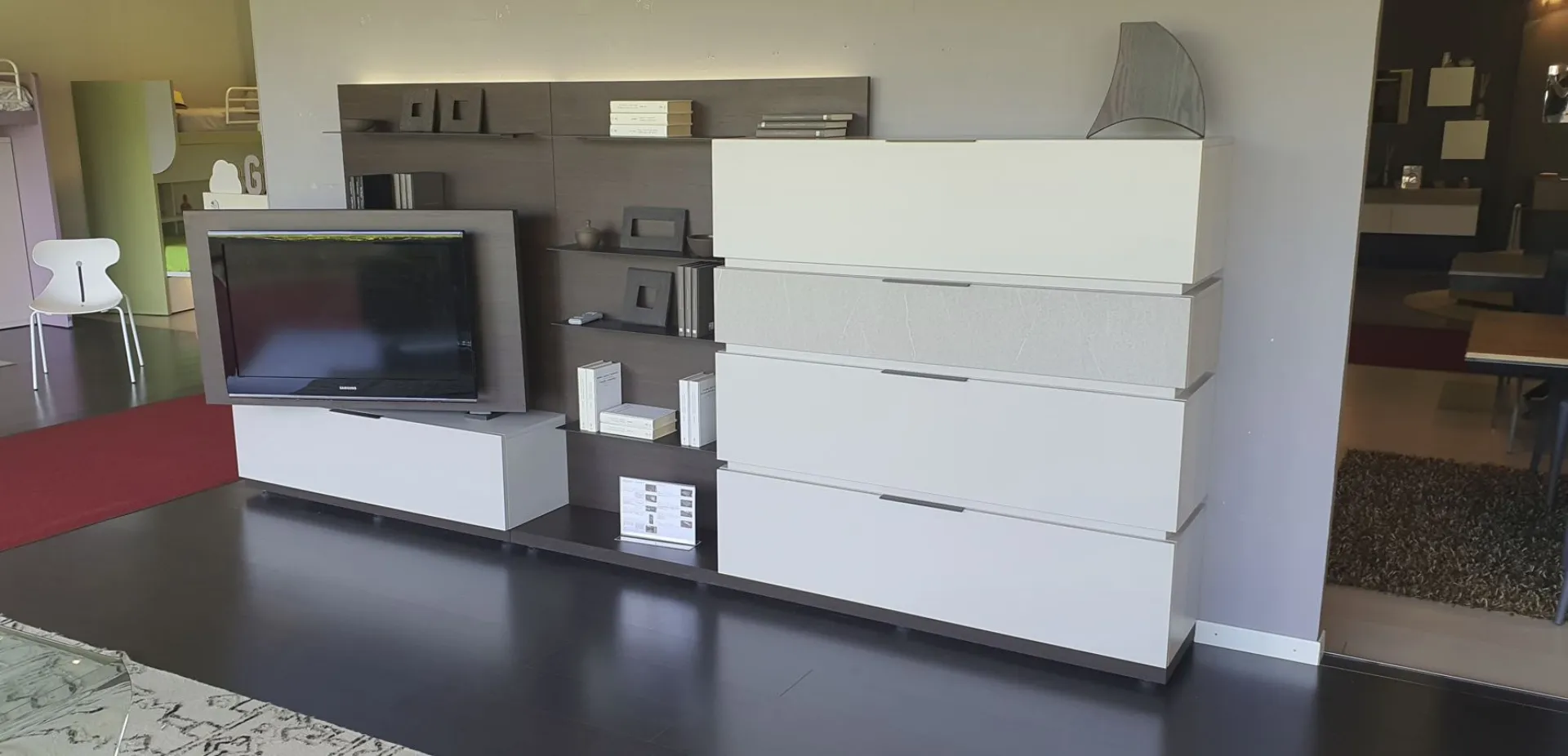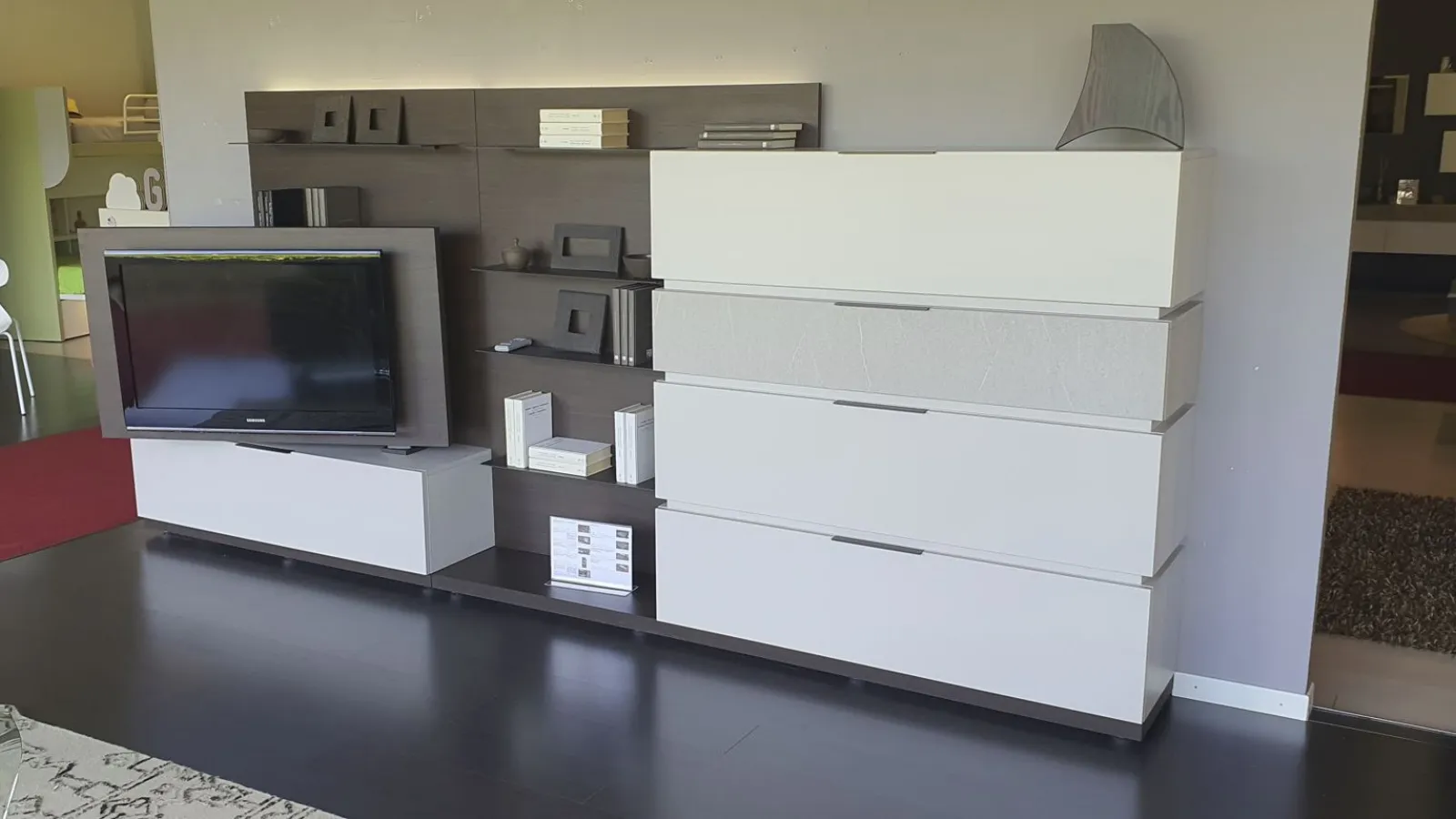 With the new Space è system; It is possible to design your own space starting from a platform base, overlapping the containers, choosing più finishes and integrating other elements and lights. Versatile, beautiful to customize and easy to compose. In this composition 4 bases with basket, così, are positioned one above the other; to create an overlapping game thanks to different finishes. The rear panel in thermo-coated material finish envelops all the elements present and offers additional space thanks to the ultra-thin metal shelves embedded in it. There are LED lights behind the backrest. An exclusive advantage is offered by the Pivot TV stand. Thanks to a swivel support, the television changes orientation to always guarantee a perfect view, from any corner of the room. The finishes present in the composition are Materico Termocotto, Materico Piasentina, Materico Madreperla matte and Anthracite colored metal The total size è of cm L.378xP.40xH.166. E& # 39; it is possible to configure the equipped wall according to the measurements of your wall and è It is also possible to vary the finishes.