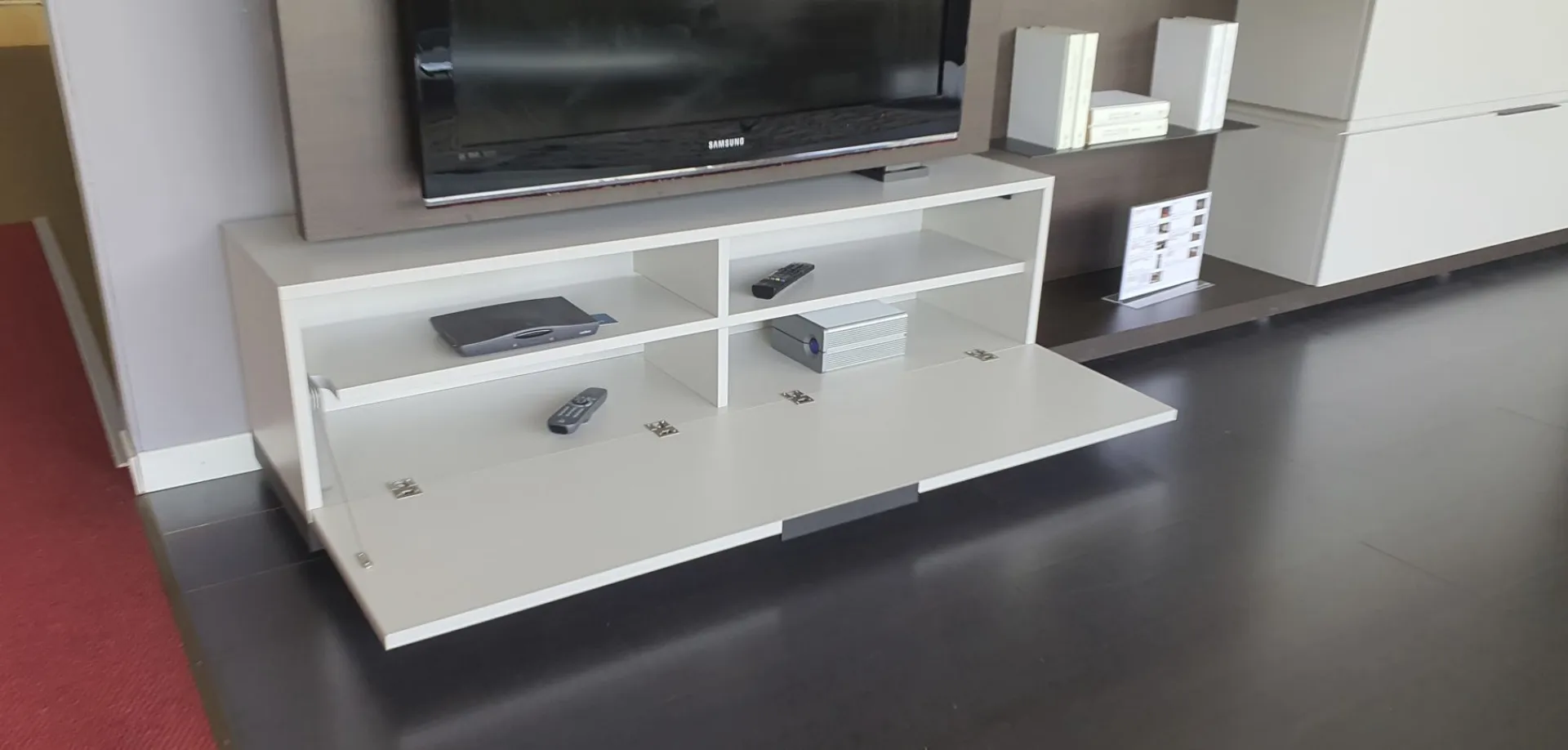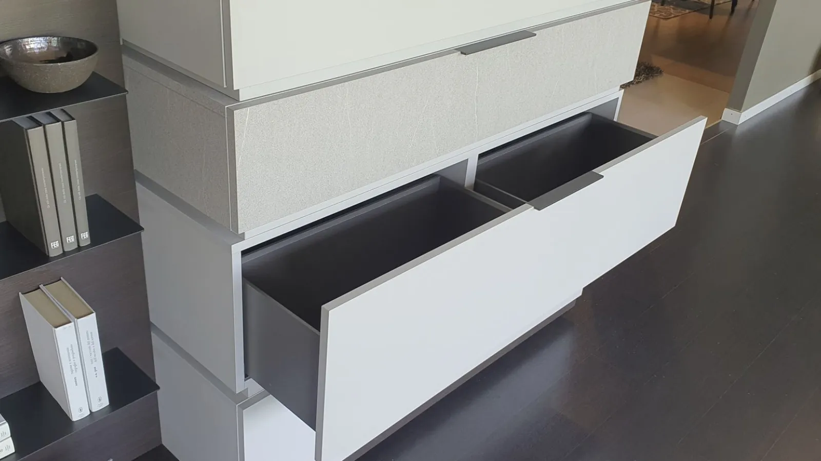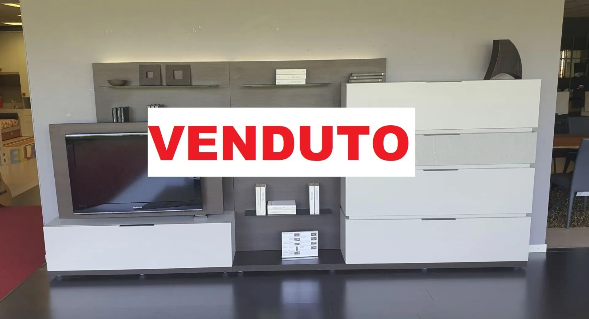 With the new Space è system; It is possible to design your own space starting from a platform base, overlapping the containers, choosing più finishes and integrating other elements and lights. Versatile, beautiful to customize and easy to compose. In this composition 4 bases with basket, così, are positioned one above the other; to create an overlapping game thanks to different finishes. The rear panel in thermo-coated material finish envelops all the elements present and offers additional space thanks to the ultra-thin metal shelves embedded in it. There are LED lights behind the backrest. An exclusive advantage is offered by the Pivot TV stand. Thanks to a swivel support, the television changes orientation to always guarantee a perfect view, from any corner of the room. The finishes present in the composition are Materico Termocotto, Materico Piasentina, Materico Madreperla matte and Anthracite colored metal The total size è of cm L.378xP.40xH.166. E& # 39; it is possible to configure the equipped wall according to the measurements of your wall and è It is also possible to vary the finishes.