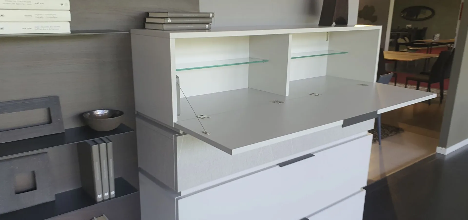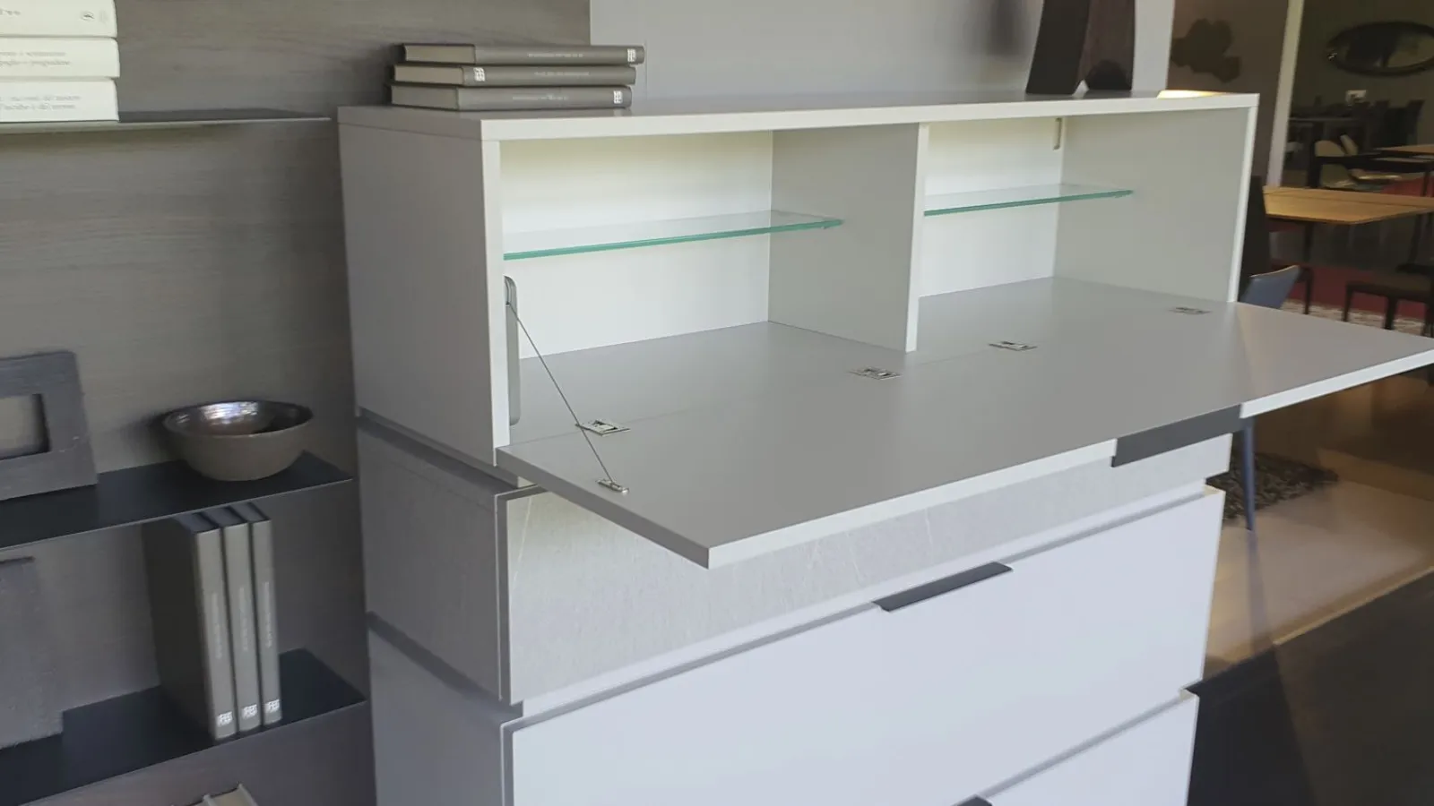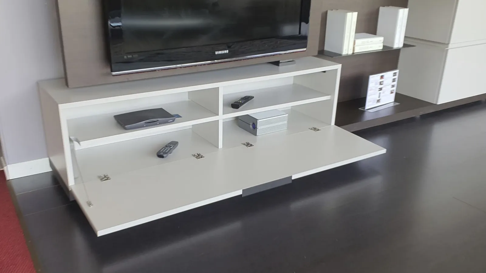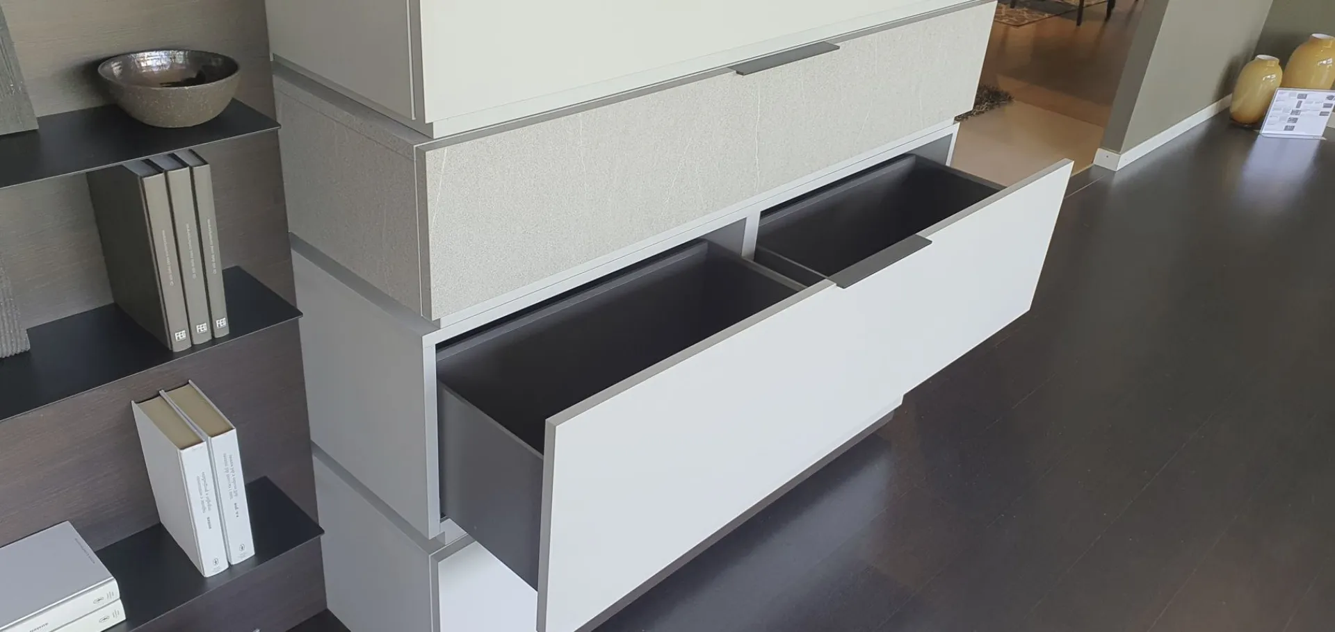 With the new Space è system; It is possible to design your own space starting from a platform base, overlapping the containers, choosing più finishes and integrating other elements and lights. Versatile, beautiful to customize and easy to compose. In this composition 4 bases with basket, così, are positioned one above the other; to create an overlapping game thanks to different finishes. The rear panel in thermo-coated material finish envelops all the elements present and offers additional space thanks to the ultra-thin metal shelves embedded in it. There are LED lights behind the backrest. An exclusive advantage is offered by the Pivot TV stand. Thanks to a swivel support, the television changes orientation to always guarantee a perfect view, from any corner of the room. The finishes present in the composition are Materico Termocotto, Materico Piasentina, Materico Madreperla matte and Anthracite colored metal The total size è of cm L.378xP.40xH.166. E& # 39; it is possible to configure the equipped wall according to the measurements of your wall and è It is also possible to vary the finishes.
