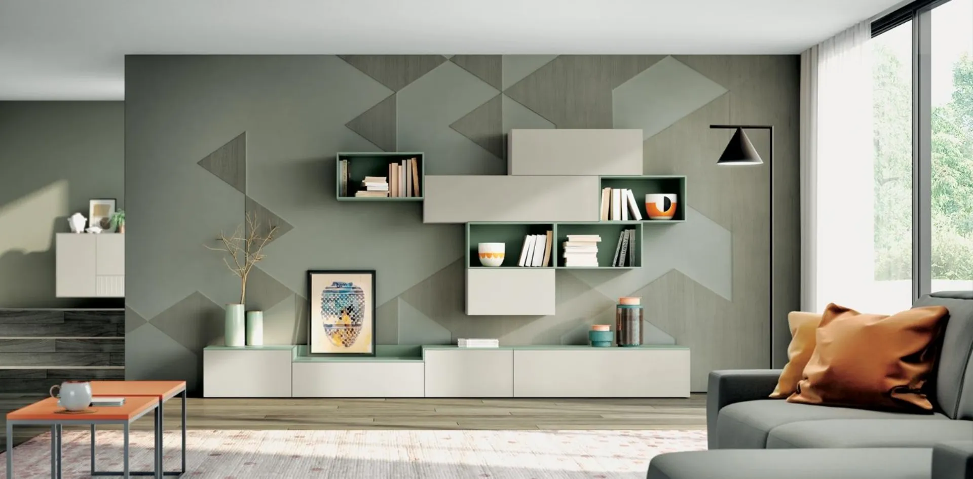 Living room furniture and modern equipped walls by Spagnol Mobili: discover the Living 810 model in matt lacquer shown in the photo