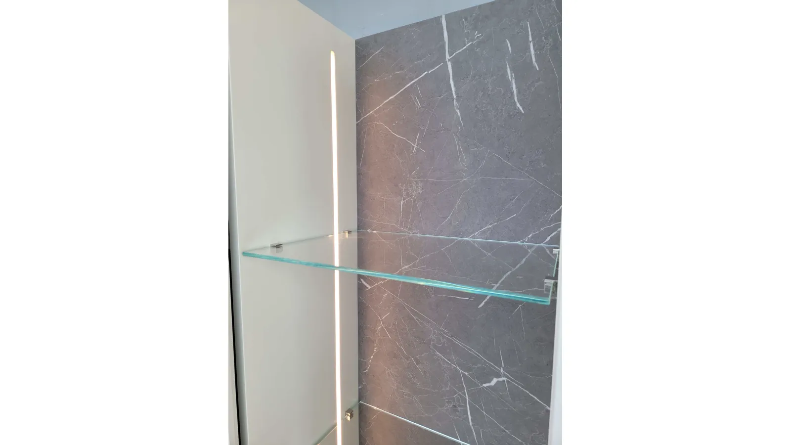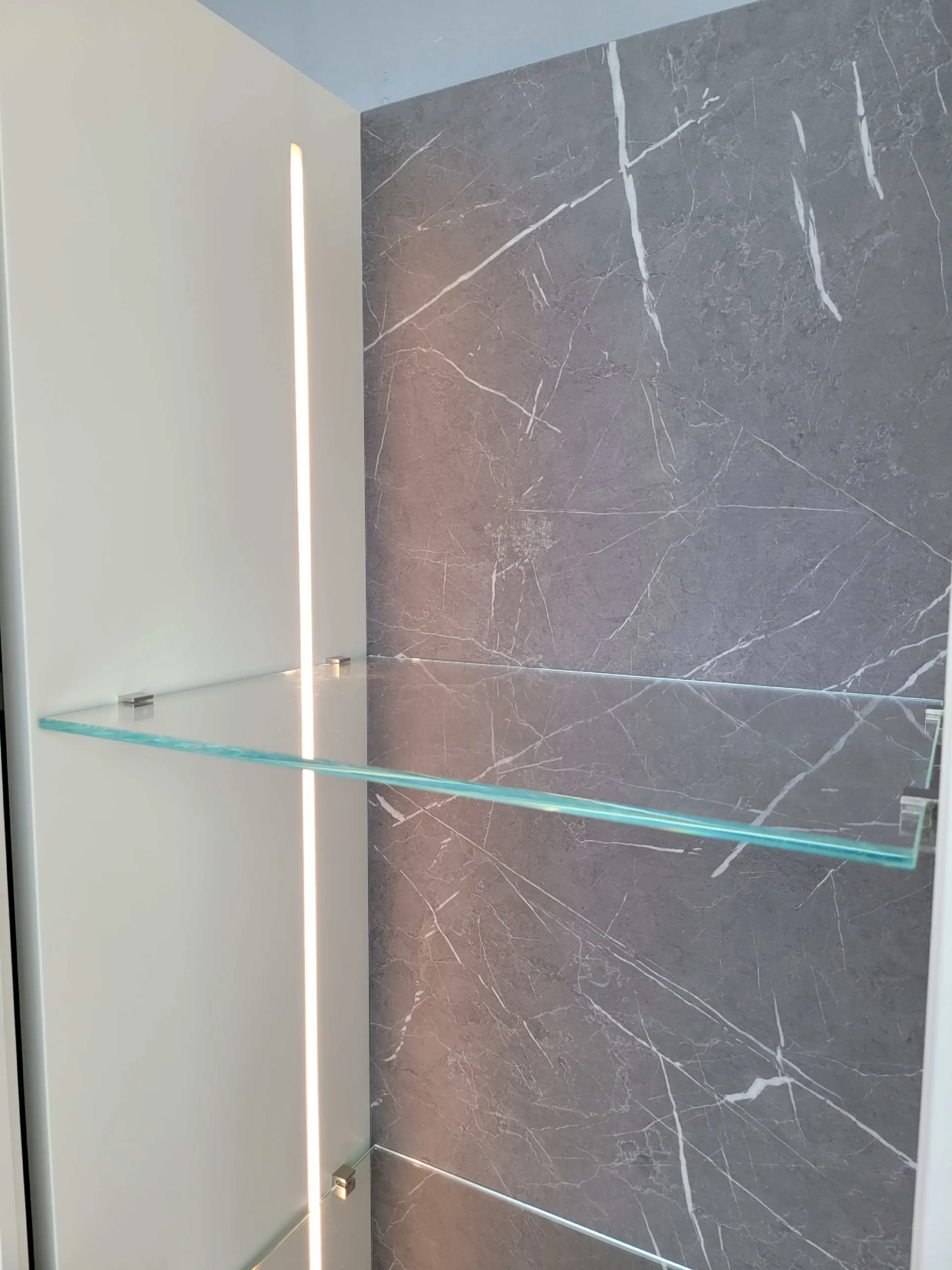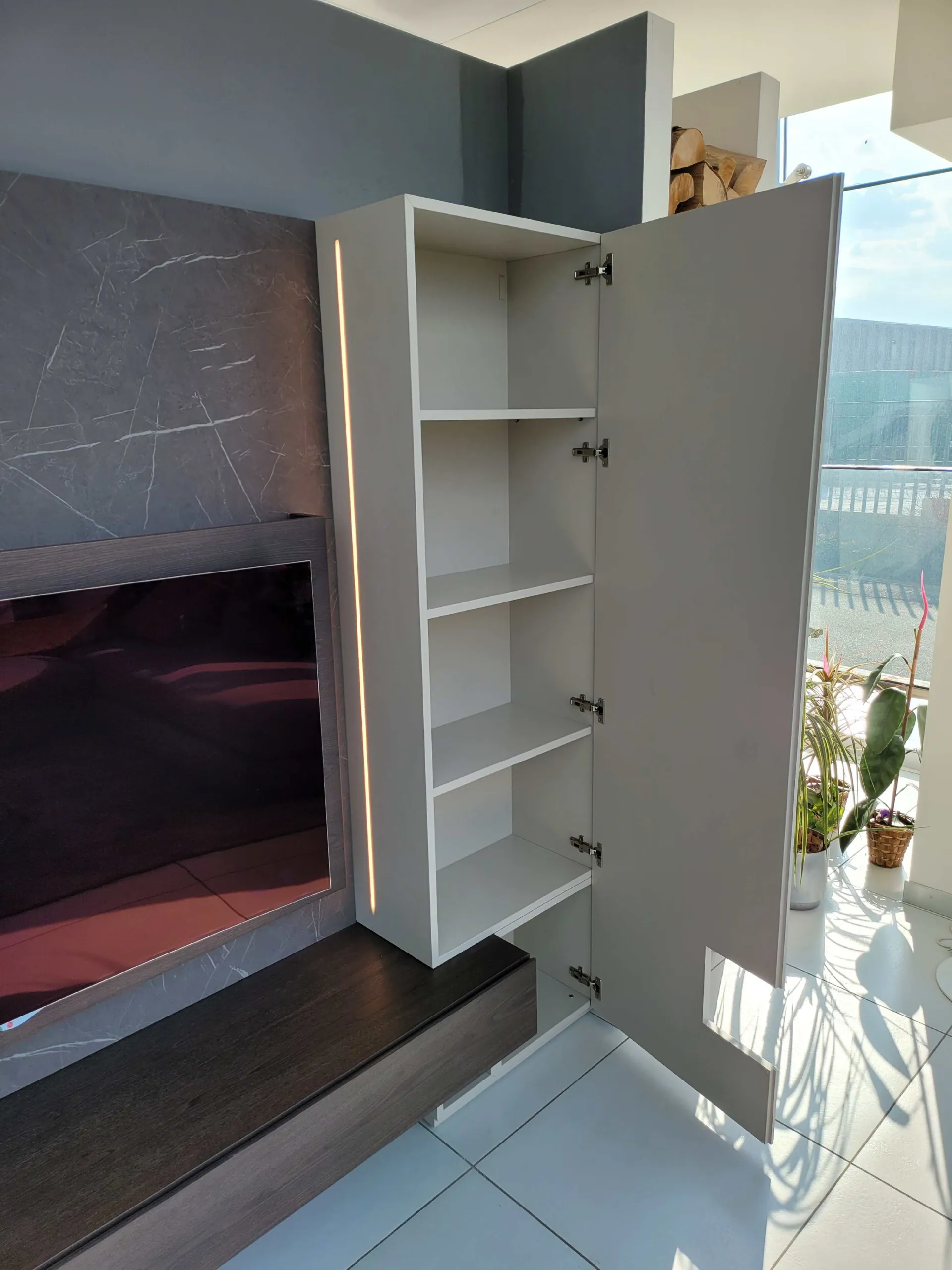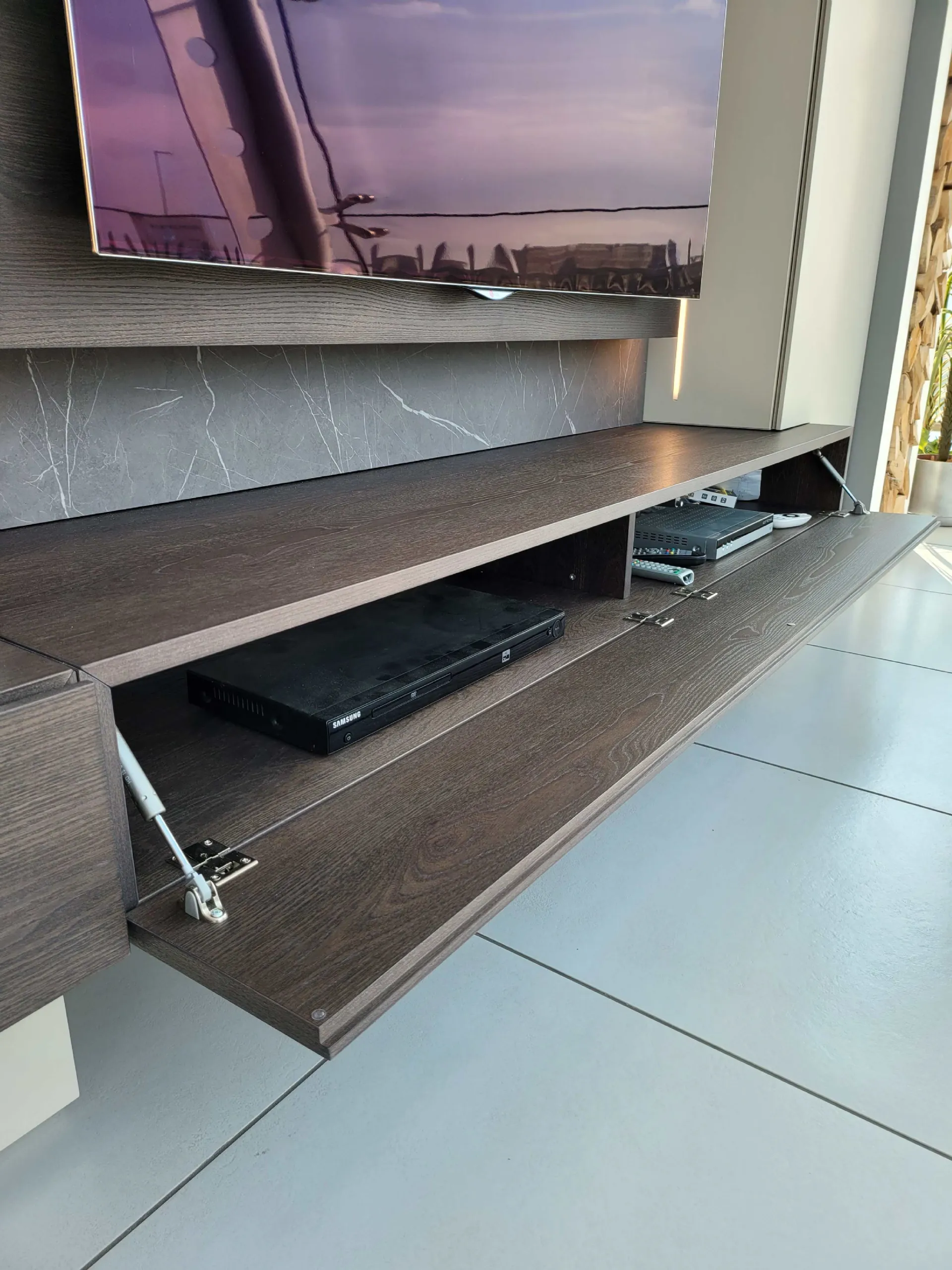 There are three elements on the ground with hinged door and internal shelves in transparent glass, very convenient for storing the necessary for the table or any other object. They are in CAPPUCCINO matt lacquer, a color that goes perfectly with the Autumn Elm essence finish of the two suspended drawers at the bottom. A further added value to the composition is given by the LED bars embedded in the sides of the elements with doors that illuminate the back in HPL with a gray marble finish.