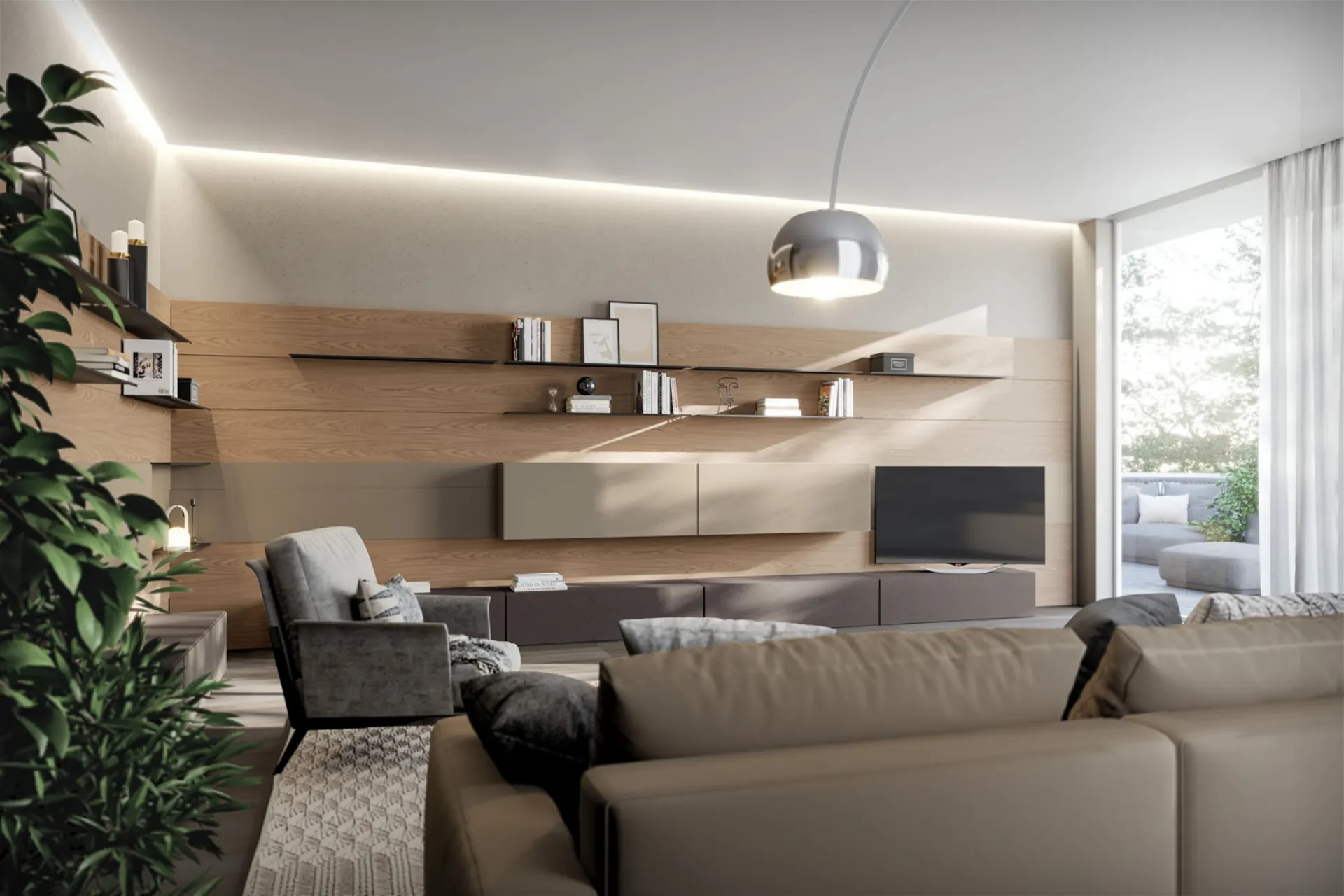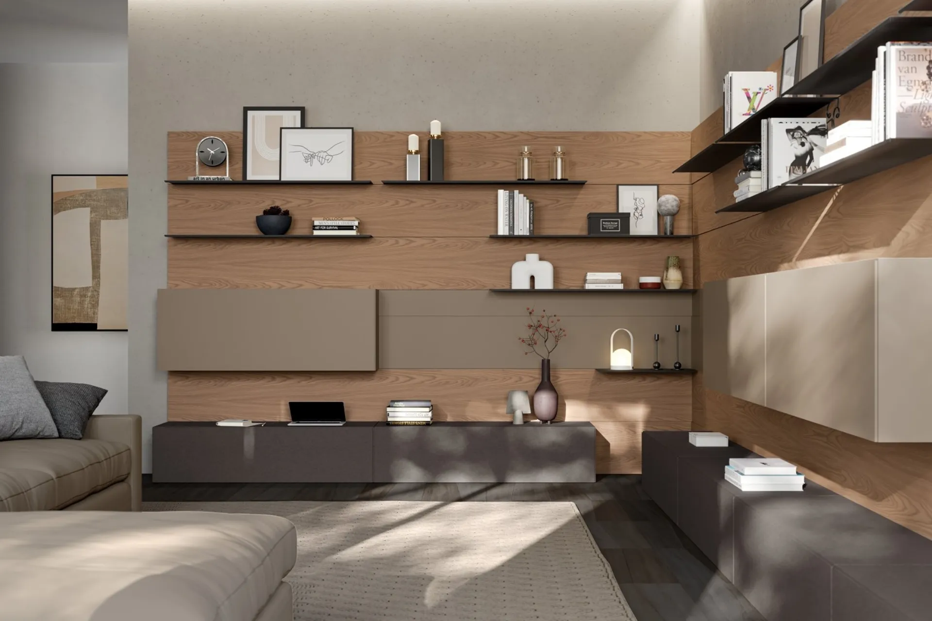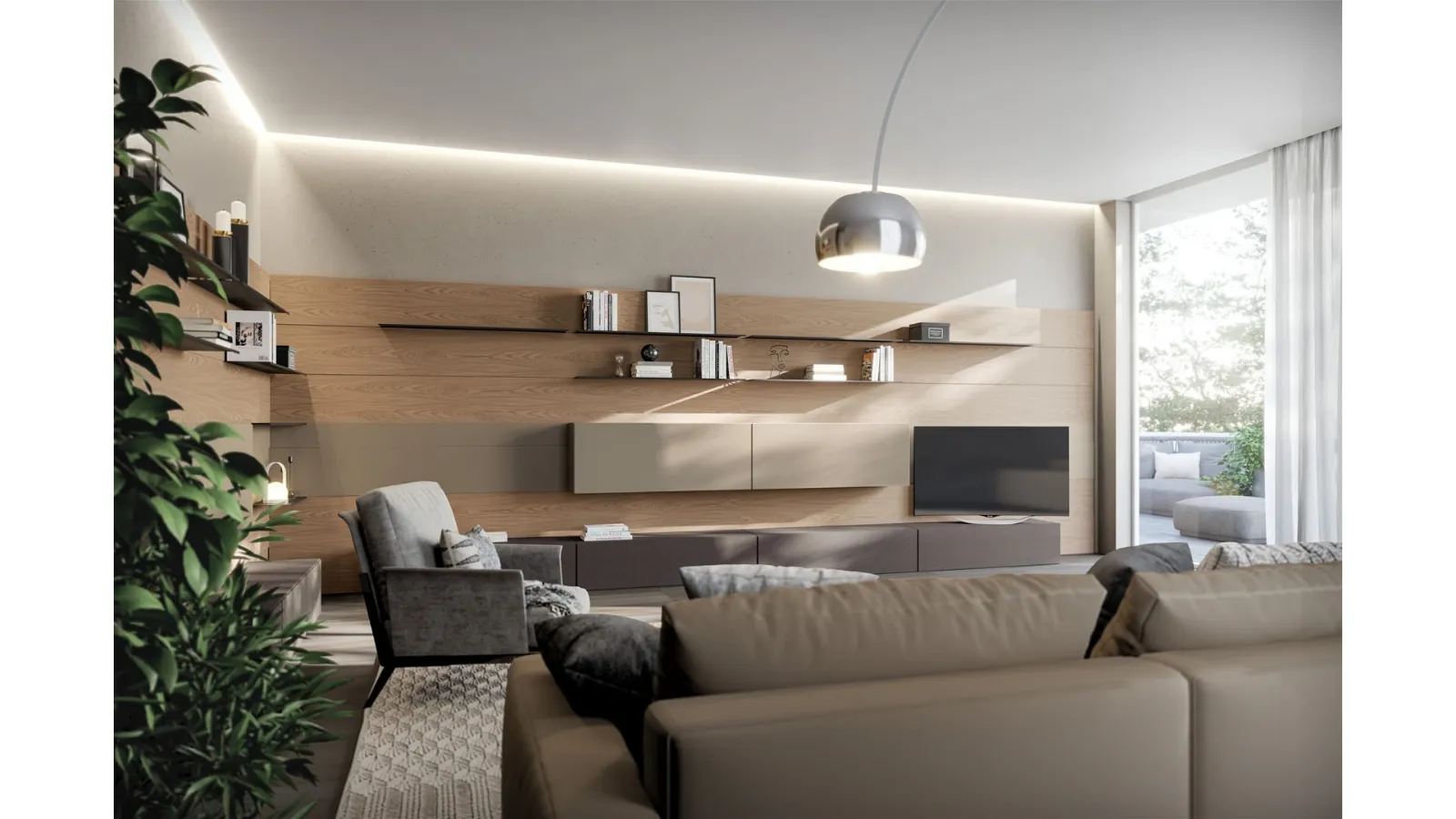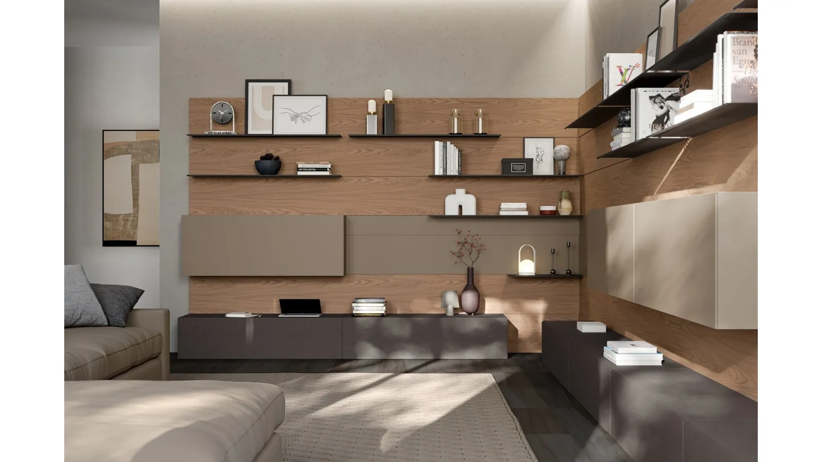Furnishings for the living area and modern Fimar Equipped Walls: discover the Rebel Living 09 model in matt lacquer shown in the photo