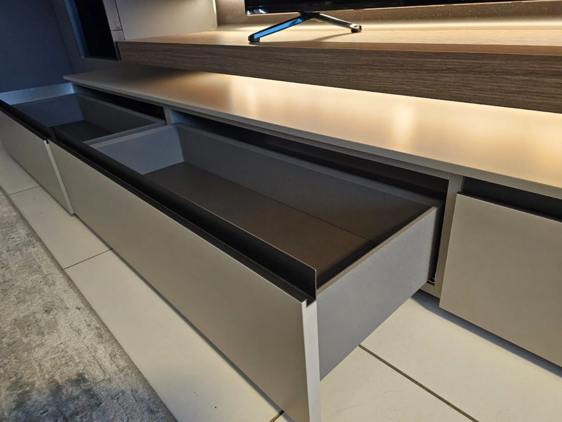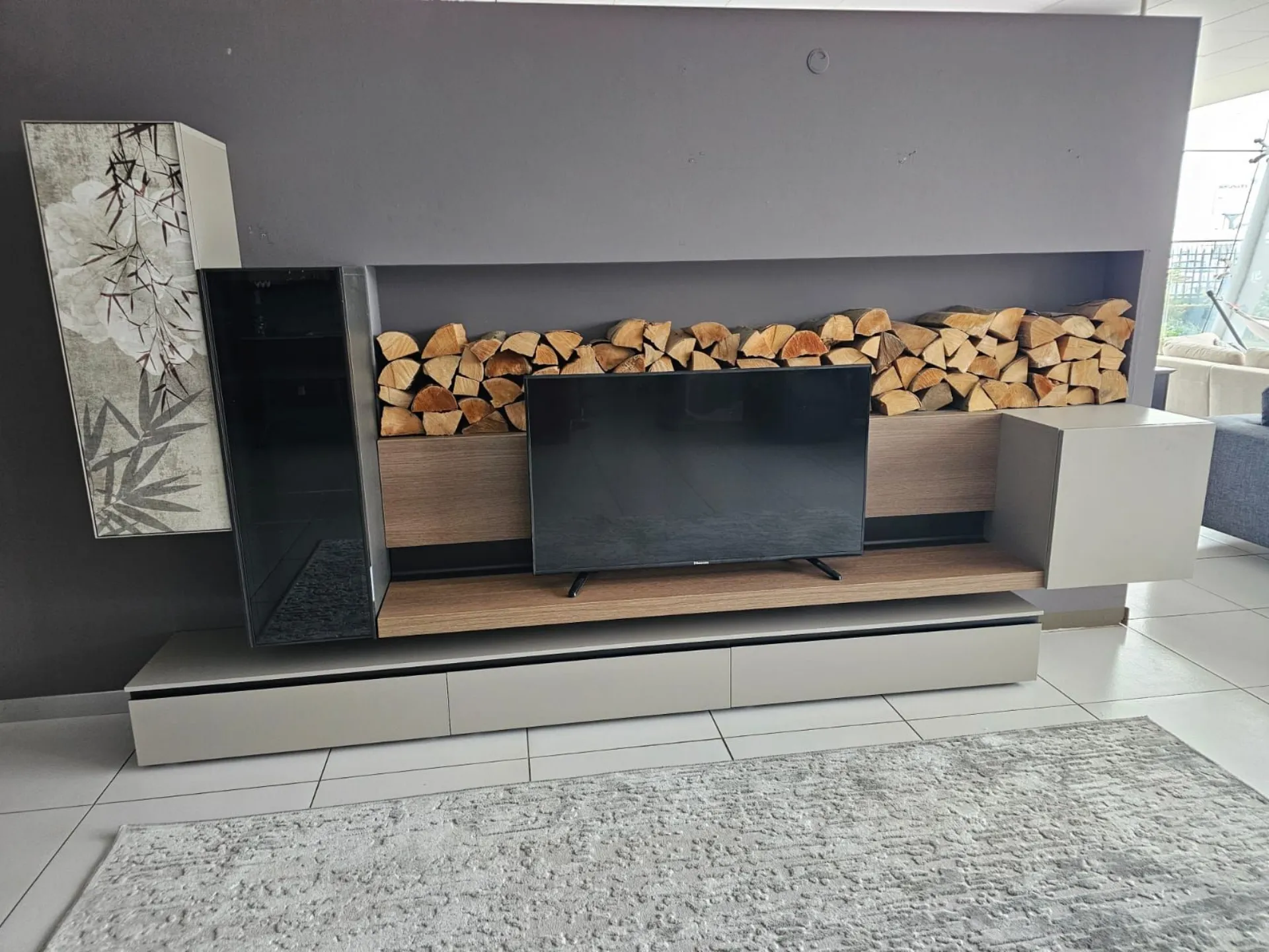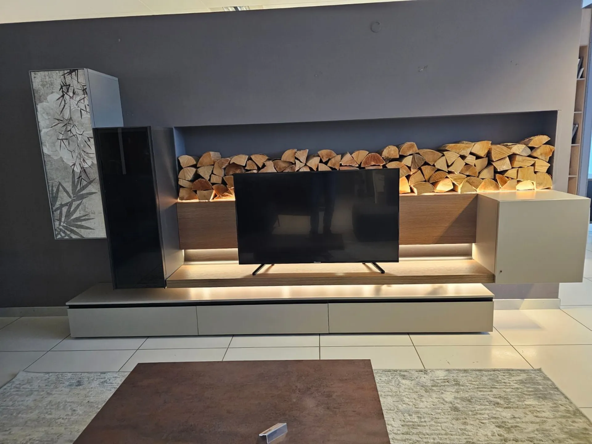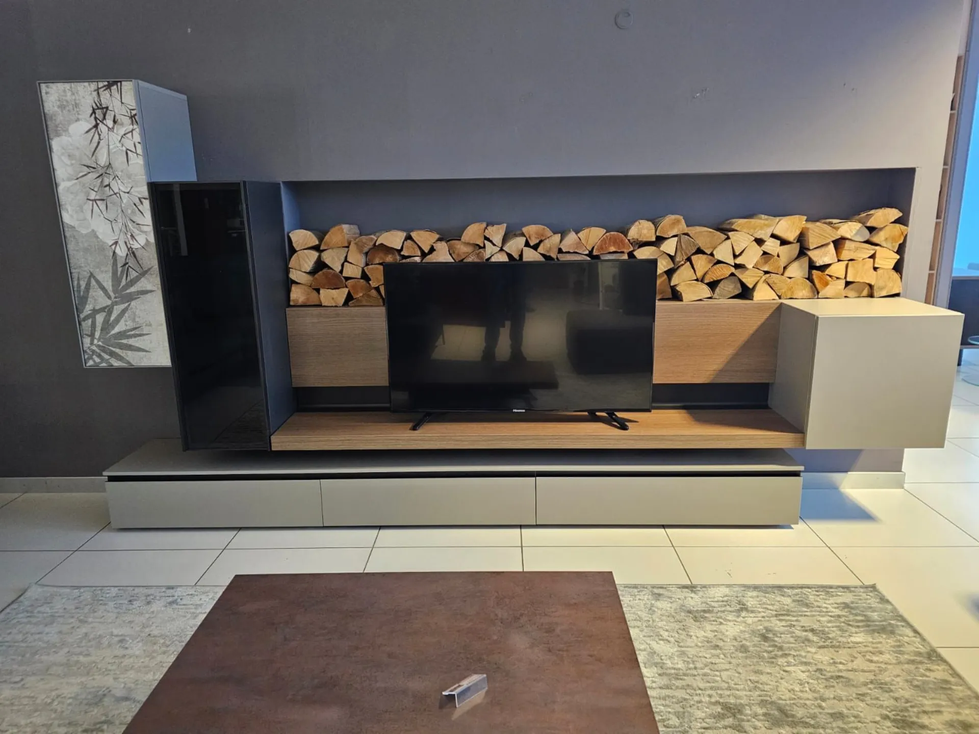SHIRO living room unit measuring approximately L.342xP.40xH.180 cm in textured arena, anthracite, and cognac oak finish. The drawers feature full extension guides with opening through integrated metal grooves. The wall units have smoked glass framed doors with an oriental-style design. The living room unit comes complete with lights. Display product available for immediate delivery! Contact us for more information.