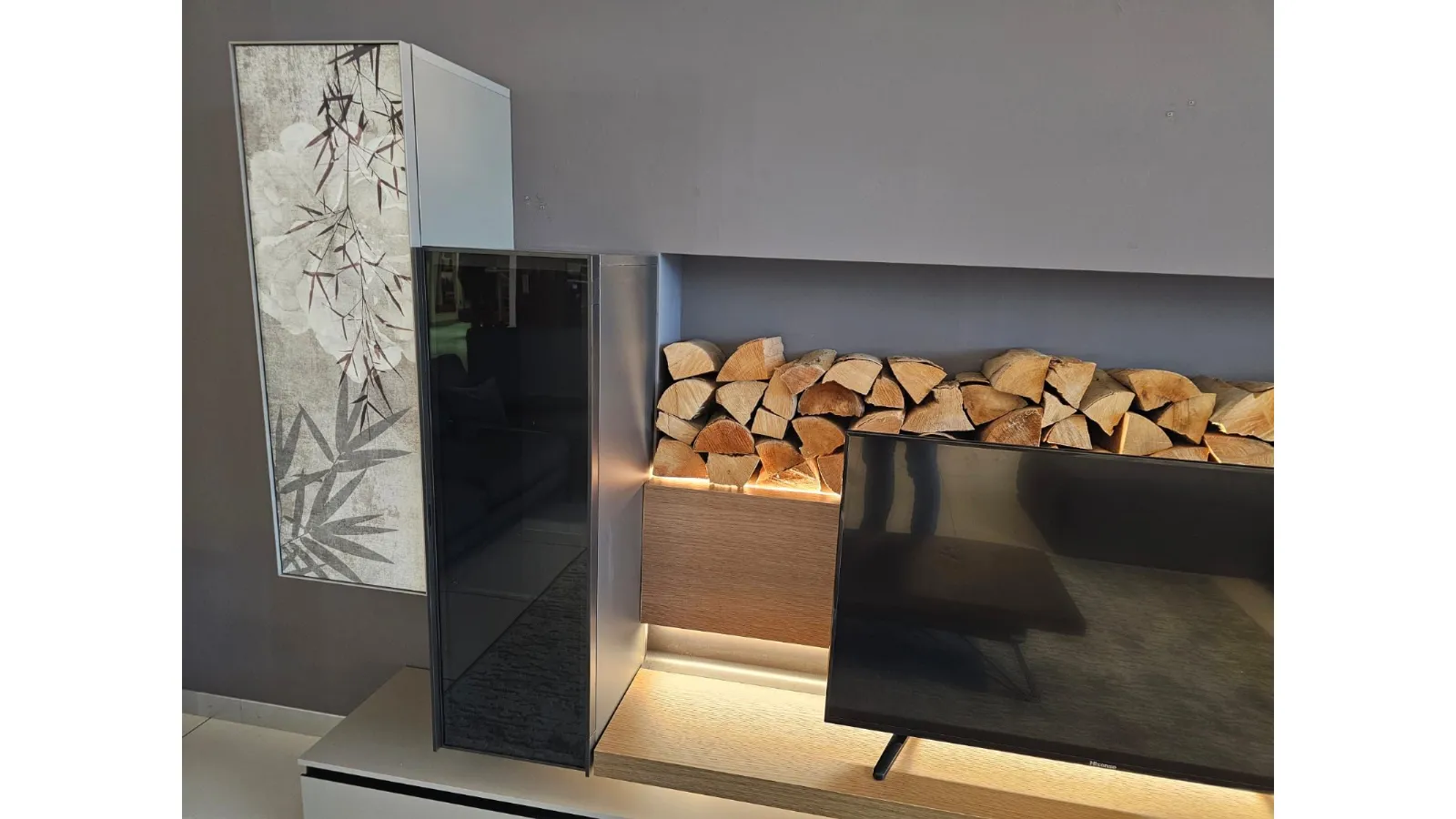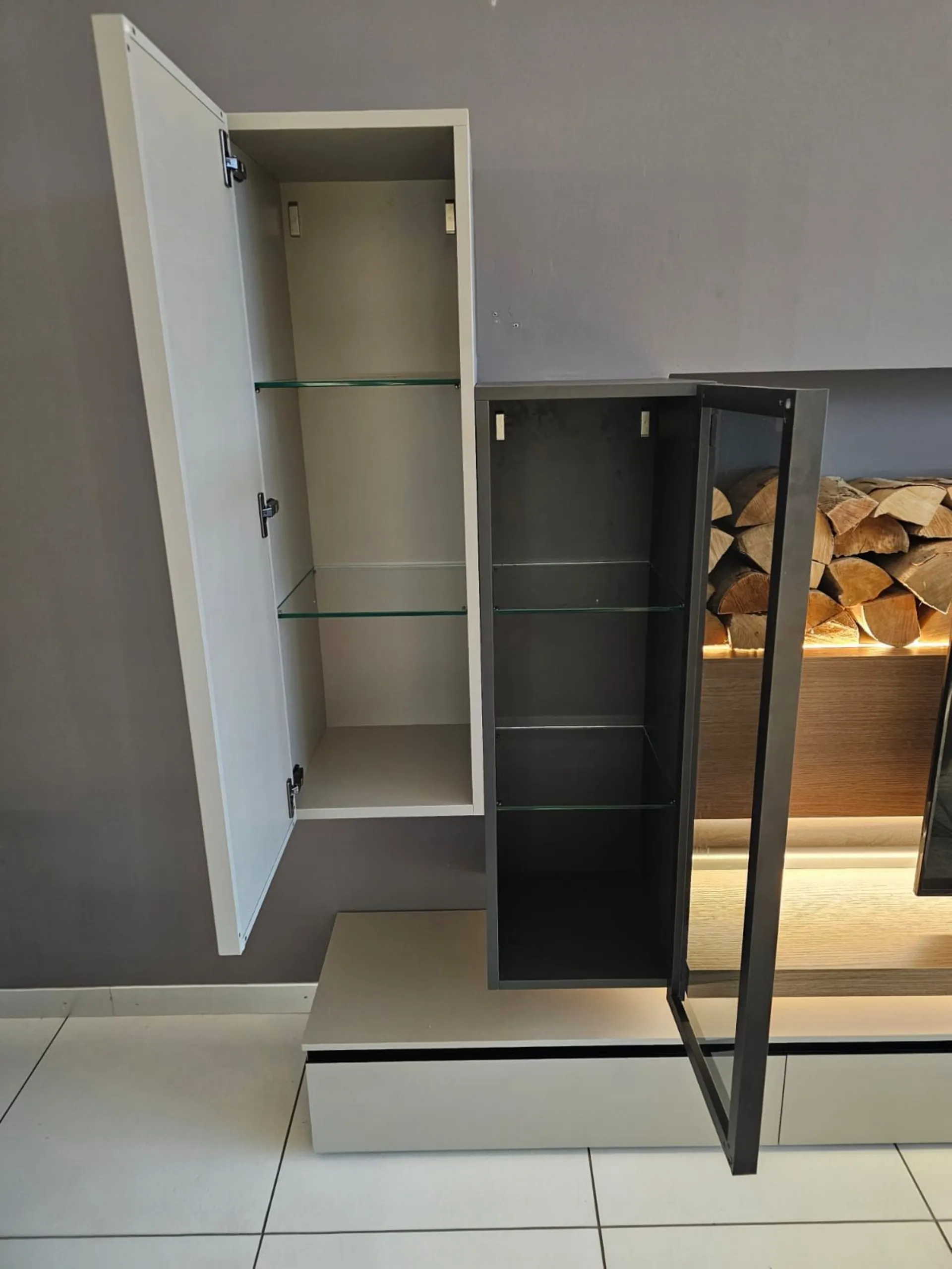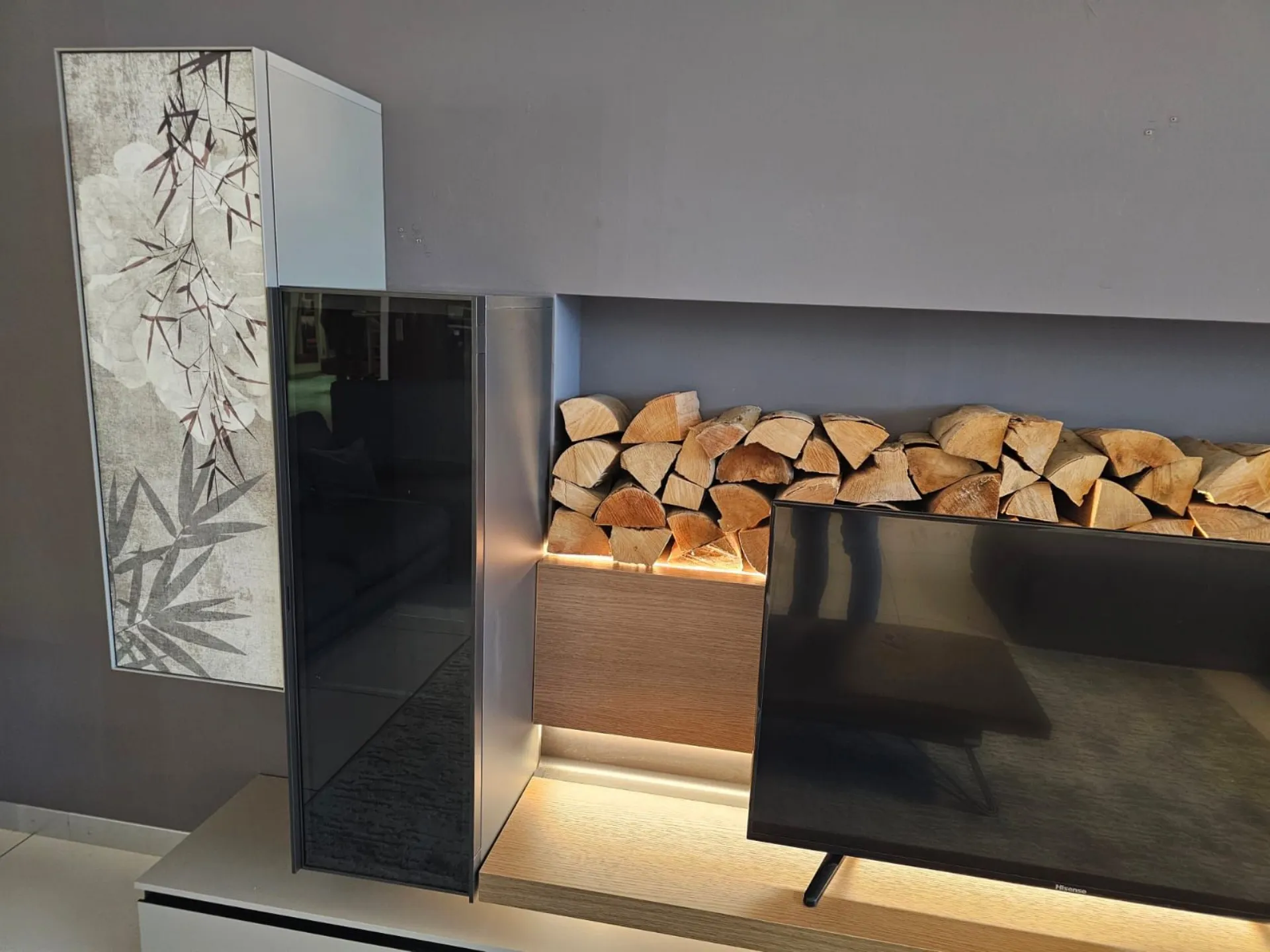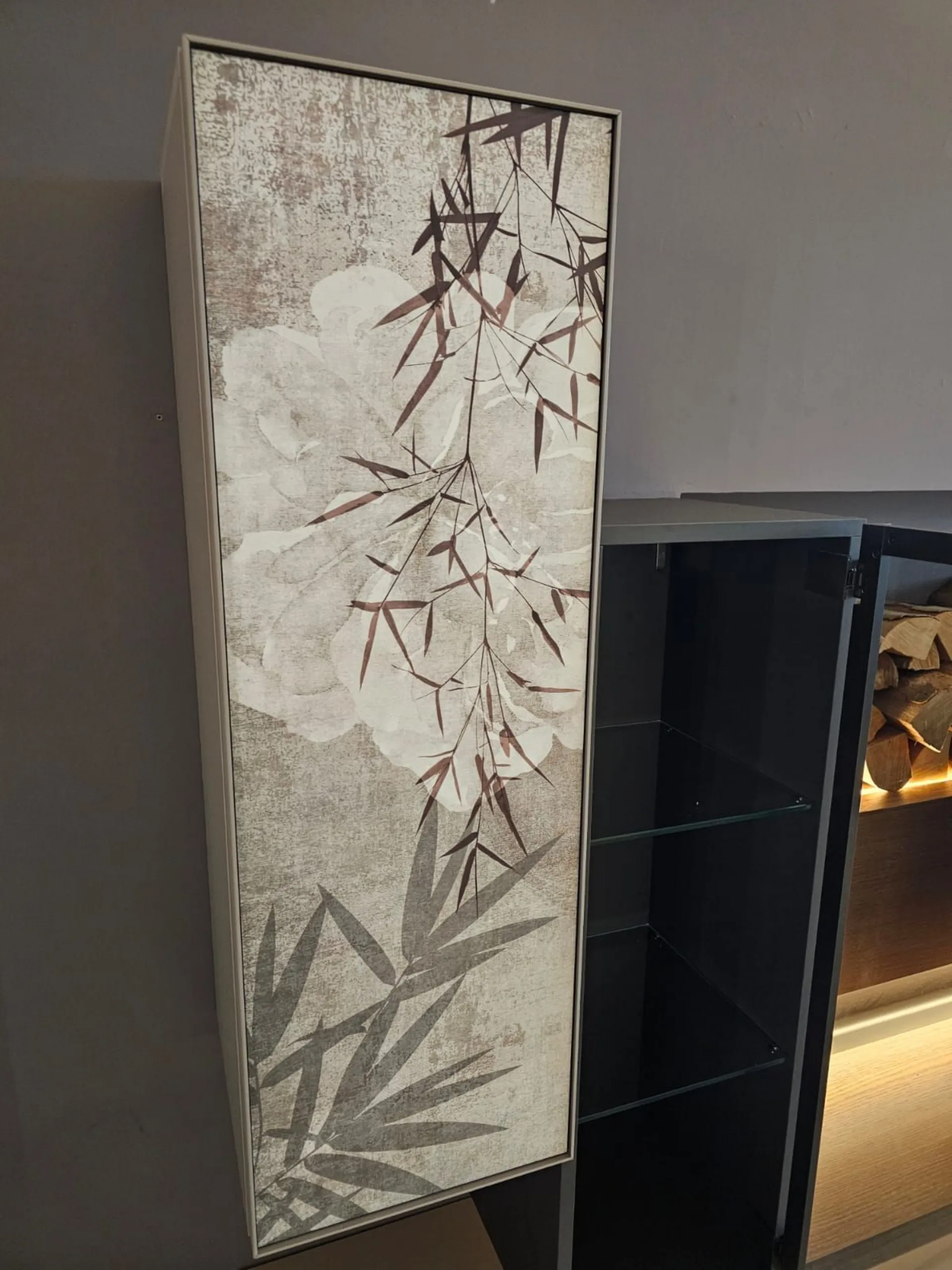 SHIRO living room unit measuring approximately L.342xP.40xH.180 cm in textured arena, anthracite, and cognac oak finish. The drawers feature full extension guides with opening through integrated metal grooves. The wall units have smoked glass framed doors with an oriental-style design. The living room unit comes complete with lights. Display product available for immediate delivery! Contact us for more information.