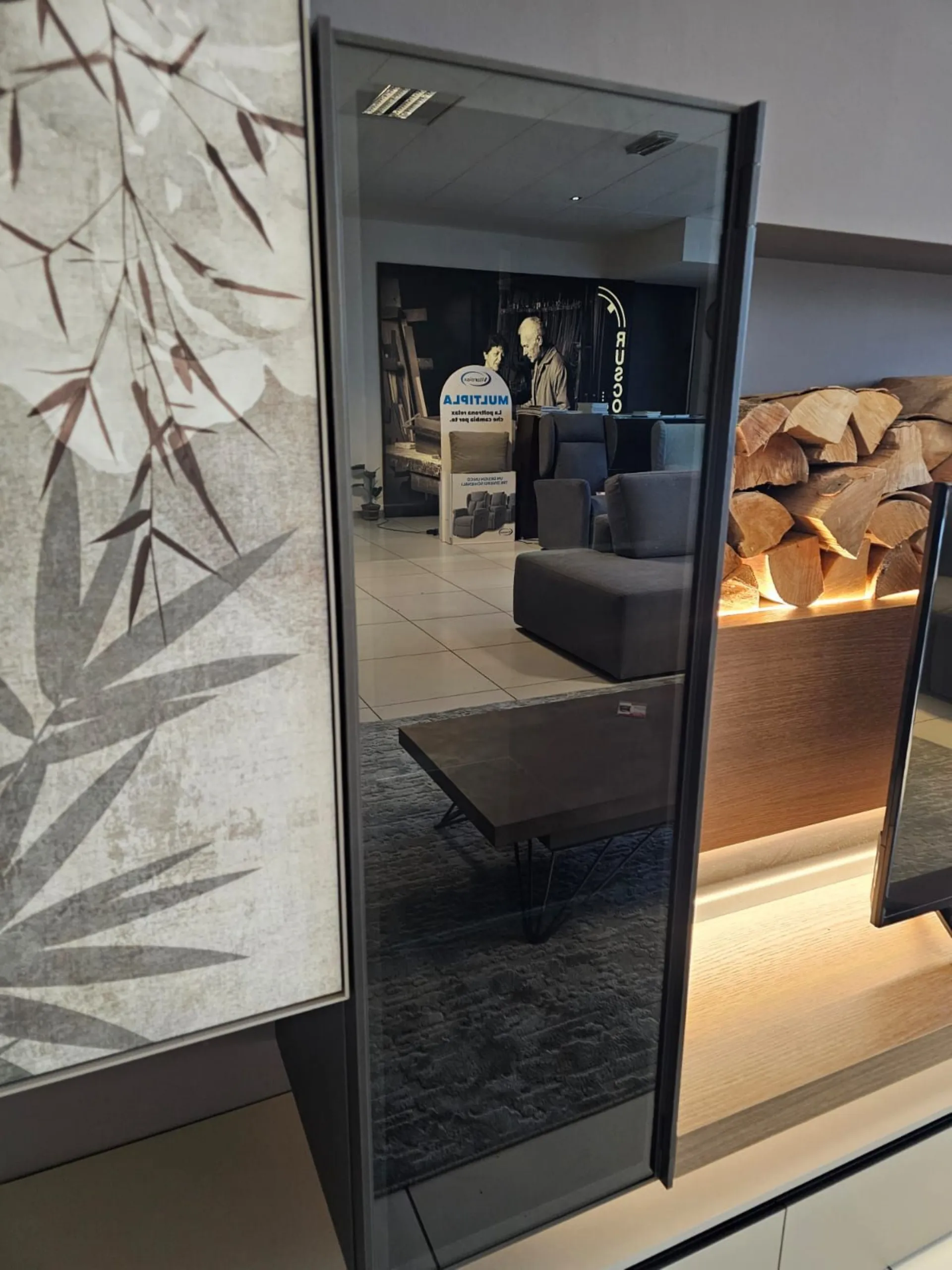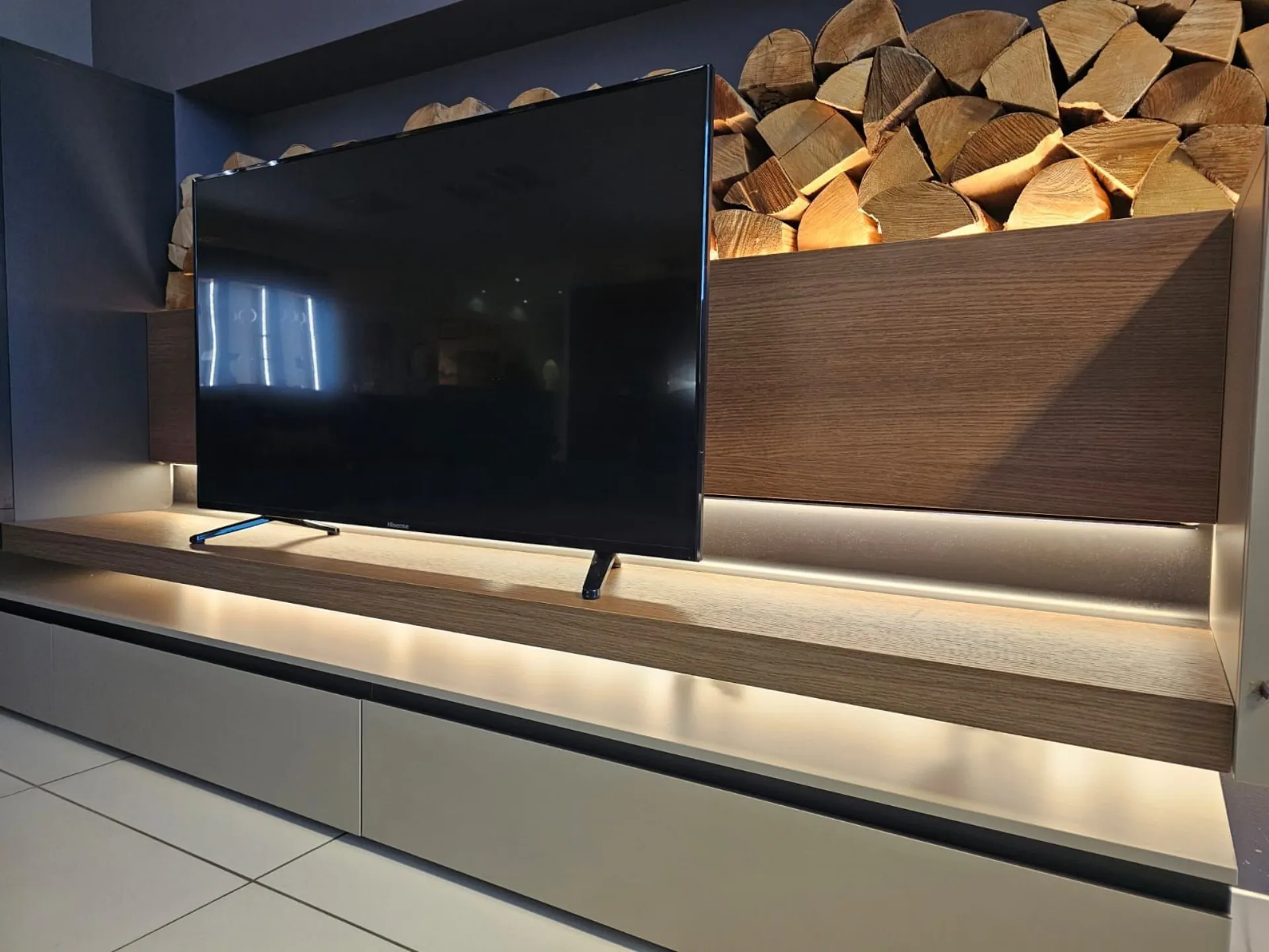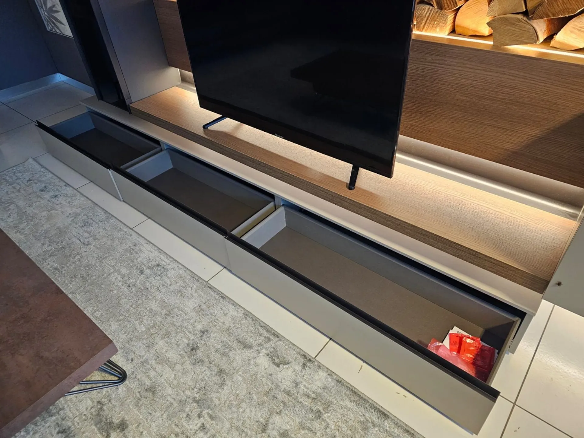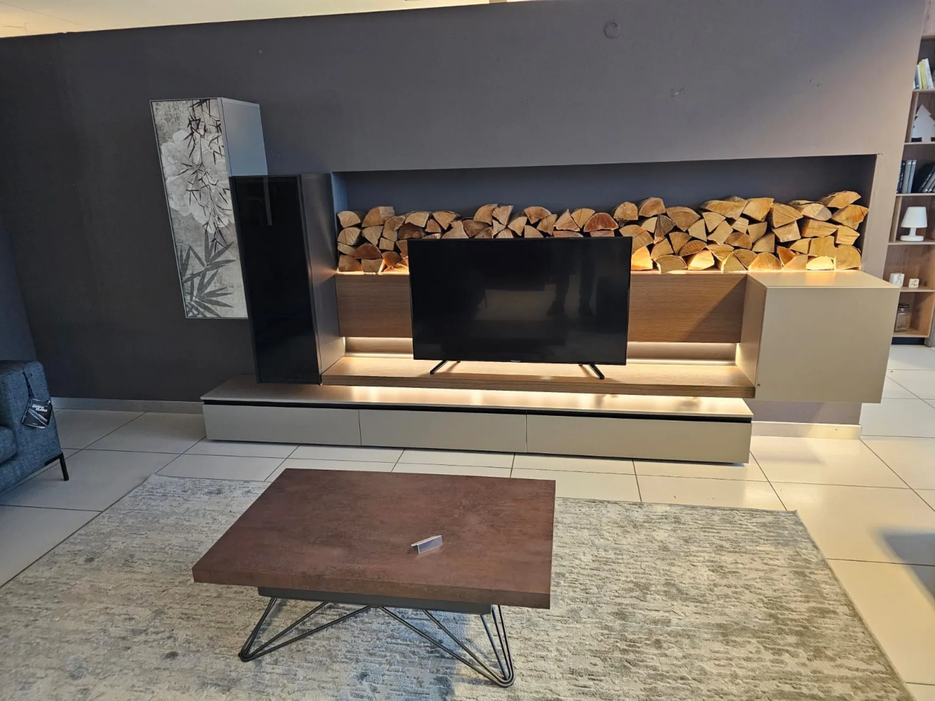 SHIRO living room unit measuring approximately L.342xP.40xH.180 cm in textured arena, anthracite, and cognac oak finish. The drawers feature full extension guides with opening through integrated metal grooves. The wall units have smoked glass framed doors with an oriental-style design. The living room unit comes complete with lights. Display product available for immediate delivery! Contact us for more information.
