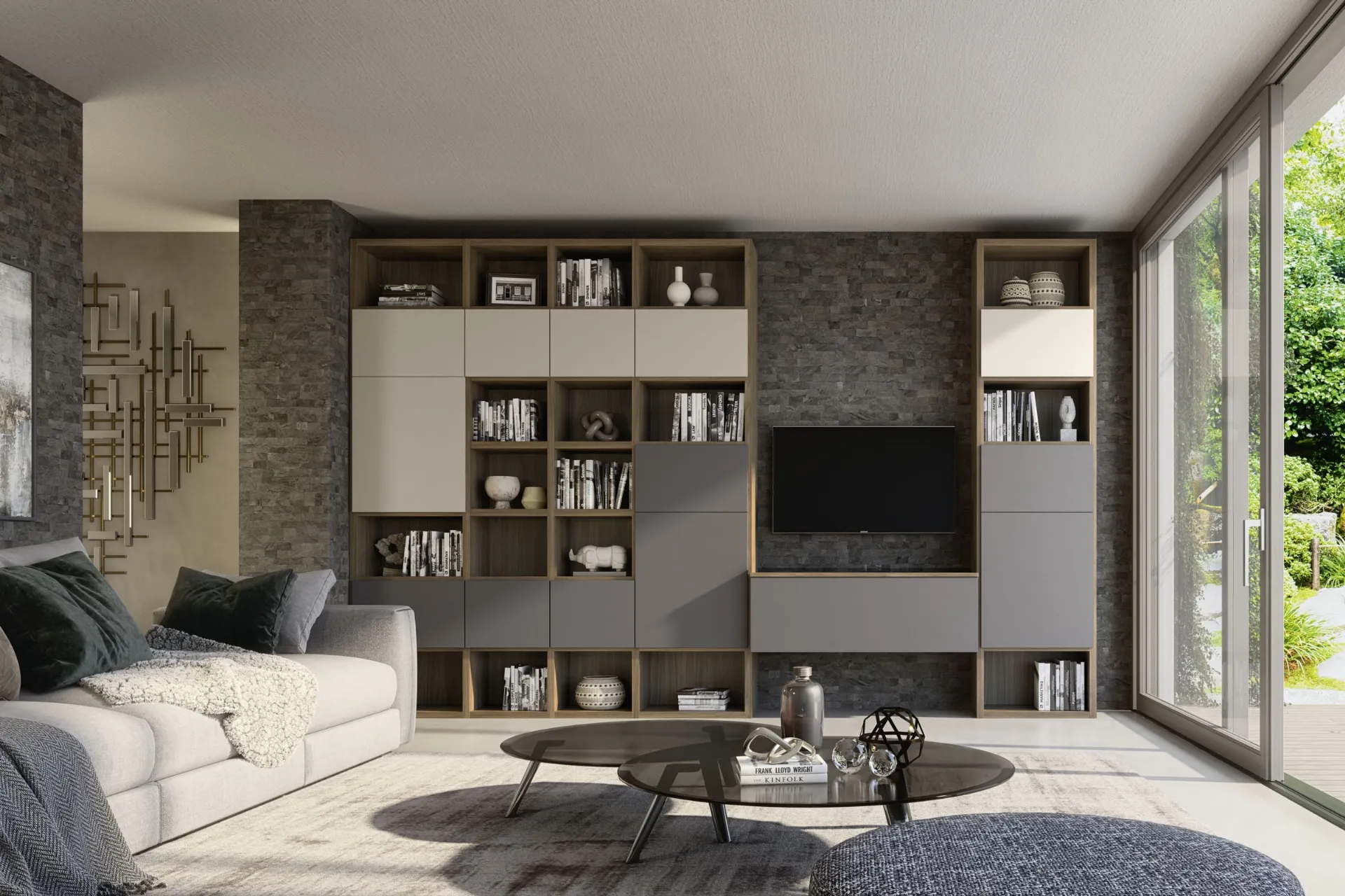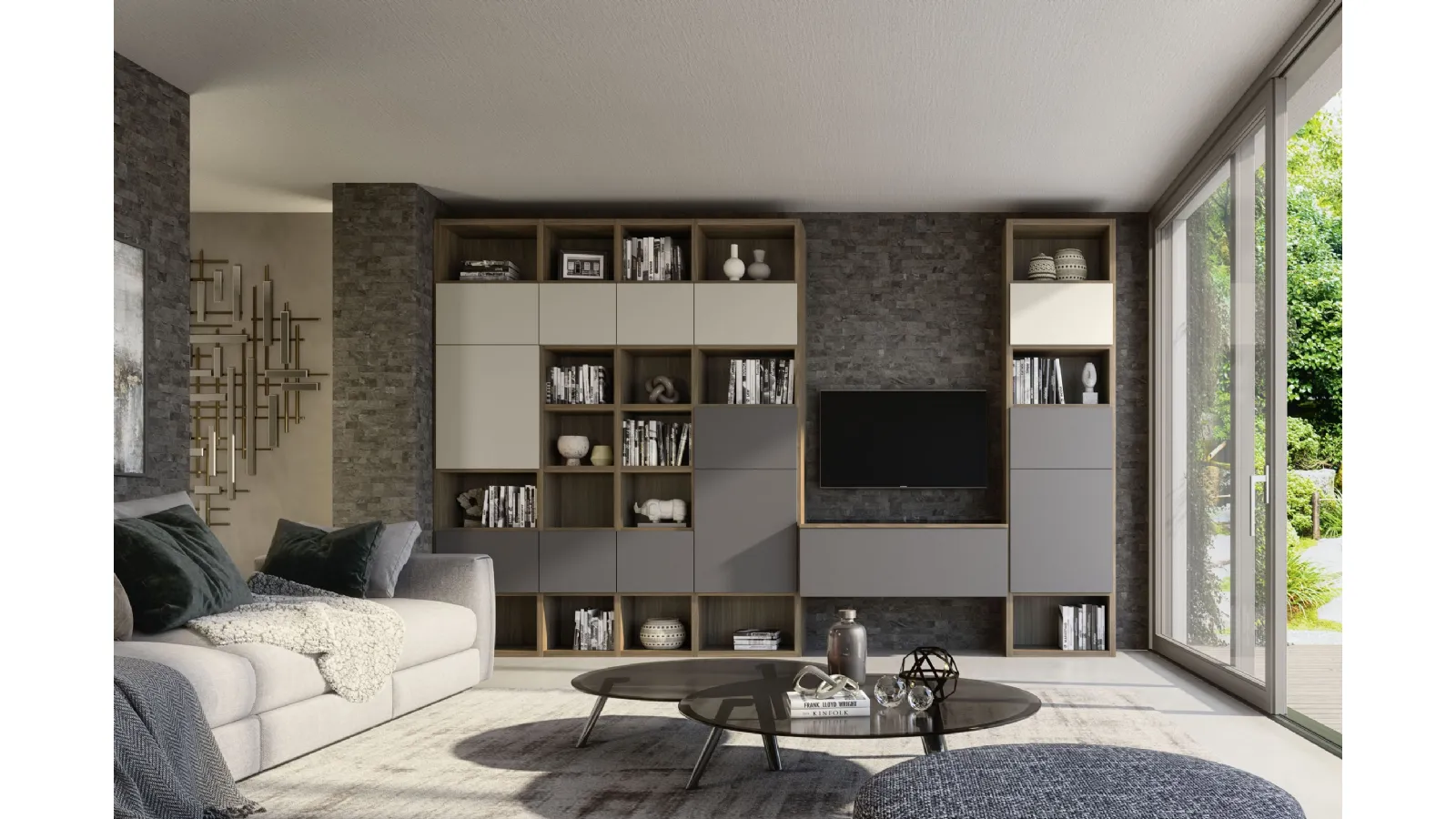 Discover one of the most original melamine solutions to furnish your living room with us: the Supreme Ingrid Walnut 01 equipped wall by S75.