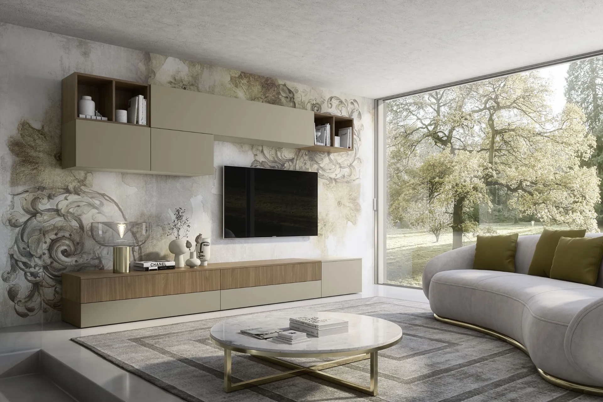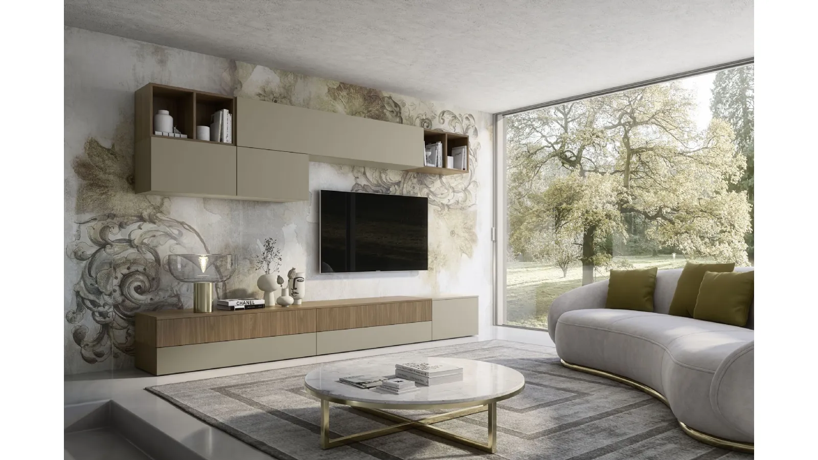 | Materiale: | Struttura in finitura Noce, Ante e frontali in tonalità Creta, Rovere fiammato “Poro Registro” |